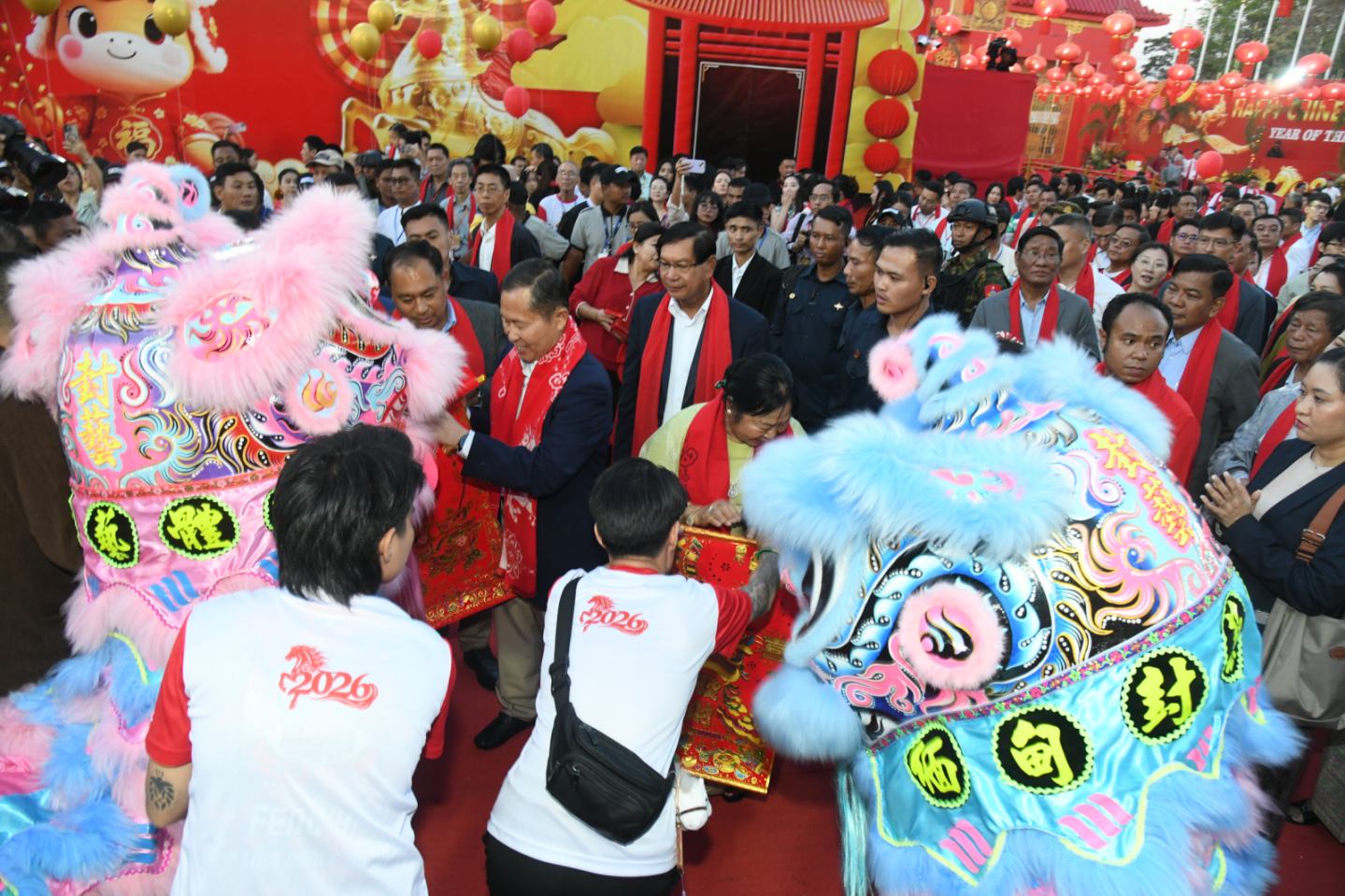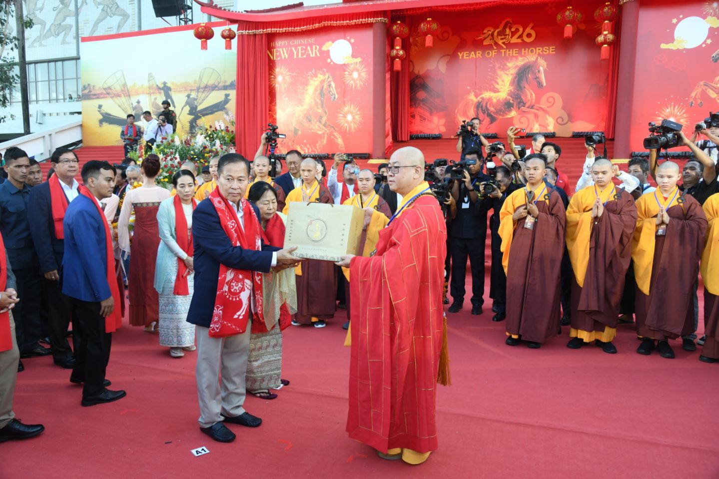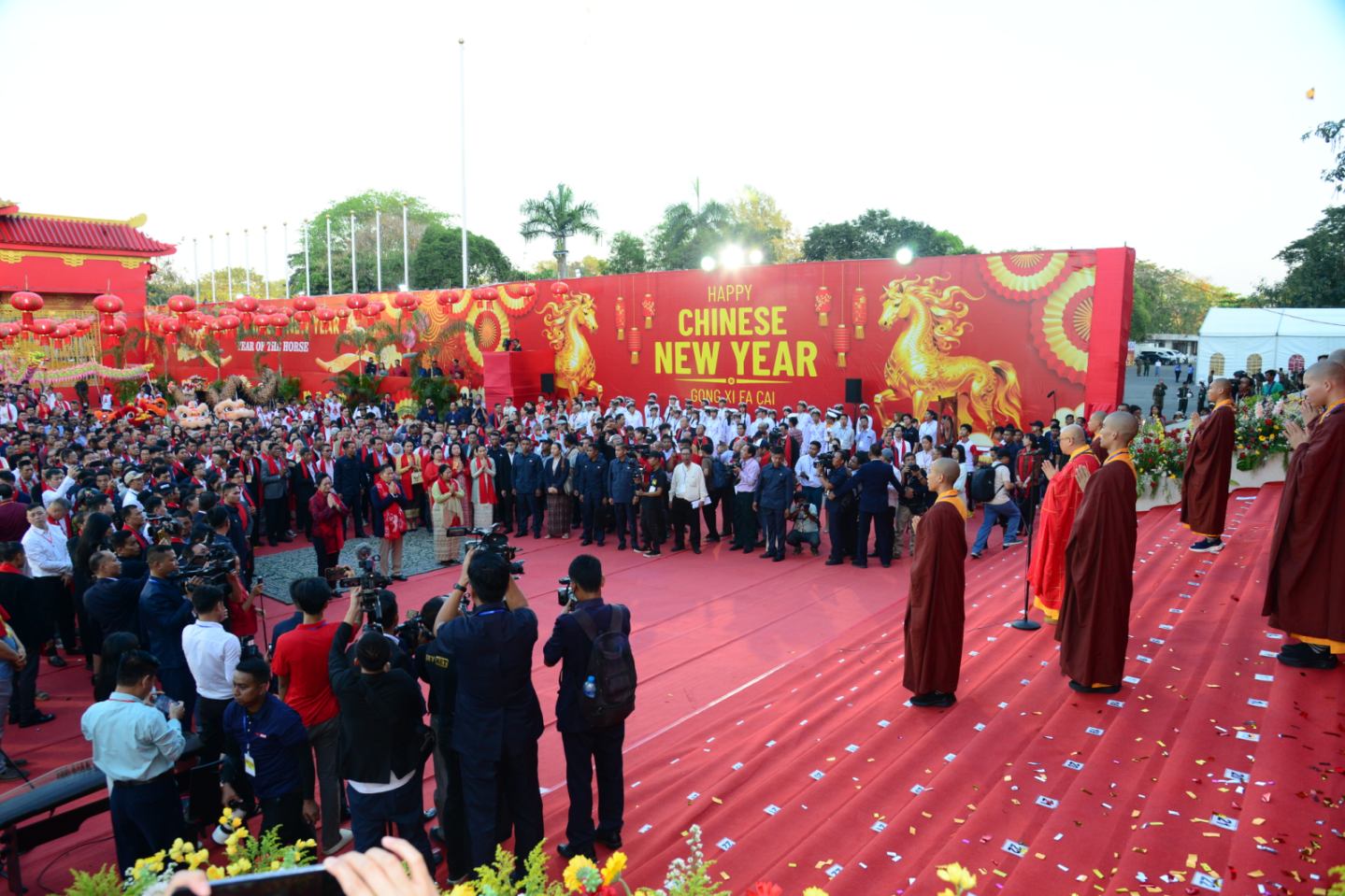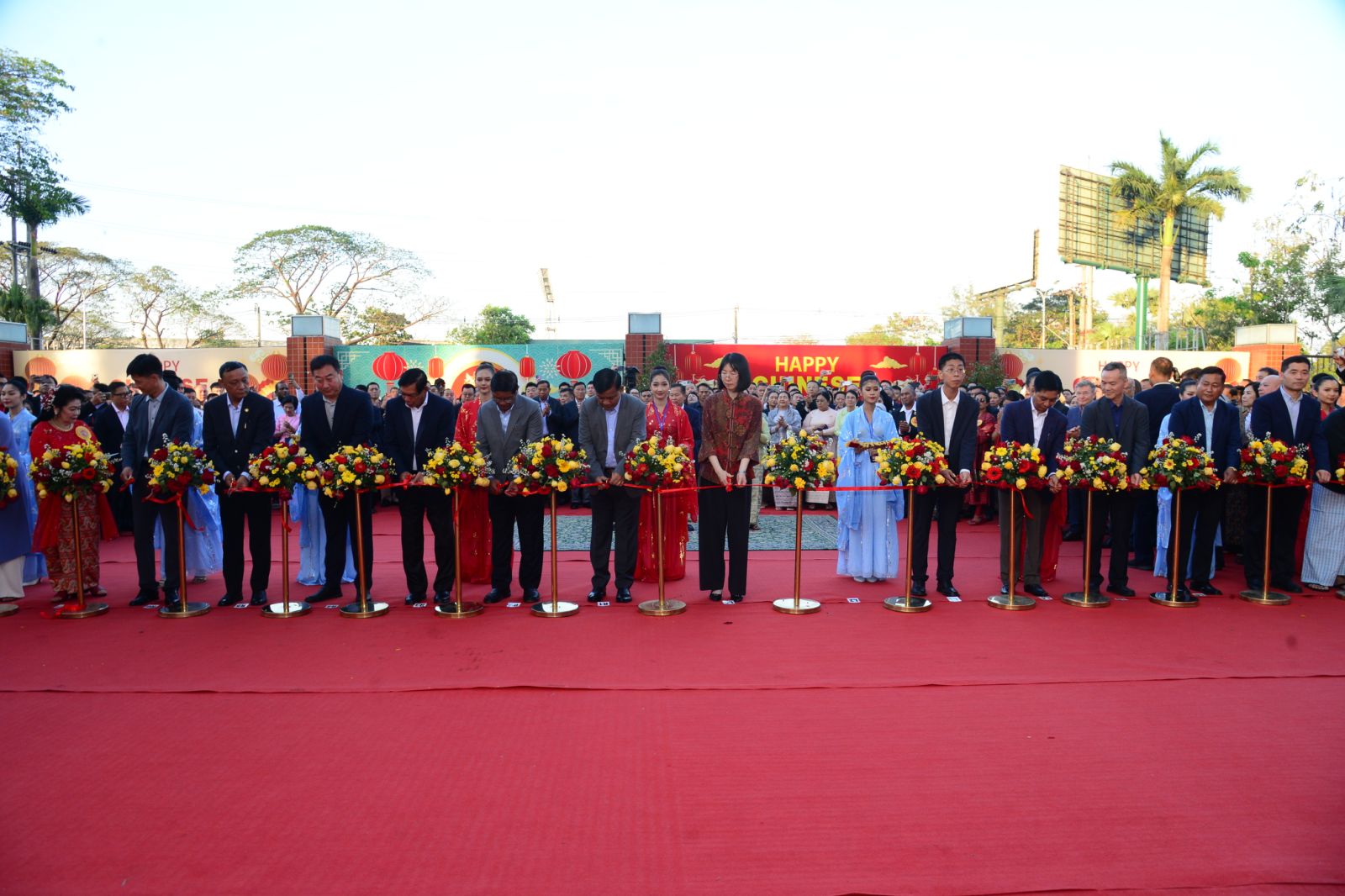 ထို့နောက် ပြည်ထောင်စုဝန်ကြီးများဖြစ်ကြသည့် ဗိုလ်ချုပ်ကြီး မောင်မောင်အေး၊ ဦးဉာဏ်ထွန်း၊ ရန်ကုန်တိုင်းဒေသကြီးဝန်ကြီးချုပ် ဦးစိုးသိန်း၊ ကာကွယ်ရေးဦးစီးချုပ်ရုံး (ကြည်း)မှ ဒုတိယဗိုလ်ချုပ်ကြီး ကိုကိုဦး၊ ဒုတိယဝန်ကြီးများ၊ မြန်မာနိုင်ငံဆိုင်ရာ တရုတ်သံရုံးမှ သံမှူးကြီးများ၊ မြန်မာနိုင်ငံ ကုန်သည်များနှင့်စက်မှုလက်မှု လုပ်ငန်းရှင် များအသင်းချုပ်(UMFCCI) ဒုတိယဥက္ကဋ္ဌ၊ မြန်မာ-တရုတ်ချစ်ကြည်ရေးဥက္ကဋ္ဌ၊ မြန်မာ နိုင်ငံတရုတ်ကုန်သည်များအသင်းချုပ်ဥက္ကဋ္ဌ၊ မြန်မာ-တရုတ်ဗုဒ္ဓဘာသာနှင့် ယဉ်ကျေးမှု နှီးနှောဖလှယ်ရေးအဖွဲ့နာယကနှင့် အသင်းအဖွဲ့များမှ တာဝန်ရှိသူများက (၂၀၂၆)ခုနှစ်၊ မြင်းနှစ် တရုတ်နှစ်သစ်ကူးပွဲတော်ဖွင့်ပွဲ အခမ်းအနားအား ဖဲကြိုးဖြတ်ဖွင့်လှစ်ပေး သည်။