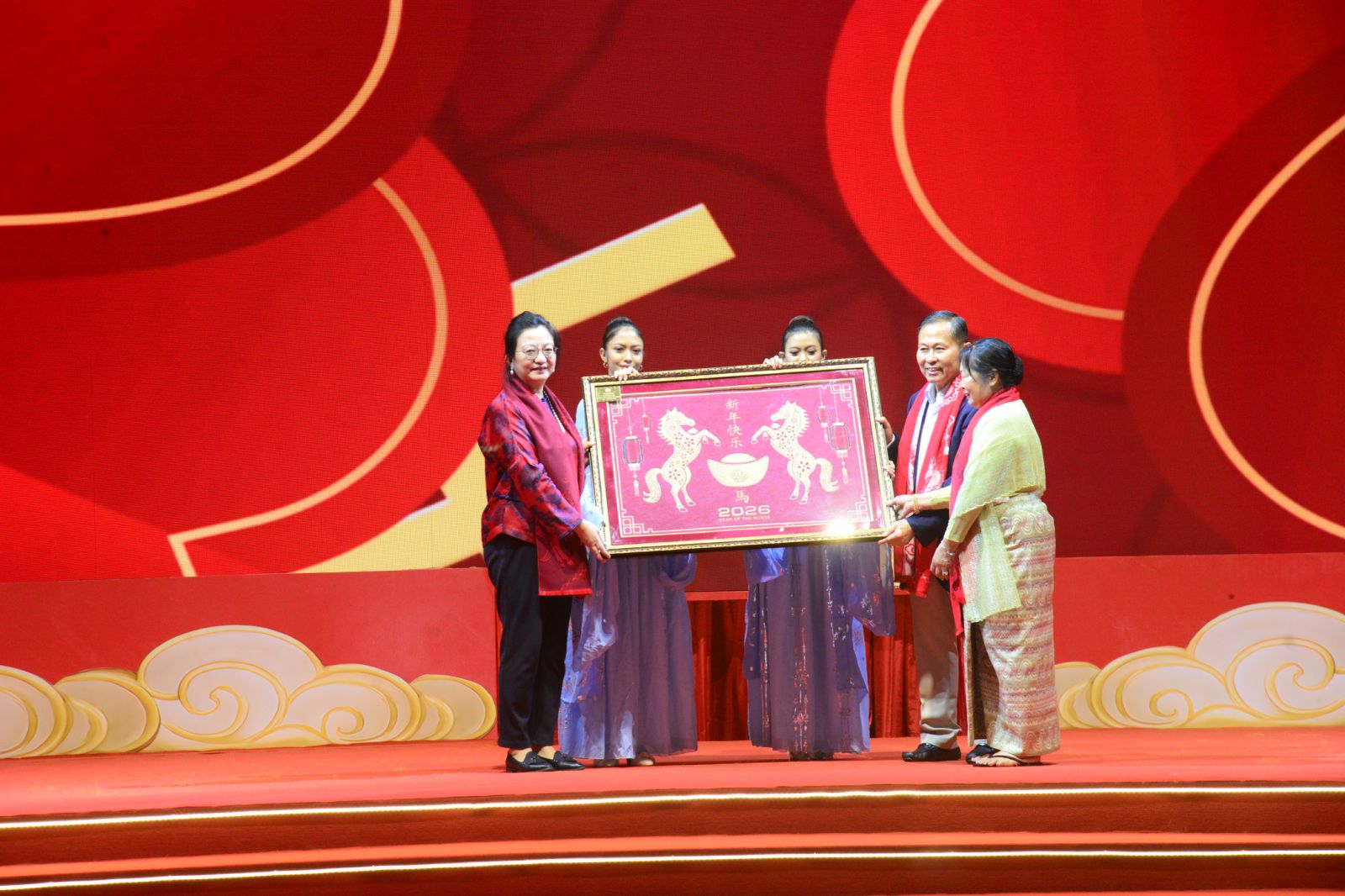 ဦးစွာ နိုင်ငံတော်လုံခြုံရေးနှင့်အေးချမ်းသာယာရေးကော်မရှင် ဒုတိယဥက္ကဋ္ဌနှင့် ဇနီး တို့အား မြန်မာနိုင်ငံဆိုင်ရာတရုတ်ပြည်သူ့သမ္မတနိုင်ငံသံအမတ်ကြီး H.E. Ms. Ma Jia နှင့် ကြွရောက်လာကြသည့် ဧည့်သည်တော်ကြီးများ၊ တာဝန်ရှိသူများက လှိုက်လှဲ နွေးထွေးစွာ ကြိုဆိုနှုတ်ဆက်ကြသည်။ ထို့နောက် နိုင်ငံတော်လုံခြုံရေးနှင့် အေးချမ်း သာယာရေးကော်မရှင် ဒုတိယဥက္ကဋ္ဌနှင့်ဇနီး၊ အခမ်းအနားတက်ရောက်လာကြသူများ သည် (၂၀၂၆) ခုနှစ်၊ မြင်းနှစ် တရုတ်နှစ်သစ်ကူးပွဲတော် ဖွင့်ပွဲအခမ်းအနားကျင်းပမည့် နေရာသို့ ရောက်ရှိကြသည်။