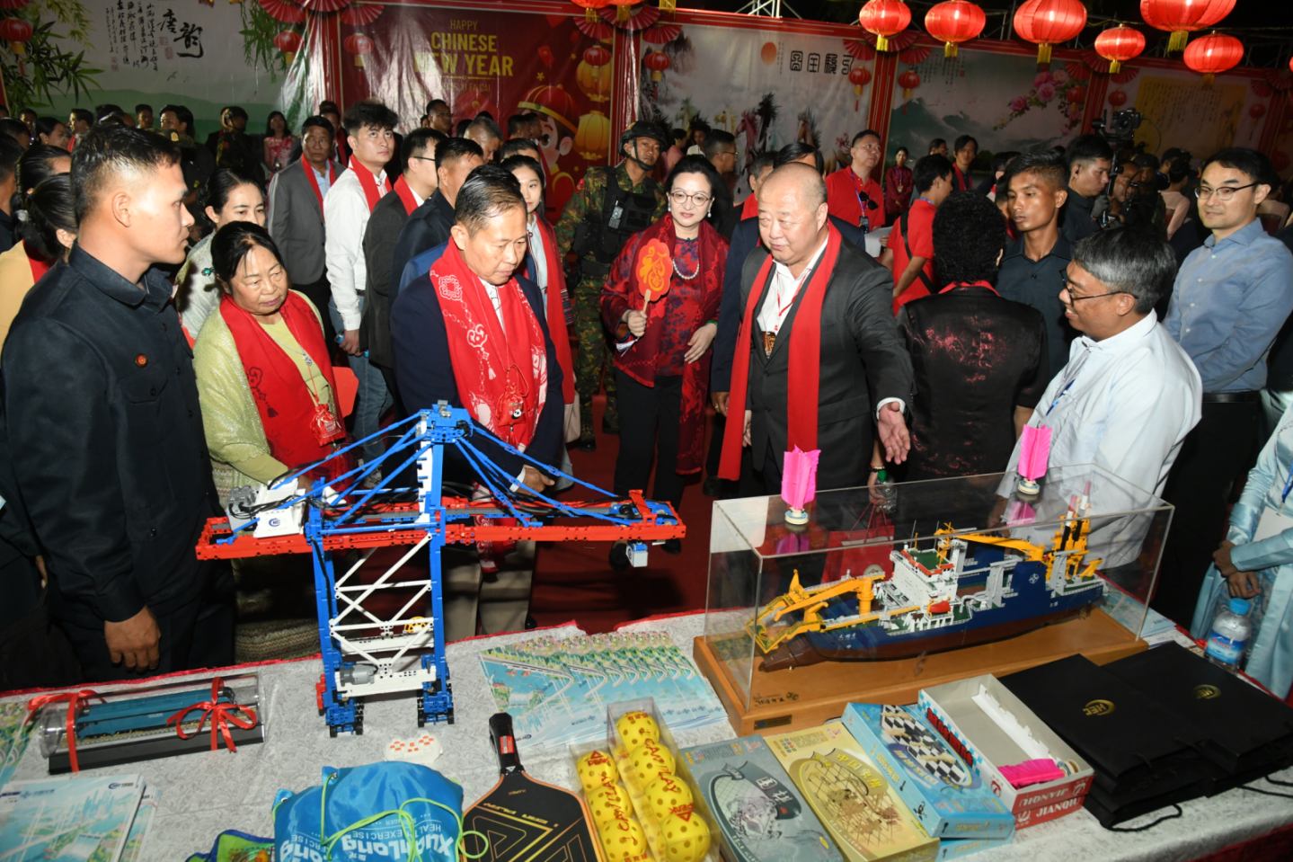 ထို့နောက် နိုင်ငံတော်လုံခြုံရေးနှင့်အေးချမ်းသာယာရေးကော်မရှင် ဒုတိယဥက္ကဋ္ဌ နှင့် ဇနီး၊ တက်ရောက်လာကြသူများသည် ခြင်္သေ့ထိုင်အက၊ တရုတ်ရိုးရာ ကြက်တောင် ရိုက်ခြင်းနှင့် မြန်မာ့ရိုးရာတစ်ပင်တိုင် ခြင်းလုံးခတ်သရုပ်ပြ ဖျော်ဖြေမှုများကို ကြည့်ရှု အားပေးပြီး နှစ်သစ်ကူးလက်ဆောင်များ ပေးအပ်ကြသည်။