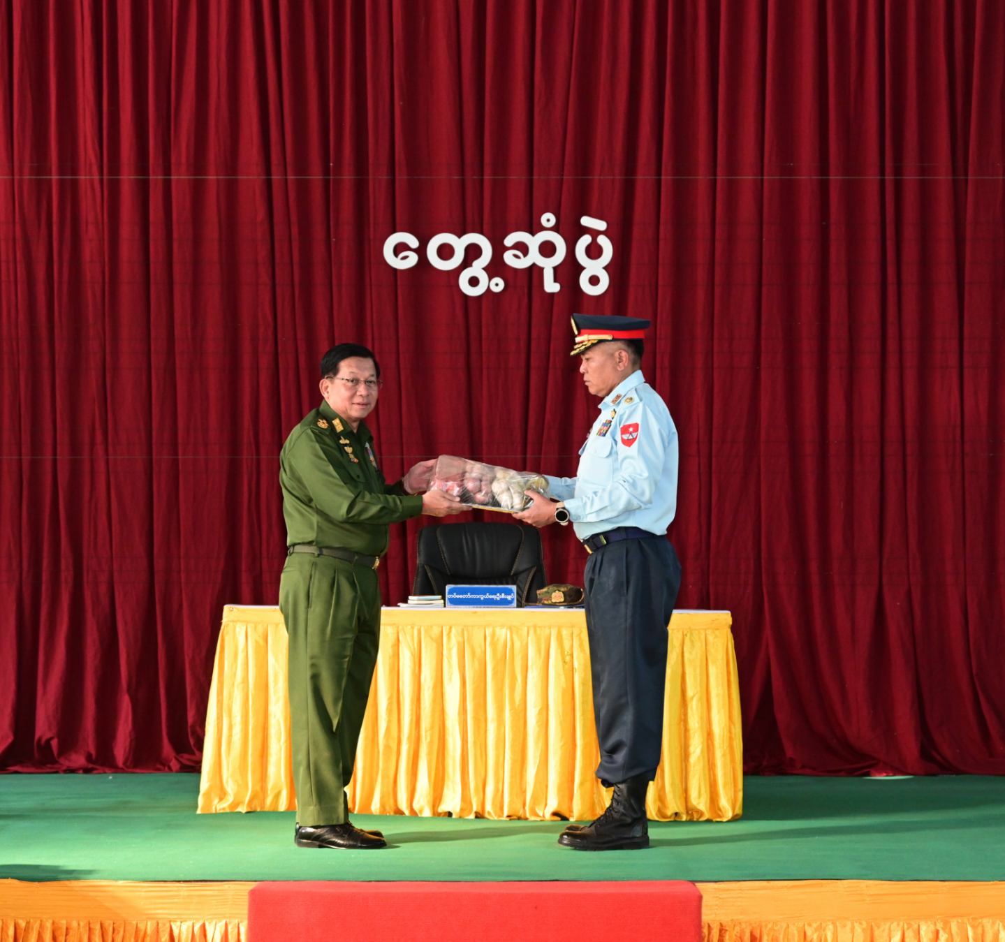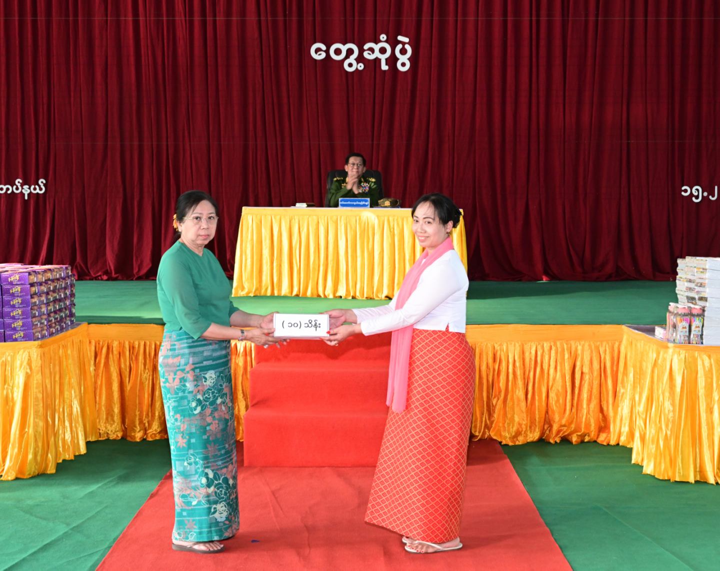 ထို့နောက် နိုင်ငံတော်လုံခြုံရေးနှင့် အေးချမ်းသာယာရေးကော်မရှင် ဥက္ကဋ္ဌ တပ်မတော်ကာကွယ်ရေးဦးစီးချုပ်က တပ်နယ်မှ အရာရှိ၊ စစ်သည်၊ မိသားစုများ အတွက် စားသောက်ဖွယ်ရာပစ္စည်းများကိုပေးအပ်ရာ တပ်နယ်မှူးက လည်းကောင်း၊ နိုင်ငံတော်လုံခြုံရေးနှင့် အေးချမ်းသာယာရေးကော်မရှင်ဥက္ကဋ္ဌ တပ်မတော်ကာကွယ် ရေးဦးစီးချုပ်၏ဇနီးက တပ်နယ်မိခင်နှင့် ကလေးစောင့်ရှောက်ရေးအသင်းအတွက် ချီးမြှင့်ငွေများကို ပေးအပ်ရာ တပ်နယ်မှူး၏ ဇနီးကလည်းကောင်း လက်ခံရယူသည်။