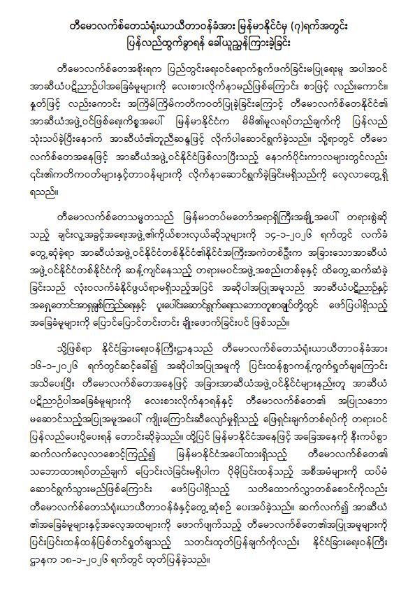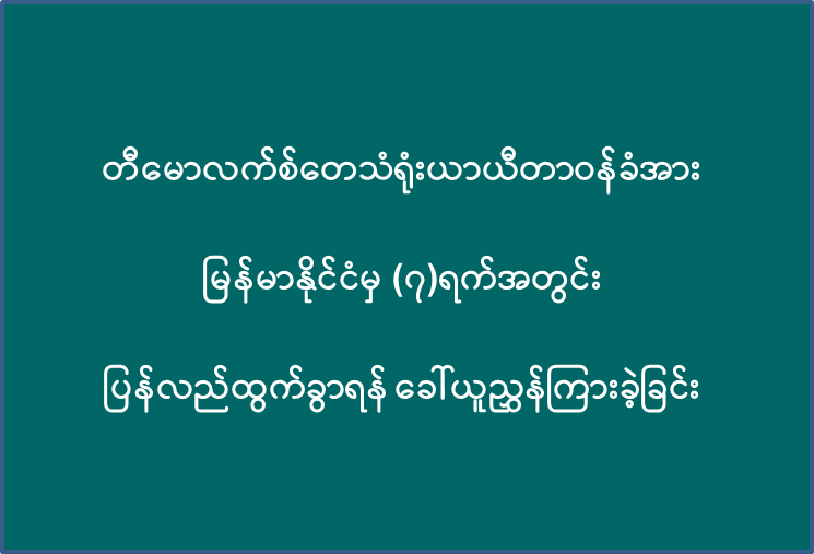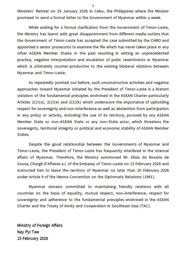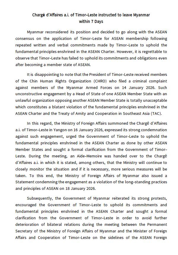 တီမောလက်စ်တေသံရုံးယာယီတာဝန်ခံအား မြန်မာနိုင်ငံမှ (၇)ရက်အတွင်း ပြန်လည်ထွက်ခွာရန် ခေါ်ယူညွှန်ကြားခဲ့ခြင်း
