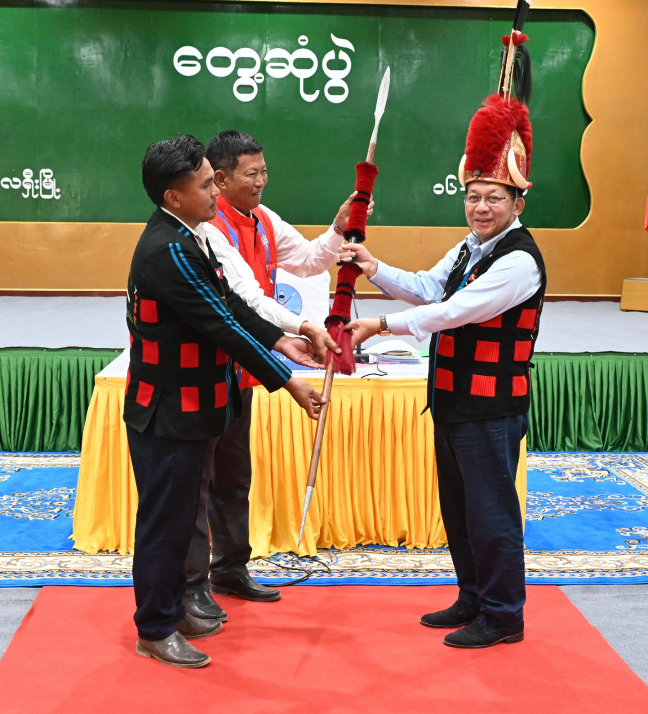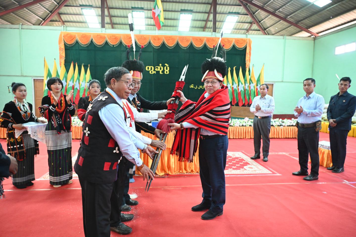 ယင်းနောက် နိုင်ငံတော်ယာယီသမ္မတ နိုင်ငံတော်လုံခြုံရေးနှင့် အေးချမ်းသာယာ ရေးကော်မရှင် ဥက္ကဋ္ဌက လဟယ်မြို့နယ်နှင့် လေရှီးမြို့နယ်တို့ရှိ ဌာနဆိုင်ရာ တာဝန်ရှိ သူများအတွက် လက်ဆောင်ပစ္စည်းများပေးအပ်ပြီး နာဂကိုယ်ပိုင်အုပ်ချုပ် ခွင့်ရဒေသ ဦးစီးအဖွဲ့ဥက္ကဋ္ဌ၊ နာဂရိုးရာ စာပေနှင့်ယဉ်ကျေးမှုကော်မတီဥက္ကဋ္ဌ နှင့် တာဝန်ရှိသူများက နိုင်ငံတော်ယာယီသမ္မတ နိုင်ငံတော်လုံခြုံရေးနှင့်အေးချမ်းသာယာရေး ကော်မရှင်ဥက္ကဋ္ဌထံ နာဂရိုးရာ ခေါင်းပေါင်း၊ ခြုံထည်နှင့် ရိုးရာလက်ဆောင်ပစ္စည်းများအား ဂါရဝပြု ဆင်မြန်း ပေးအပ်သည်။