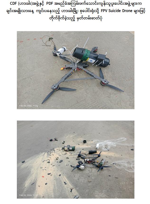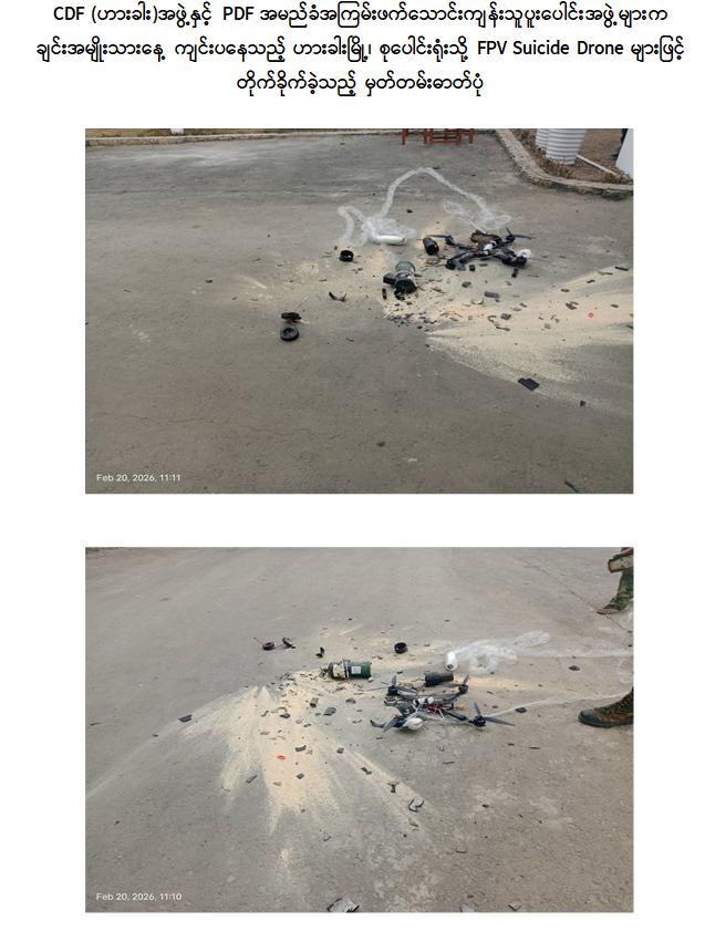 ဖြစ်စဉ်မှာ (၇၈)နှစ်မြောက် ချင်းအမျိုးသားနေ့ အခမ်းအနား ကျင်းပပြုလုပ် နေသည့် ချင်းပြည်နယ်၊ ဟားခါးမြို့၊ စုပေါင်းရုံးအား CDF (ဟားခါး)အဖွဲ့နှင့် PDF အမည်ခံ အကြမ်းဖက်သောင်းကျန်းသူ ပူးပေါင်းအဖွဲ့များက ယနေ့နံနက်ပိုင်း၌ FPV Suicide Drone များအသုံးပြု၍ တိုက်ခိုက်ခြင်းဆောင်ရွက်ခဲ့ရာ လေကြောင်းလုံခြုံရေးတာဝန်များ ထမ်း ဆောင်လျက်ရှိသည့် လုံခြုံရေးတပ်ဖွဲ့ဝင်များက လေကြောင်းရန် ကာကွယ်ရေးစနစ်များဖြင့် ထောက်လှမ်းသိရှိခဲ့ပြီး အဆိုပါ Drone ယာဉ်များအား လက်ဦးမှုရယူဟန့်တားနိုင်ခဲ့သည်။ ယင်းသို့ ဆောင်ရွက်နိုင်ခဲ့ခြင်းကြောင့် အခမ်းအနားကျင်းပနေသည့်နေရာသို့ ကျရောက် ပေါက်ကွဲခြင်းမရှိဘဲ အနီးဝန်းကျင်နေရာများတွင်သာ မြေပြင်ပေါ်သို့ ပျက်ကျပျက်စီးခဲ့ပြီး လုံခြုံရေးတပ်ဖွဲ့ဝင်များက အများပြည်သူများ အန္တရာယ်ကင်းရှင်းစေရန်အတွက် Drone ယာဉ်များတွင်ပါရှိသည့် ဖောက်ခွဲဖျက်ဆီးရေးပစ္စည်းများအား စနစ်တကျ သက်မဲ့ပြုလုပ်ခြင်း များဆောင်ရွက်ခဲ့သည်။ ဖြစ်စဉ်တွင် လူနှင့်အဆောက်အအုံများထိခိုက်ပျက်စီးမှုမရှိခဲ့ကြောင်း သိရှိရသည်။
