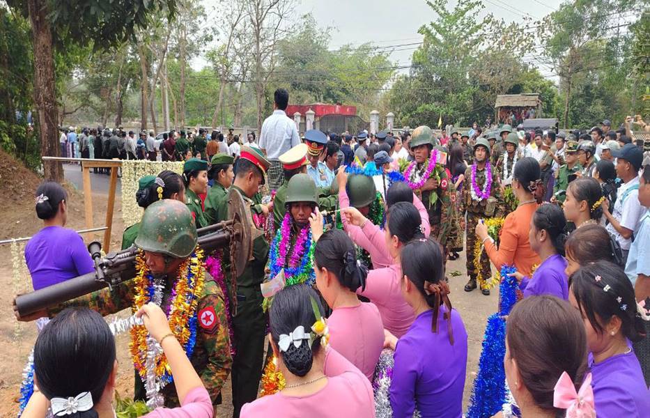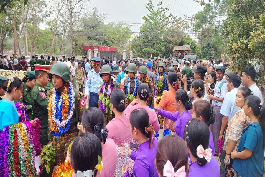 တိုင်းဒေသကြီးနှင့်ပြည်နယ်အသီးသီးရှိ တိုင်းရင်းသားပြည်သူများ စိတ်အေး ချမ်းသာစွာ နေထိုင်လုပ်ကိုင်စားသောက်နိုင်ရေးနှင့် အသက်အိုးအိမ်စည်းစိမ်ဥစ္စာ လုံခြုံမှုရှိစေရေး၊ နိုင်ငံတော်တည်ငြိမ်ရေး၊ နယ်မြေအေးချမ်းရေးအတွက် ရှေ့တန်း စစ်မျက်နှာများတွင် စစ်ဆင်ရေးတာဝန်များကို နေ့မအားညမနားစွမ်းစွမ်းတမံ တာဝန် ထမ်းဆောင်ခဲ့ပြီး ရွပ်ရွပ်ချွံချွံတိုက်ပွဲဝင်၍ အောင်ပွဲအလီလီရယူနိုင်ခဲ့သော အောင်ပွဲရ ရှေ့တန်းပြန် တပ်မတော်သားများအား မှော်ဘီတပ်နယ်မှ တာဝန်ရှိသူများနှင့် ဌာန ဆိုင်ရာတာဝန်ရှိသူများ၊ ကျောင်းသား/ကျောင်းသူများ၊ အနုပညာရှင်များနှင့် ဒေသခံ ပြည်သူများက အောင်သပြေခက်များဖြင့်လည်းကောင်း၊ ဘင်ခရာနှင့်ပန်းပွားအကများ၊ အိုးစည်ဒိုးပတ် အတီး၊ အမှုတ်၊ အက၊ အခုန်များဖြင့်လည်းကောင်း ဝမ်းမြောက်စွာ သောင်းသောင်းဖြဖြ ကြိုဆိုဂုဏ်ပြုခဲ့ကြပြီး မှော်ဘီတပ်နယ်မှ တာဝန်ရှိသူတစ်ဦးက အောင်ပွဲရ ရှေ့တန်းပြန်တပ်မတော်သားများအား ဂုဏ်ပြုချီးမြှင့်ငွေများ ပေးအပ်ခဲ့ ကြောင်း သတင်းရရှိသည်။