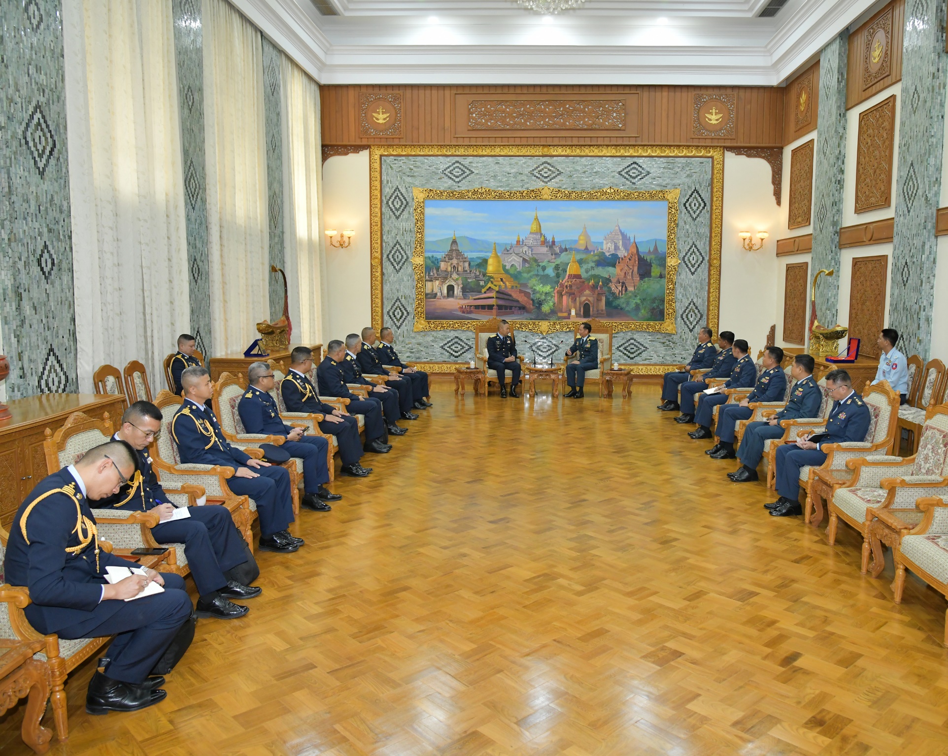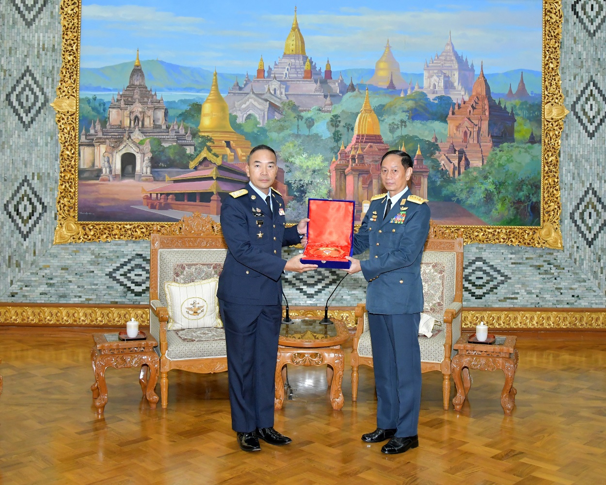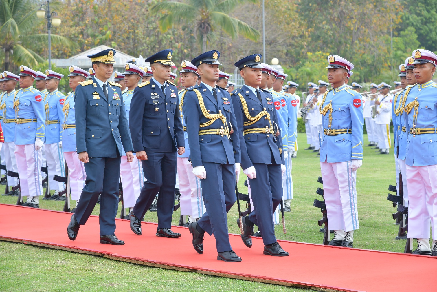 ထို့နောက် ထိုင်းဘုရင့်လေတပ်ဦးစီးချုပ် Air Chief Marshal Sakesan Kantha အား ကာကွယ်ရေးဦးစီးချုပ်(လေ) ဗိုလ်ချုပ်ကြီး ထွန်းအောင်က နေပြည်တော်ရှိ ဘုရင့်နောင်ရိပ်သာ၌ ဂုဏ်ပြုတပ်ဖွဲ့ဖြင့် ကြိုဆိုသည်။ ကာကွယ်ရေးဦးစီးချုပ်(လေ)နှင့် ထိုင်းဘုရင့်လေတပ်ဦးစီးချုပ်တို့သည် ဂုဏ်ပြုတပ်ဖွဲ့၏ အလေးပြုခြင်းကိုခံယူပြီး ဂုဏ်ပြုတပ်ဖွဲ့အား လိုက်လံကြည့်ရှုစစ်ဆေးသည်။ ထို့နောက် ထိုင်းဘုရင့်လေတပ်ဦးစီးချုပ် Air Chief Marshal Sakesan Kantha က ဘုရင့်နောင်ရိပ်သာ ဧည့်သည်တော်မှတ်တမ်းစာအုပ်တွင် မှတ်တမ်းတင်လက်မှတ်ရေးထိုးသည်။