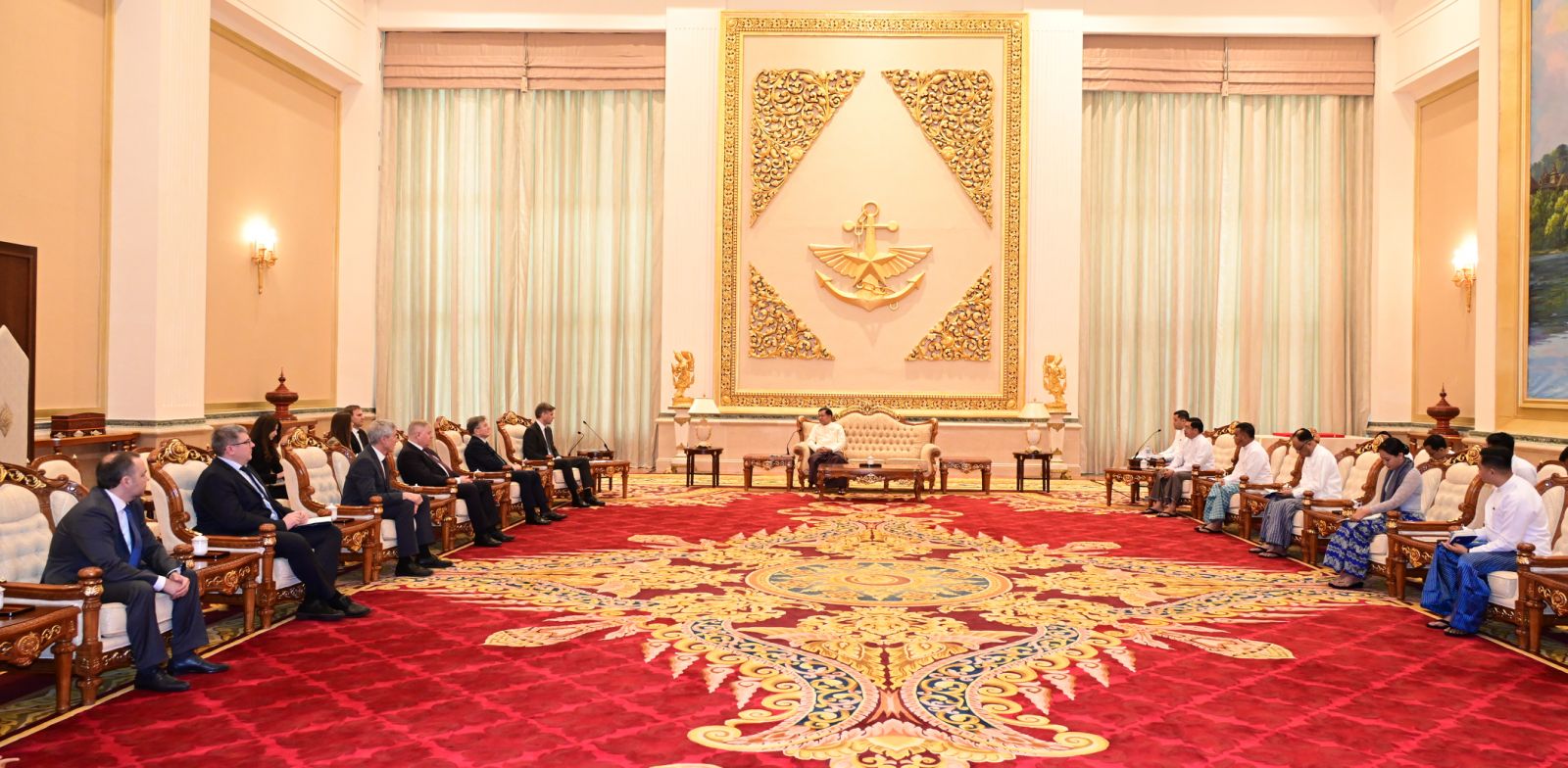 ပြည်ထောင်စုသမ္မတမြန်မာနိုင်ငံတော် ယာယီသမ္မတ နိုင်ငံတော်လုံခြုံရေးနှင့် အေးချမ်းသာယာရေးကော်မရှင်ဥက္ကဋ္ဌ ဗိုလ်ချုပ်မှူးကြီး မင်းအောင်လှိုင် ထံ ရုရှား ဖက်ဒရေးရှင်းနိုင်ငံ၊ “Roscosmos” နိုင်ငံပိုင်ကော်ပိုရေးရှင်း၏ အထွေထွေညွှန်ကြား ရေးမှူးချုပ် Mr. Dmitry V. Bakanov ဦးဆောင်သည့် ကိုယ်စားလှယ်အဖွဲ့က ယနေ့နံနက်ပိုင်းတွင် နေပြည်တော်ရှိဇေယျာသီရိဗိမာန် ဧည့်ခန်းမဆောင်၌ လာရောက် ဂါရဝပြုတွေ့ဆုံသည်။