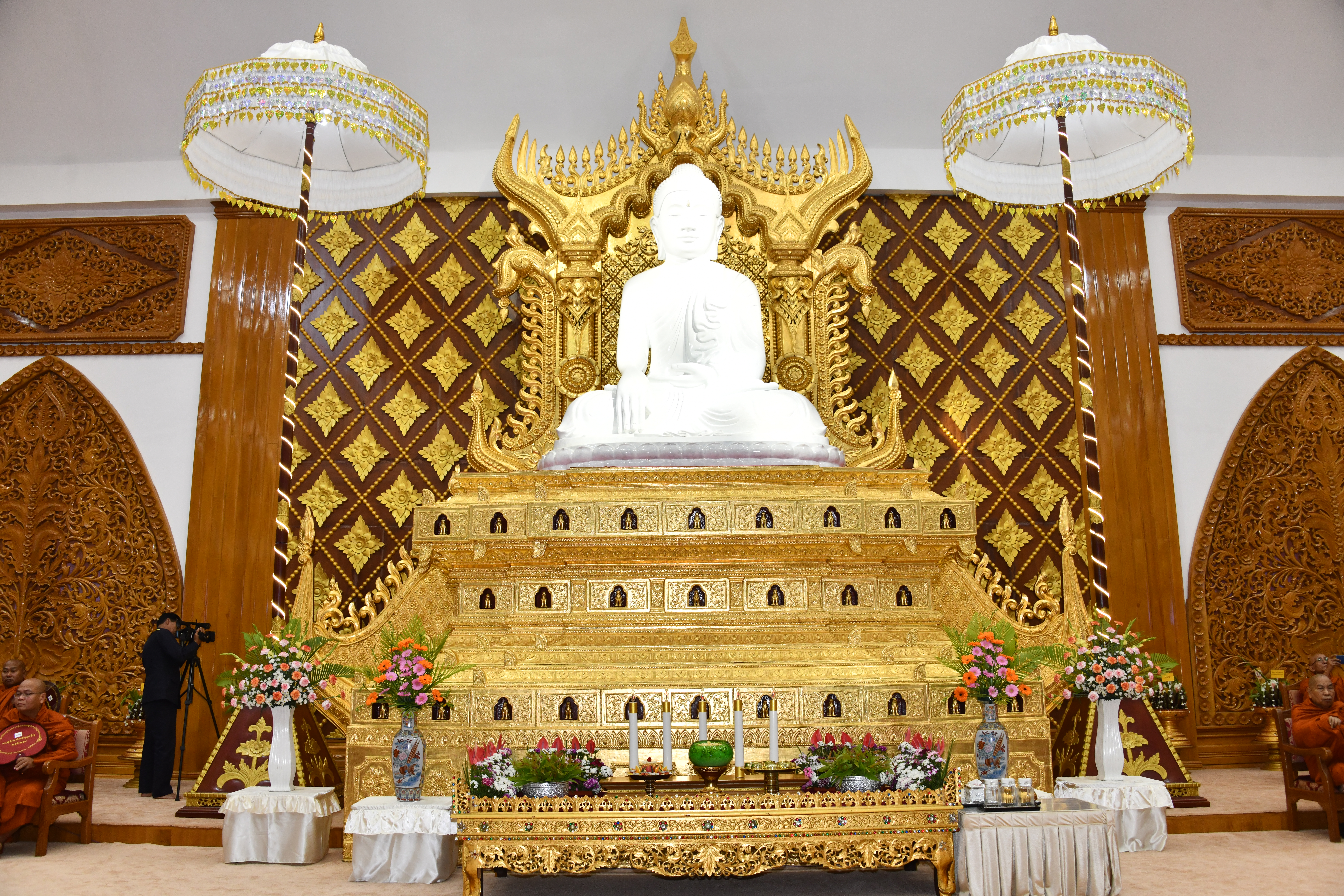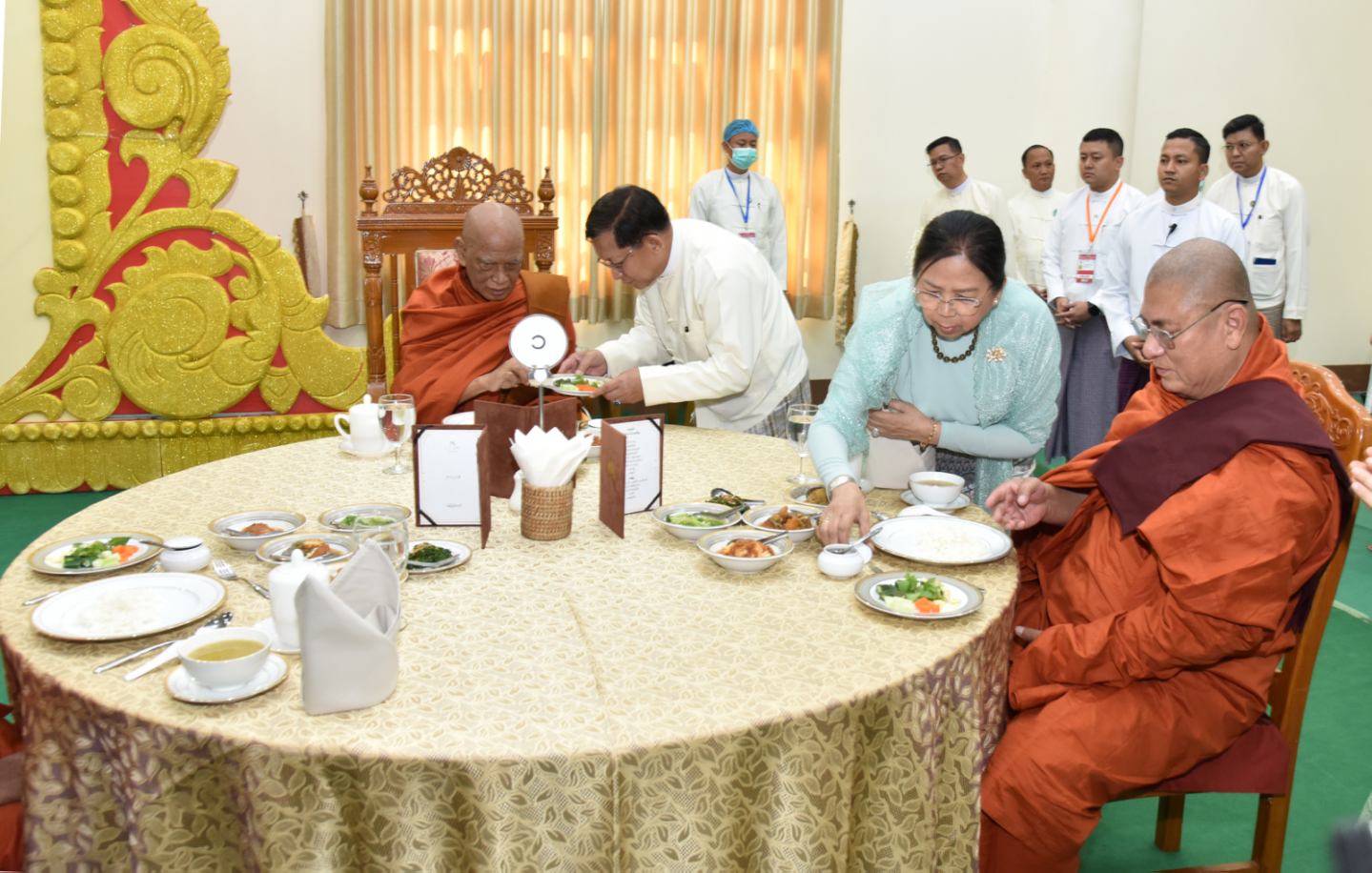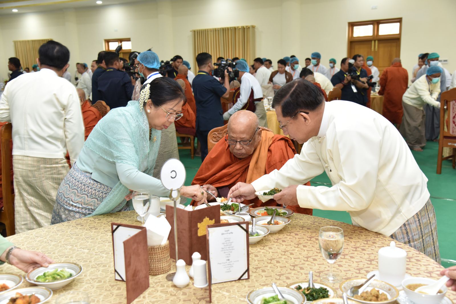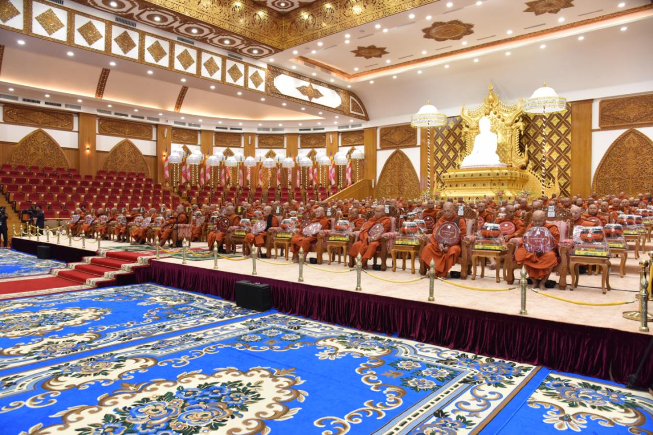 အခမ်းအနားသို့ အထူးပင့်ဖိတ်ထားသည့် နိုင်ငံတော်သံဃမဟာနာယကအဖွဲ့ ဥက္ကဋ္ဌ အဘိဓဇမဟာရဋ္ဌဂုရု အဂ္ဂမဟာသဒ္ဒမ္မဇောတိကဓဇ သန်လျင်မင်းကျောင်း ဆရာတော် ဒေါက်တာ ဘဒ္ဒန္တ စန္ဒိမာဘိဝံသနှင့် နိုင်ငံတော်သံဃမဟာနာယကအဖွဲ့ အကျိုးတော်ဆောင်၊ မန္တလေးမြို့၊ မစိုးရိမ်တိုက်သစ်မဟာနာယက၊ ဓမ္မသမိဒ္ဓိကျောင်း ဆရာတော် အဂ္ဂမဟာပဏ္ဍိတ အဂ္ဂမဟာသဒ္ဓမ္မဇောတိကဓဇ မဟာဓမ္မကထိက ဗဟုဇနဟိတဓရ ဘဒ္ဒန္တ ဝါသေဋ္ဌာဘိဝံသ တို့အမှူးပြုသည့် ပြည်တွင်း၊ ပြည်ပဘွဲ့ခံ ဆရာတော်ကြီး ၁၄၆ ပါးနှင့် ဘွဲ့ခံသီလရှင်ဆရာကြီး ၁ ပါး ကြွရောက်ချီးမြှင့်တော်မူကြ ပြီး နိုင်ငံတော်ယာယီသမ္မတ နိုင်ငံတော်လုံခြုံရေးနှင့် အေးချမ်းသာယာရေးကော်မရှင် ဥက္ကဋ္ဌနှင့် ဇနီးတို့နှင့်အတူ ကော်မရှင်ဒုတိယဥက္ကဋ္ဌ ဒုတိယဗိုလ်ချုပ်မှူးကြီး စိုးဝင်း၊ ကော်မရှင်အဖွဲ့ဝင် နိုင်ငံတော်ဝန်ကြီးချုပ် ဦးညိုစော နှင့်ဇနီး၊ ကော်မရှင်အဖွဲ့ဝင် အမှုဆောင်ချုပ် ဦးအောင်လင်းဒွေးနှင့်ဇနီး၊ ကော်မရှင်အတွင်း ရေးမှူး ဗိုလ်ချုပ်ကြီး ရဲဝင်းဦးနှင့်ဇနီး၊ ကော်မရှင်အဖွဲ့ဝင်များနှင့်ဇနီးများ၊ ပြည်ထောင်စုအဆင့်ပုဂ္ဂိုလ်များ၊ ပြည်ထောင်စုဝန်ကြီးများနှင့် ဇနီးများ၊ နေပြည်တော်ကောင်စီဥက္ကဋ္ဌ၊ ကာကွယ်ရေး ဦးစီးချုပ်ရုံးမှ အဆင့်မြင့်တပ်မတော်အရာရှိကြီးများနှင့် ဇနီးများ၊ နေပြည်တော်တိုင်း စစ်ဌာနချုပ် တိုင်းမှူးနှင့် တာဝန်ရှိသူများ တက်ရောက် ကြည်ညိုကြသည်။