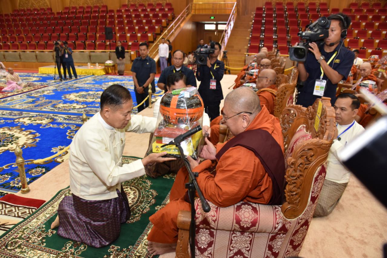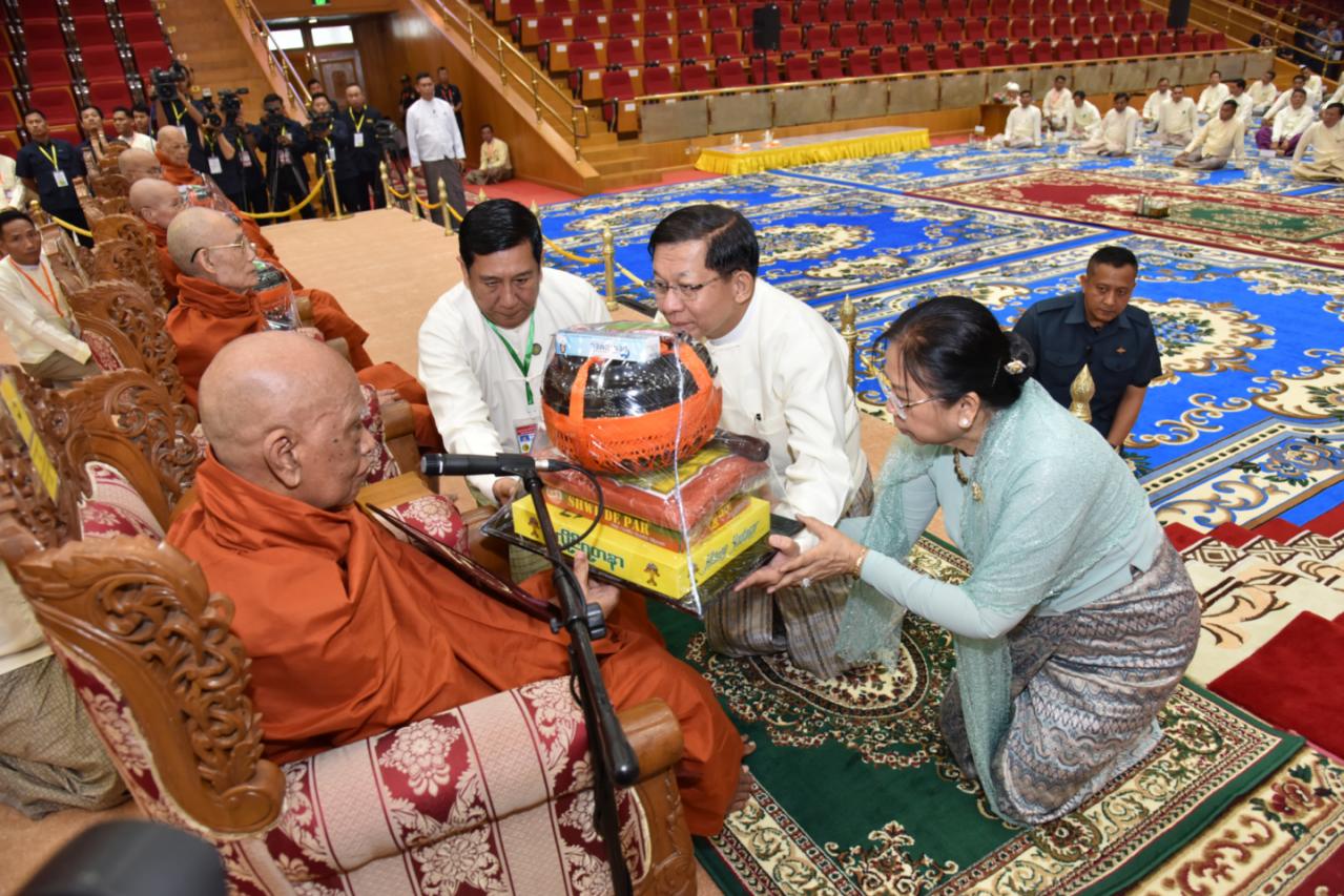 ယင်းနောက် နိုင်ငံတော်ယာယီသမ္မတ နိုင်ငံတော်လုံခြုံရေးနှင့် အေးချမ်းသာယာ ရေးကော်မရှင်ဥက္ကဋ္ဌ နှင့်ဇနီးတို့က နိုင်ငံတော်သံဃမဟာနာယကအဖွဲ့ ဥက္ကဋ္ဌ၊ သန်လျင် မင်းကျောင်းဆရာတော်ဘုရားကြီး ထံသို့လည်းကောင်း၊ ကော်မရှင်ဒုတိယဥက္ကဋ္ဌက နိုင်ငံတော်သံဃမဟာနာယကအဖွဲ့ အကျိုးတော်ဆောင်၊ မန္တလေးမြို့၊ မစိုးရိမ်တိုက်သစ် မဟာနာယကဆရာတော်ကြီးထံသို့လည်းကောင်း၊ ကော်မရှင်အဖွဲ့ဝင် နိုင်ငံတော် ဝန်ကြီးချုပ်နှင့်ဇနီး၊ ကော်မရှင်အဖွဲ့ဝင် အမှုဆောင်ချုပ်နှင့်ဇနီး၊ ကော်မရှင်အတွင်း ရေးမှူးနှင့်ဇနီး၊ ကော်မရှင်အဖွဲ့ဝင်များနှင့် ဇနီးများ၊ အခမ်းအနားသို့ တက်ရောက် လာသည့် အကြီးအကဲများက သာသနာတော်ဆိုင်ရာဘွဲ့တံဆိပ်တော် ဆက်ကပ်ခံယူ မည့် ဆရာတော်ကြီးများထံသို့လည်းကောင်း လှူဖွယ်ဝတ္ထုပစ္စည်းများကို ဆက်ကပ် လှူဒါန်းကြသည်။