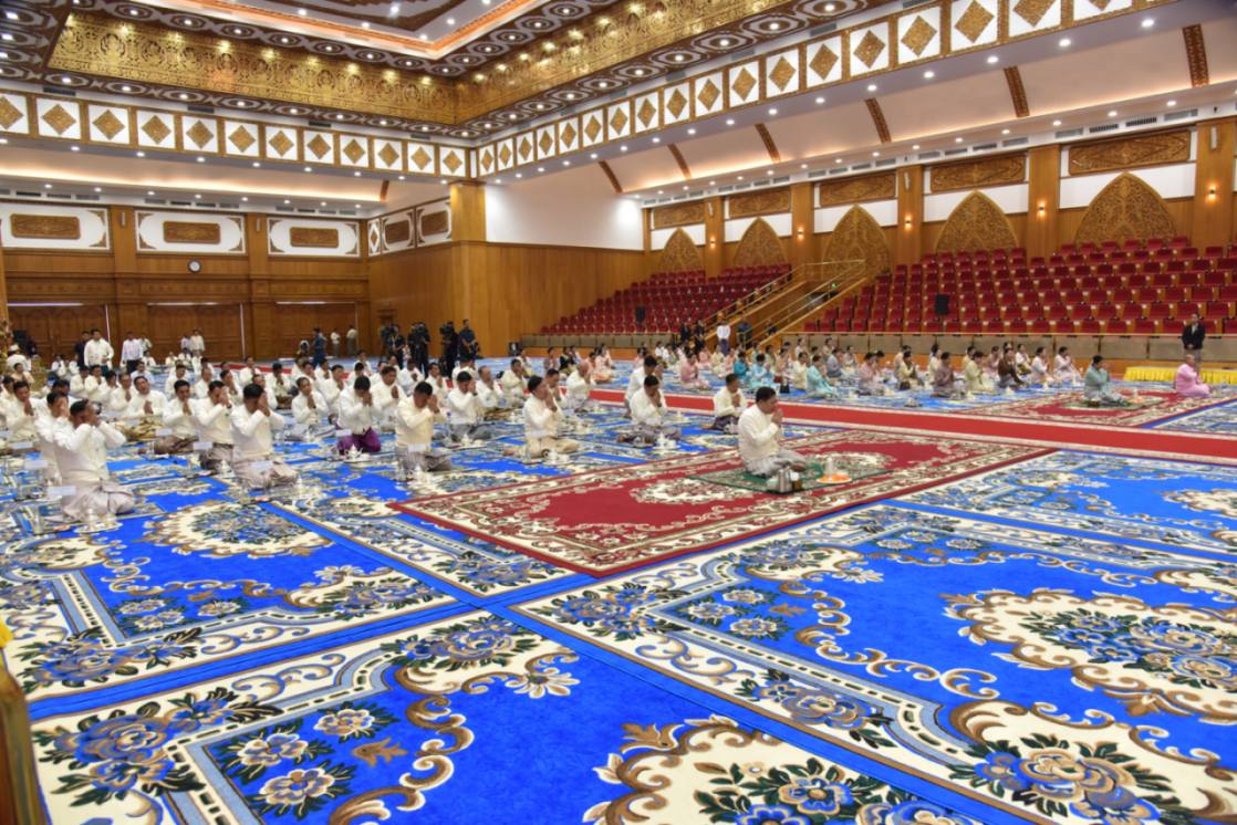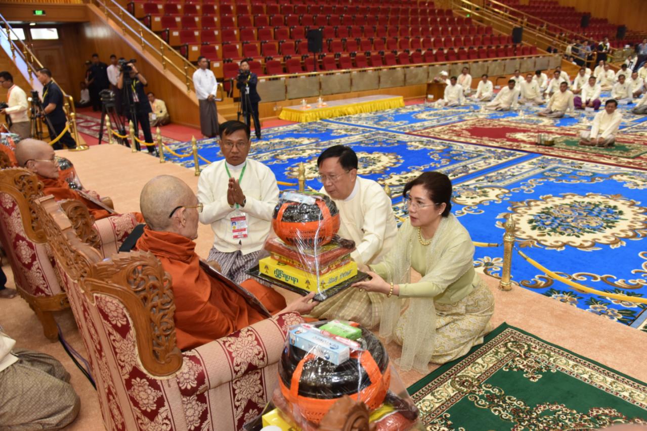 ထို့နောက် အခမ်းအနားကို “နမော တဿ” သုံးကြိမ်ရွတ်ဆို ဘုရားကန်တော့ ဖွင့်လှစ်၍ နိုင်ငံတော်ယာယီသမ္မတ နိုင်ငံတော်လုံခြုံရေးနှင့် အေးချမ်းသာယာရေး ကော်မရှင်ဥက္ကဋ္ဌနှင့်ဇနီး အမှူးပြုသော ဧည့်ပရိသတ်များက နိုင်ငံတော်သံဃမဟာ နာယကအဖွဲ့ဥက္ကဋ္ဌ သန်လျင်မင်းကျောင်းဆရာတော်ဘုရားကြီးထံမှ ငါးပါးသီလခံယူ ဆောက်တည်ကြပြီး သံဃာတော်အရှင်သူမြတ်များ ရွတ်ပွားသရဇ္ဈာယ်တော်မူသော မေတ္တသုတ်ပရိတ် တရားတော်များကို နာယူကြည်ညိုကြသည်။