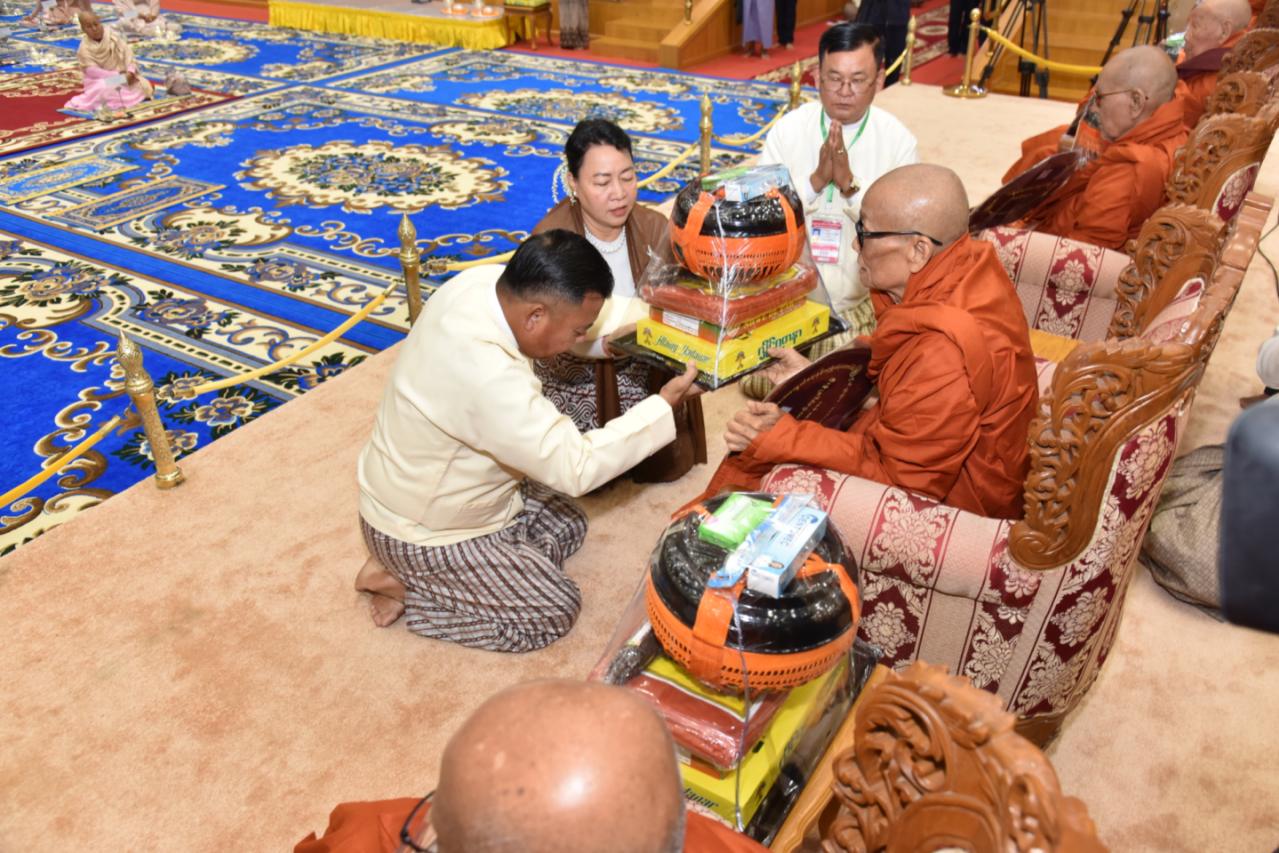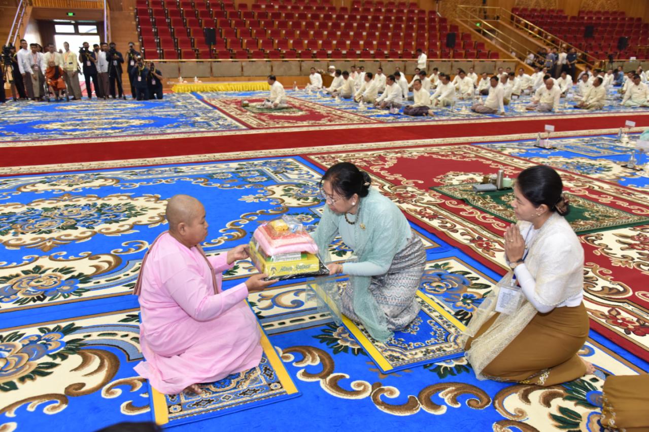 ထို့နောက် နိုင်ငံတော်ယာယီသမ္မတ နိုင်ငံတော်လုံခြုံရေးနှင့် အေးချမ်းသာယာ ရေးကော်မရှင်ဥက္ကဋ္ဌ၏ဇနီးက ဘွဲ့တံဆိပ်တော်ဆက်ကပ်ခံယူမည့် သီလရှင်ဆရာကြီး ၁ ပါးအား လှူဖွယ်ဝတ္ထုပစ္စည်းများကို ဆက်ကပ်လှူဒါန်းသည်။