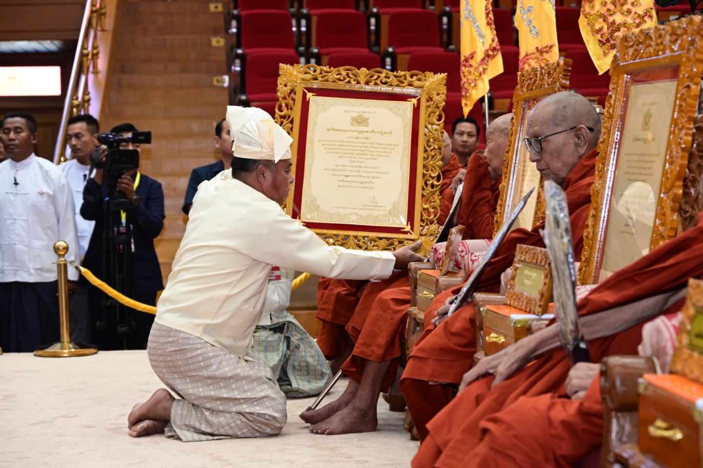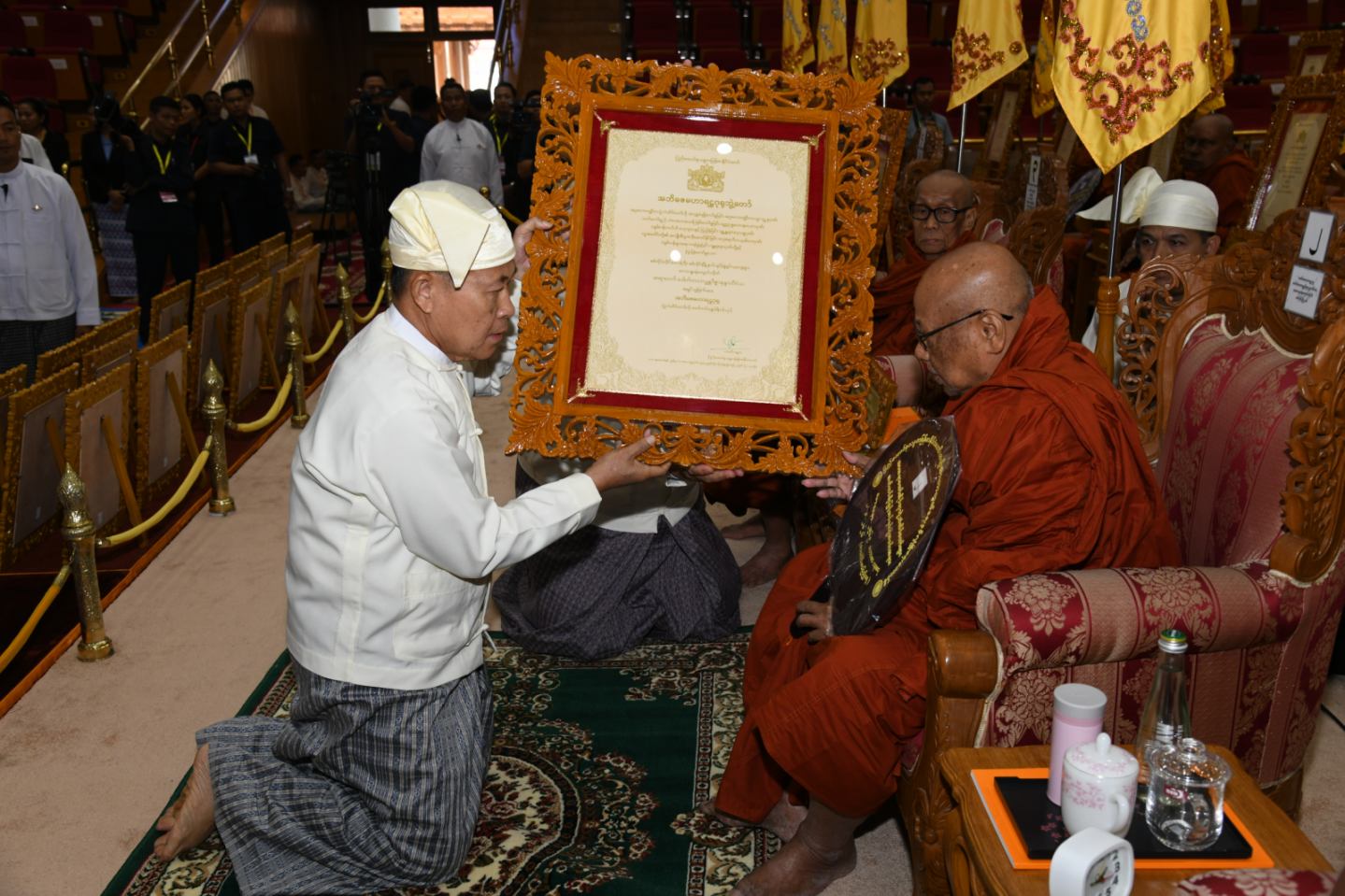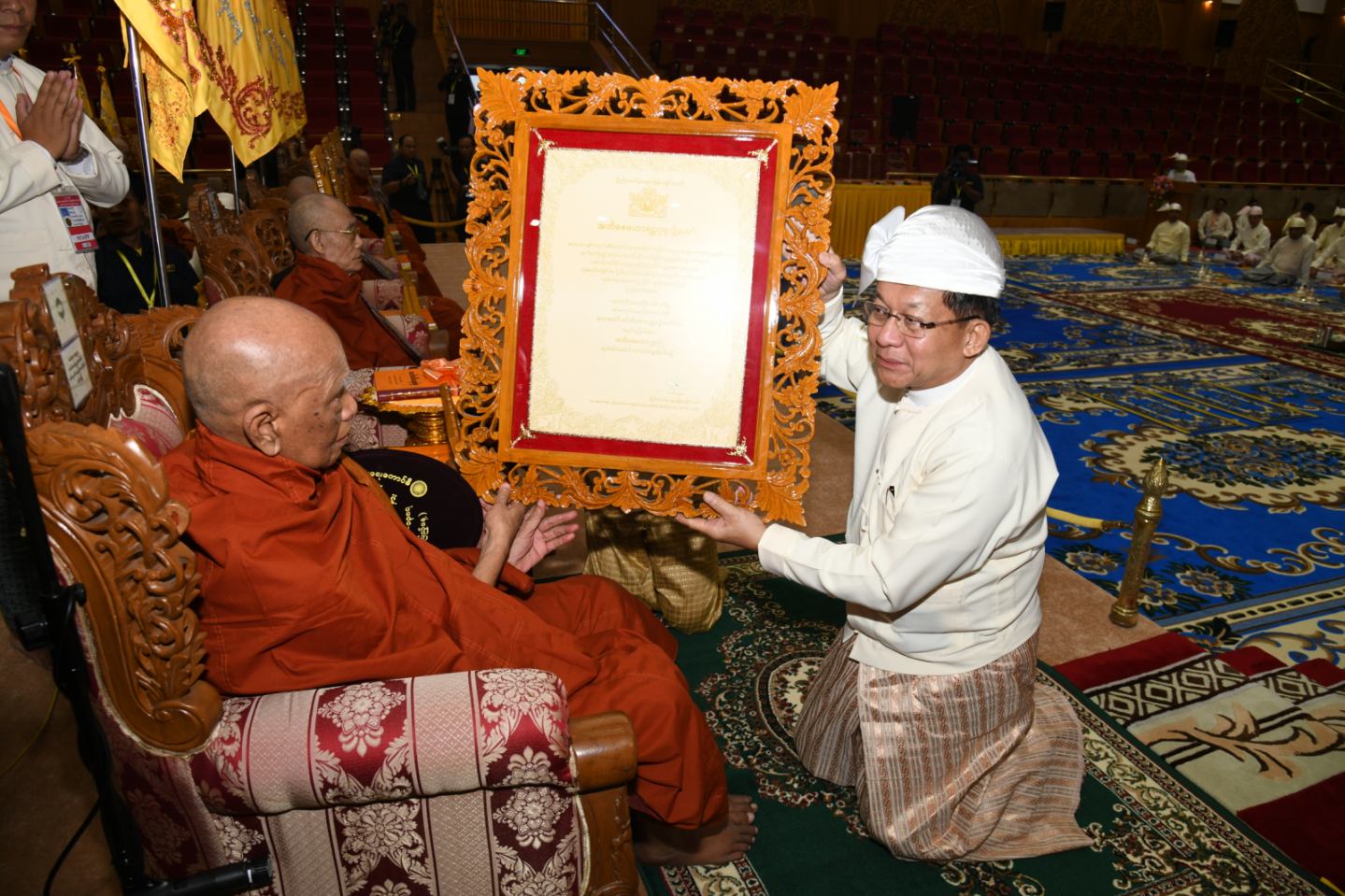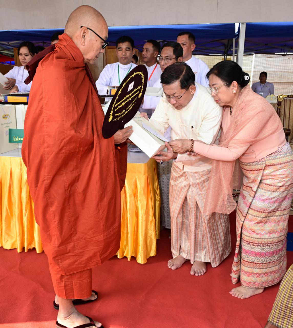 ဆက်လက်၍ ကော်မရှင်အဖွဲ့ဝင်များ၊ ပြည်ထောင်စုအဆင့်ပုဂ္ဂိုလ်များ၊ ပြည် ထောင်စုဝန်ကြီးများ၊ ကာကွယ်ရေးဦးစီးချုပ်ရုံးမှ အဆင့်မြင့်တပ်မတော်အရာရှိကြီး များနှင့် တာဝန်ရှိသူများက အဘိဓဇအဂ္ဂမဟာ သဒ္ဓမ္မ ဇောတိက၊ အဂ္ဂမဟာ ပဏ္ဍိတ၊ အဂ္ဂမဟာ သဒ္ဓမ္မဇောတိကဓဇ၊ အဂ္ဂမဟာ ဂန္ထဝါစက ပဏ္ဍိတ၊ အဂ္ဂမဟာ ကမ္မဋ္ဌာနာ စရိယ ဘွဲ့ရရှိသည့် ဆရာတော်ကြီးများထံ ဘွဲ့တံဆိပ်တော်နှင့် အဆောင်အယောင်များ ကို ဆက်ကပ်ပူဇော်ကြသည်။