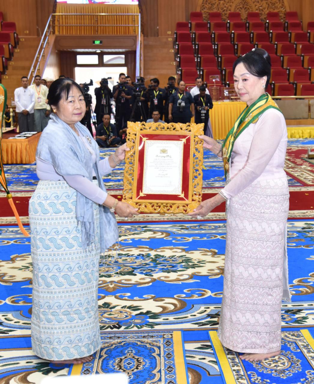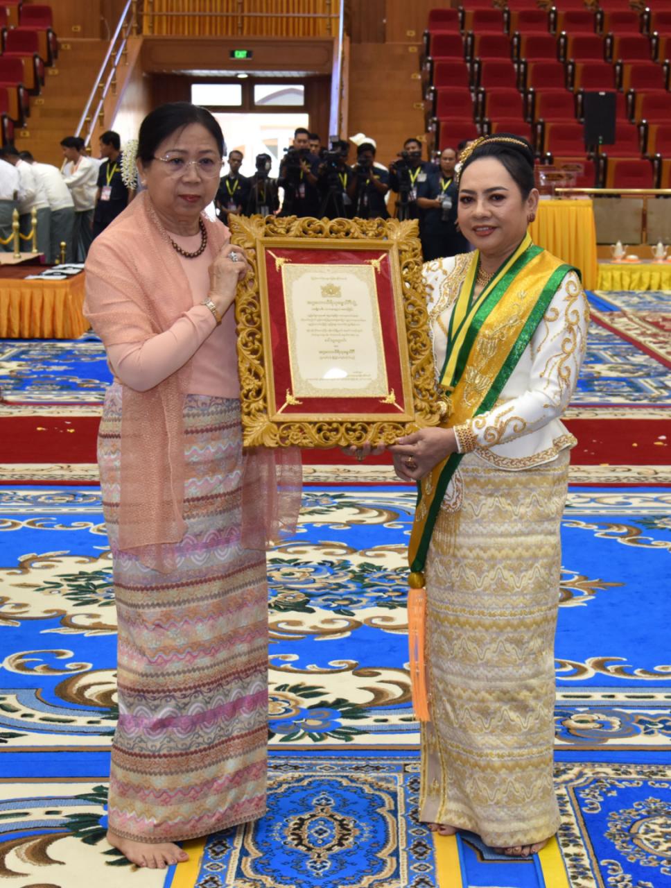 ထို့နောက် နိုင်ငံတော်ယာယီသမ္မတ နိုင်ငံတော်လုံခြုံရေးနှင့် အေးချမ်းသာယာ ရေးကော်မရှင်ဥက္ကဋ္ဌ၏ ဇနီးက အဂ္ဂမဟာသီရိသုဓမ္မသိင်္ဂီ ဘွဲ့ရရှိကြသည့် ဒေါက်တာ ဌေးဌေးခိုင် ၊ ဒေါ်ဌေးဌေးဝင်း၊ ဒေါ်ညွန့်ယဉ်ဝင်း၊ ဒေါ်သီတာအောင်၊ သီရိသုဓမ္မသိင်္ဂီ ဘွဲ့ ရရှိကြသည့် ဒေါ်နန်းအေခန့်၊ ဒေါ်ခင်သီတာ၊ သီဟသုဓမ္မသိင်္ဂီ ဘွဲ့ရရှိကြသည့် ဒေါ်စမ်းစမ်းအေး၊ ဒေါ်ဥမ္မာမြင့်၊ ဒေါ်နီလာ၊ ဒေါ်ဝါဝါသင်း၊ ဒေါ်သဉ္ဇာဝင်းစိန်၊ ဒေါက်တာ ဒေါ်နန်းကူးကူ၊ ဒေါ်သီတာလွင် တို့အားလည်းကောင်း၊ ကော်မရှင်ဒုတိယဥက္ကဋ္ဌ၏ ဇနီး က သီဟသုဓမ္မသိင်္ဂီဘွဲ့ရရှိကြသည့် ဒေါ်တင်မိုးနွယ်၊ ဒေါက်တာအေးခိုင်ညွန့်၊ ဒေါ်ခင်နှင်းဝေ၊ ဒေါ်မာလာတင့်၊ ဒေါက်တာ ဒေါ်တင်လင်းမြင့်၊ ဒေါ်ခင်လေးမြင့်၊ ဒေါ်ခင်လှဝင်း၊ ဒေါ်စုညွန့်ဦး၊ ဒေါ်သန်းသန်းအေး၊ ဒေါက်တာနန္ဒာမွှန်းနှင့် ဒေါ်ကြူကြူစိုး တို့အားလည်းကောင်း ဘွဲ့တံဆိပ်နှင့် အဆောင်အယောင်များကို ချီးမြှင့် အပ်နှင်းသည်။