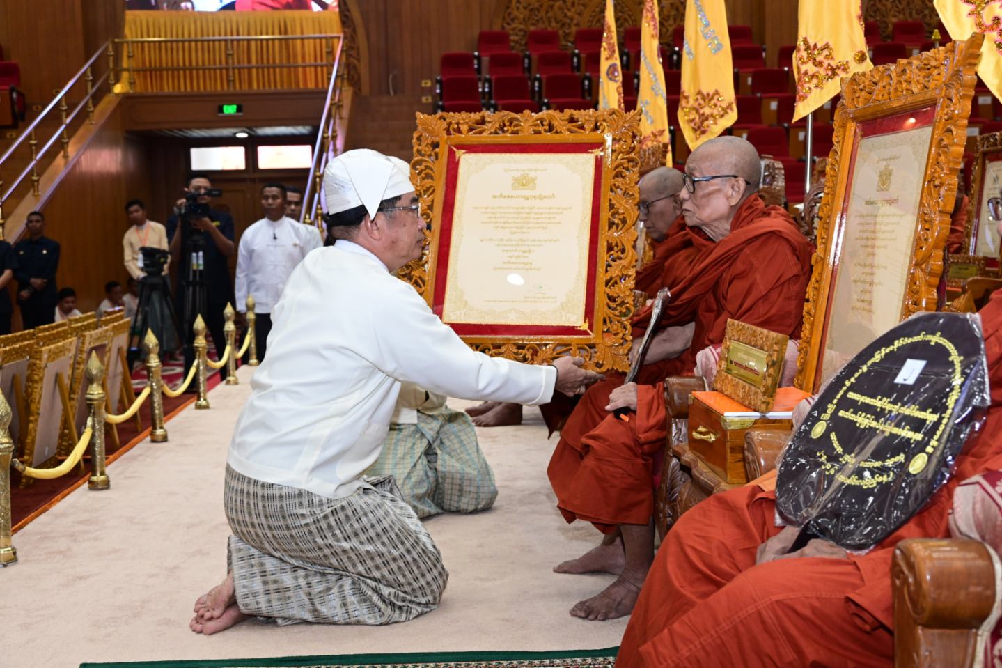 အခမ်းအနားသို့ နိုင်ငံတော်သံဃမဟာနာယကအဖွဲ့ ဥက္ကဋ္ဌ အဘိဓဇမဟာရဋ္ဌဂုရု အဂ္ဂမဟာသဒ္ဒမ္မဇောတိကဓဇ သန်လျင်မင်းကျောင်း ဆရာတော် ဒေါက်တာ ဘဒ္ဒန္တ စန္ဒိမာဘိဝံသနှင့် နိုင်ငံတော်သံဃမဟာနာယကအဖွဲ့ အကျိုးတော်ဆောင်၊ မန္တလေးမြို့၊ မစိုးရိမ်တိုက်သစ်မဟာနာယက၊ ဓမ္မသမိဒ္ဓိကျောင်း ဆရာတော် အဂ္ဂမဟာပဏ္ဍိတ အဂ္ဂမဟာသဒ္ဓမ္မဇောတိကဓဇ မဟာဓမ္မကထိက ဗဟုဇနဟိတဓရ ဘဒ္ဒန္တ ဝါသေဋ္ဌာ ဘိဝံသတို့အမှူးပြုသည့် ၂၀၂၆ ခုနှစ်၊ သာသနာတော်ဆိုင်ရာ ဘွဲ့တံဆိပ်တော်များ ဆက်ကပ်ကော်ရော် အပူဇော်ခံတော်မူကြမည့် ပြည်တွင်း၊ ပြည်ပဆရာတော်၊ သံဃာ တော်များနှင့် သီလရှင်ဆရာကြီးများ ကြွရောက်ချီးမြှင့်တော်မူကြပြီး နိုင်ငံတော်ယာယီ သမ္မတ နိုင်ငံတော်လုံခြုံရေးနှင့် အေးချမ်းသာယာရေးကော်မရှင် ဥက္ကဋ္ဌနှင့် ဇနီးတို့နှင့် အတူ ကော်မရှင်ဒုတိယဥက္ကဋ္ဌ ဒုတိယဗိုလ်ချုပ်မှူးကြီး စိုးဝင်းနှင့်ဇနီး ဒေါ်သန်းသန်းနွယ်၊ ကော်မရှင်အဖွဲ့ဝင် နိုင်ငံတော်ဝန်ကြီးချုပ် ဦးညိုစောနှင့်ဇနီး၊ ကော်မရှင်အဖွဲ့ဝင် အမှုဆောင်ချုပ် ဦးအောင်လင်းဒွေးနှင့်ဇနီး၊ ကော်မရှင်အတွင်းရေးမှူး ဗိုလ်ချုပ်ကြီး ရဲဝင်းဦးနှင့်ဇနီး၊ ကော်မရှင်အဖွဲ့ဝင်များနှင့် ဇနီးများ၊ ပြည်ထောင်စုအဆင့်ပုဂ္ဂိုလ် များ၊ ပြည်ထောင်စုဝန်ကြီးများနှင့် ဇနီးများ၊ နေပြည်တော်ကောင်စီဥက္ကဋ္ဌ၊ ကာကွယ် ရေးဦးစီးချုပ်ရုံးမှ အဆင့်မြင့်တပ်မတော်အရာရှိကြီးများနှင့် ဇနီးများ၊ နေပြည်တော် တိုင်း စစ်ဌာနချုပ် တိုင်းမှူးနှင့် တာဝန်ရှိသူများ၊ သာသနာ နုဂ္ဂဟဘွဲ့တံဆိပ်ရ လူပုဂ္ဂိုလ်များ တက်ရောက် ကြည်ညိုကြသည်။