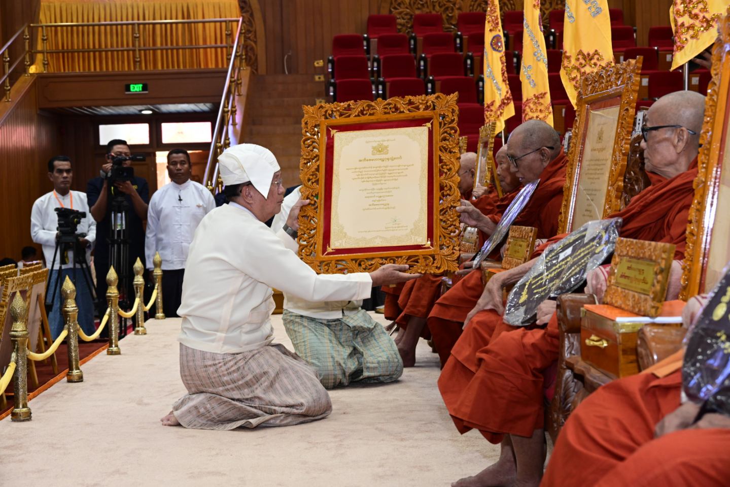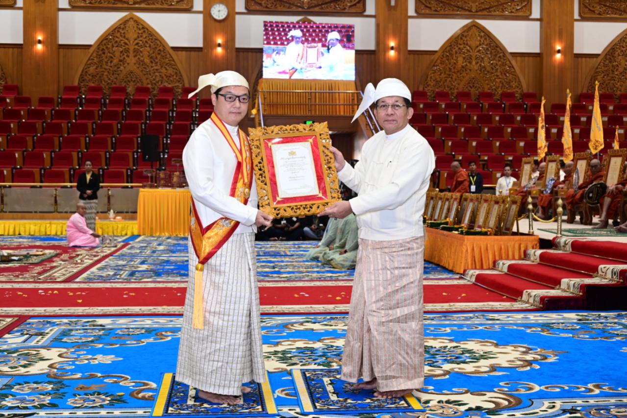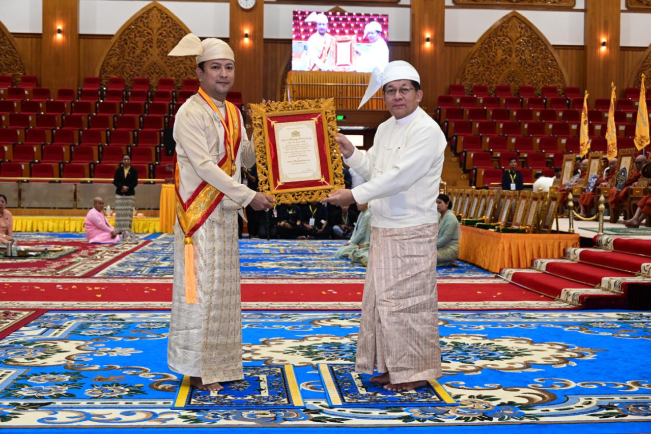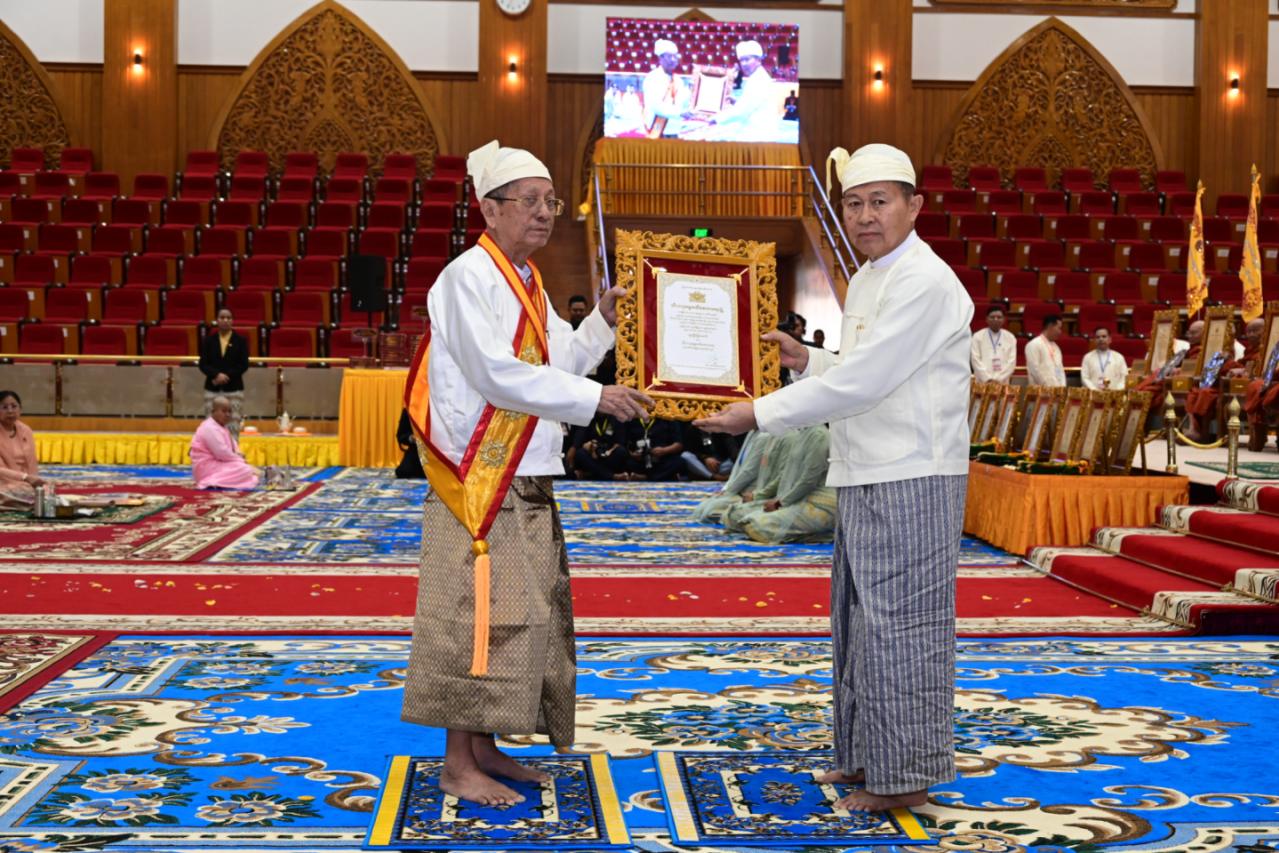 ဆက်လက်၍ သာသနာနုဂ္ဂဟဘွဲ့တံဆိပ်များကို ချီးမြှင့်အပ်နှင်းရာ နိုင်ငံတော် ယာယီသမ္မတ နိုင်ငံတော်လုံခြုံရေးနှင့် အေးချမ်းသာယာရေးကော်မရှင်ဥက္ကဋ္ဌက အဂ္ဂ မဟာသီရိသုဓမ္မ မဏိဇောတဓရ ဘွဲ့ရရှိသည့် ဦးကျော်စိုးဝင်း(ခ) ဦးခန့်စည်သူ၊ သီရိသုဓမ္မ မဏိဇောတဓရ ဘွဲ့ရရှိကြသည့် ဦးဇော်လတ်နှင့် ဦးတင်မောင်ဝင်းတို့အား ဘွဲ့တံဆိပ်နှင့် အဆောင်အယောင်များ ချီးမြှင့်အပ်နှင်းသည်။
