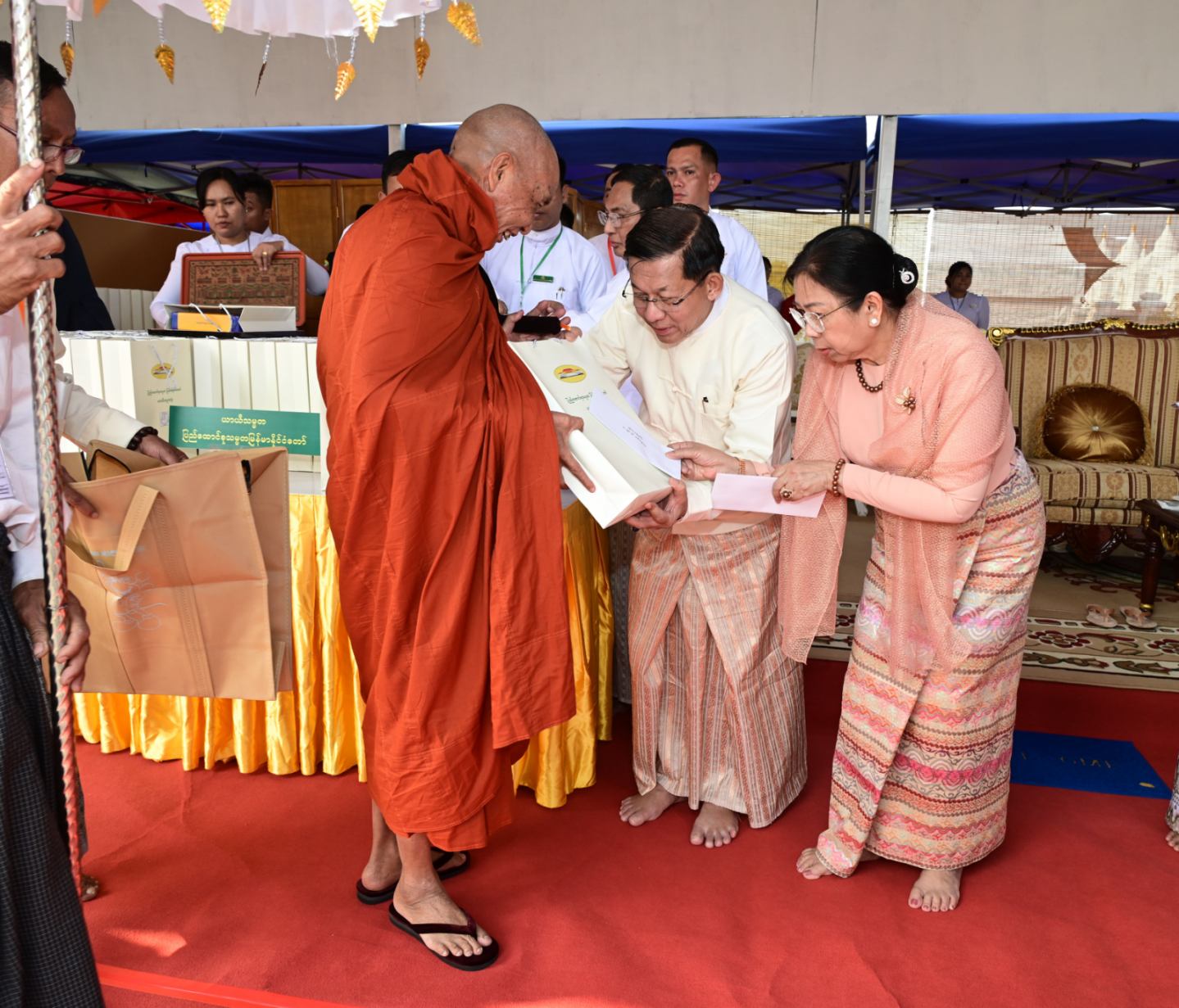 ထို့နောက် နိုင်ငံတော်ယာယီသမ္မတ နိုင်ငံတော်လုံခြုံရေးနှင့် အေးချမ်းသာယာ ရေးကော်မရှင်ဥက္ကဋ္ဌနှင့် ဇနီး၊ ဧည့်ပရိသတ်များက နိုင်ငံတော်သံဃမဟာနာယက အဖွဲ့ဥက္ကဋ္ဌ သန်လျင်မင်းကျောင်း ဆရာတော်ဘုရားကြီးထံမှ ကိုးပါးသီလခံယူဆောက် တည်ကြသည်။