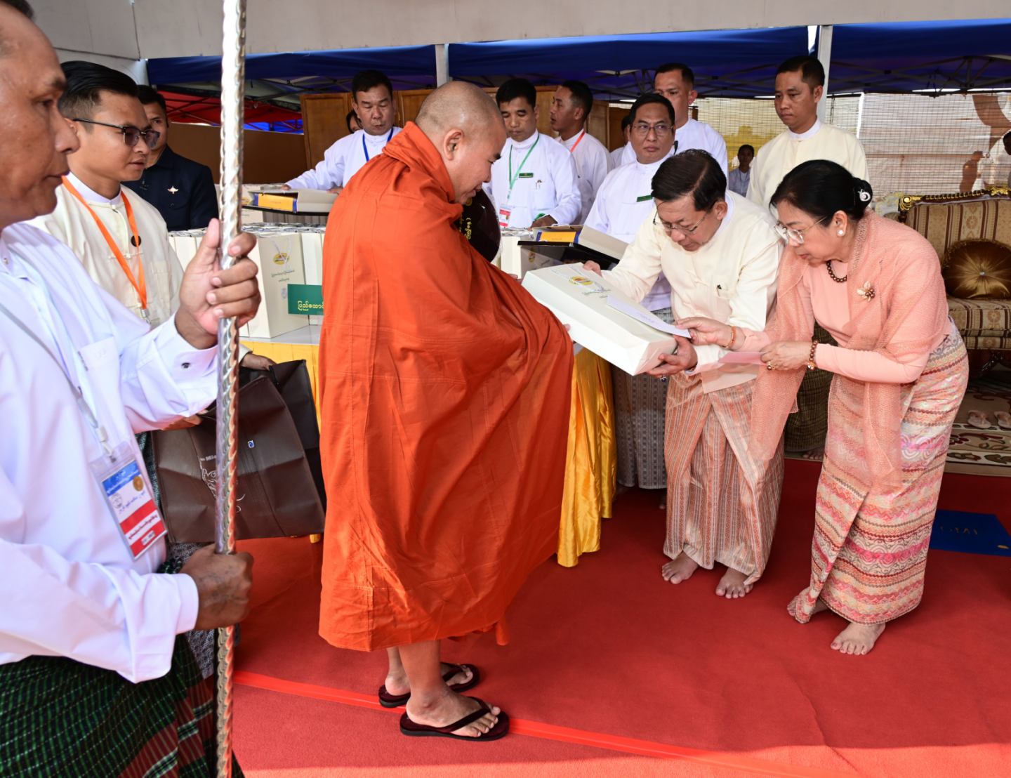 ယင်းနောက် နိုင်ငံတော်ယာယီသမ္မတ နိုင်ငံတော်လုံခြုံရေးနှင့် အေးချမ်းသာယာ ရေးကော်မရှင်ဥက္ကဋ္ဌ၏ ဇနီးက အဂ္ဂမဟာဂန္ထဝါစကပဏ္ဍိတ ဘွဲ့တံဆိပ်တော်ရ စစ်ကိုင်း တိုင်းဒေသကြီး၊ စစ်ကိုင်းမြို့၊ သမိဒ္ဓေါဒယသီရှင်စာသင်တိုက် သီလရှင်ဆရာကြီး ဒေါ်ကလျာသိင်္ဂီထံ ဘွဲ့တံဆိပ်တော်နှင့် အဆောင်အယောင်များဆက်ကပ်ပူဇော်သည်။