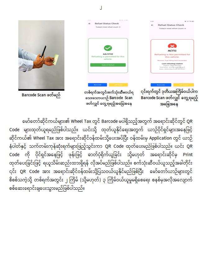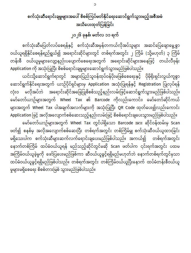 ယင်းသို့ဆောင်ရွက်ရာတွင် အများပြည်သူဝန်ထုပ်ဝန်ပိုးမဖြစ်စေရေးနှင့် ပိုမိုရိုးရှင်းလွယ်ကူစွာ ဆောင်ရွက်နိုင်ရေးအတွက် ယာဉ်ပိုင်ရှင်များမှ Application အသုံးပြုရန်နှင့် Registration ပြုလုပ်ရန် လုံးဝ မလိုအပ်ဘဲ အရောင်းဆိုင်အခြေပြုစိစစ်သည့်နည်းလမ်းဖြင့်ဆောင်ရွက်သွားမည်ဖြစ်ပါသည်။ မော်တော်ယာဉ်များအတွက် Wheel Tax ၏ Barcode ကိုလည်းကောင်း၊ မော်တော်ဆိုင်ကယ် များအတွက် Wheel Tax ပါအချက်အလက်များကို အသုံးပြုပြီး QR Code ထုတ်ပေး၍လည်းကောင်း Application ဖြင့် အလိုအလျောက်စစ်ဆေးသည့်နည်းလမ်းဖြင့် စိစစ်ရောင်းချပေးသွားမည်ဖြစ်ပါသည်။