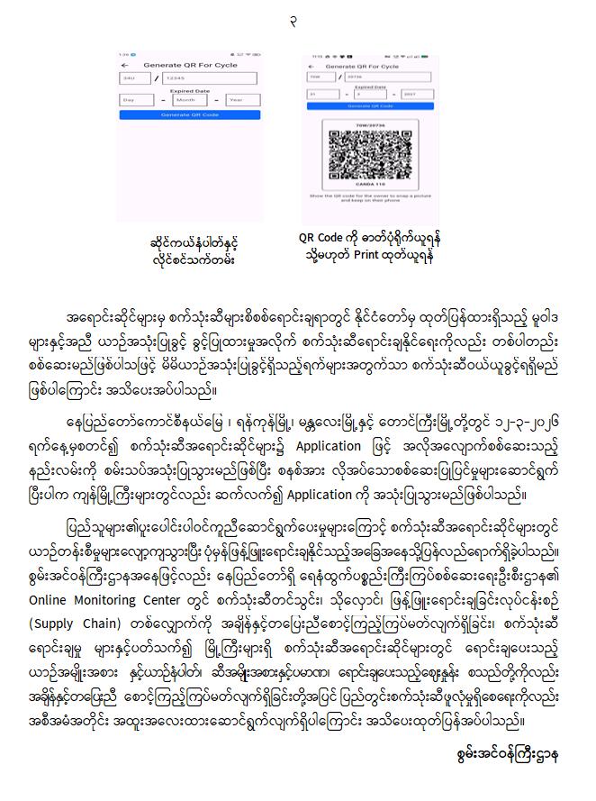 အရောင်းဆိုင်များမှ စက်သုံးဆီများစိစစ်ရောင်းချရာတွင် နိုင်ငံတော်မှ ထုတ်ပြန်ထားရှိသည့် မူဝါဒ များနှင့်အညီ ယာဉ်အသုံးပြုခွင့် ခွင့်ပြုထားမှုအလိုက် စက်သုံးဆီရောင်းချနိုင်ရေးကိုလည်း တစ်ပါတည်း စစ်ဆေးမည်ဖြစ်ပါသဖြင့် မိမိယာဉ်အသုံးပြုခွင့်ရှိသည့်ရက်များအတွက်သာ စက်သုံးဆီဝယ်ယူခွင့်ရရှိမည် ဖြစ်ပါကြောင်း အသိပေးအပ်ပါသည်။