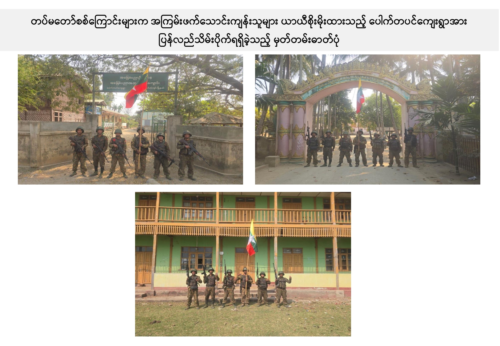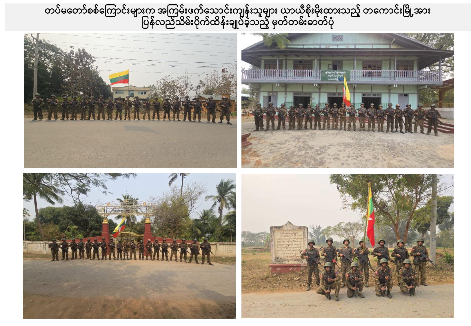 ဆက်လက်၍ တပ်မတော်စစ်ကြောင်းများအနေဖြင့် အကြမ်းဖက် သောင်းကျန်းသူများ ယာယီစိုးမိုးထားသည့် တကောင်းမြို့အား ပြန်လည်သိမ်းပိုက် ထိန်းချုပ်နိုင်ရေးအတွက် လိုအပ်သည့် ပြင်ဆင်စုဖွဲ့မှုများ ဆောင်ရွက်၍ သပိတ်ကျင်း မြို့နှင့် တကောင်းမြို့အကြား ခိုအောင်းလှုပ်ရှားလျက်ရှိသည့် အကြမ်းဖက် သောင်းကျန်းသူများအား စစ်ကြောင်းများခွဲပြီး ၂၀၂၆ ခုနှစ်၊ ဖေဖော်ဝါရီ ၆ ရက်မှစ၍ နယ်မြေရှင်းလင်းရေးလုပ်ငန်းများကို ဟန်ချက်ညီညီ ဆောင်ရွက်ခဲ့ရာ ဖေဖော်ဝါရီ ၁၃ ရက်နေ့တွင် အကြမ်းဖက်သောင်းကျန်းသူများ ထိန်းချုပ်ထားသည့် သပိတ်ကျင်း မြို့နယ်အတွင်းရှိ ရေချမ်းစဉ်ကျေးရွာ ၊ ဖေဖော်ဝါရီ ၁၅ ရက်နေ့တွင် ရှားတောကျေးရွာ၊ ဖေဖော်ဝါရီ ၁၇ ရက်နေ့တွင် ဗနွဲ့ကျေးရွာ၊ ဖေဖော်ဝါရီ ၁၈ ရက်နေ့တွင် ဒေါင်းပုန်း ကျေးရွာ၊ ဖေဖော်ဝါရီ ၂၁ ရက်နေ့တွင် ရွှေကျွန်းပင်ကျေးရွာ၊ ဖေဖော်ဝါရီ ၂၂ ရက်နေ့ တွင် ပေါက်တပင်ကျေးရွာ၊ ဖေဖော်ဝါရီ ၂၄ ရက်နေ့တွင် သီးကုန်းကျေးရွာ၊ ဖေဖော်ဝါရီ ၂၅ ရက်နေ့တွင် ဝါးရုံးကုန်းကျေးရွာ၊ ဖေဖော်ဝါရီ ၂၆ ရက်နေ့တွင် ရွှေစကာကျေးရွာ၊ ဖေဖော်ဝါရီ ၂၇ ရက်နေ့တွင် မြင်သာကျေးရွာနှင့် ကြာညှပ်ကျေးရွာ၊ ဖေဖော်ဝါရီ ၂၈ ရက်နေ့တွင် ကိုးပင်ကျေးရွာနှင့် ပုတီးဖြူကျေးရွာ၊ မတ် ၂ ရက်နေ့တွင် မင်းကုန်း ကျေးရွာ၊ မတ် ၄ ရက်နေ့တွင် ဆယ်ဇင်းကုန်းကျေးရွာ၊ မတ် ၅ ရက်နေ့တွင် လက်ပန့်ကုန်းကျေးရွာ၊ မတ် ၇ ရက်နေ့တွင် ရေယာဉ်ကျေးရွာ၊ မတ် ၈ ရက်နေ့တွင် ဝဲကြီးကျေးရွာနှင့် ပေါ်တော်မူကျေးရွာ၊ မတ် ၉ ရက်နေ့တွင် မန်ကျည်းကုန်းကျေးရွာနှင့် ဆင်ညှပ်ကုန်းကျေးရွာ၊ မတ် ၁၀ ရက်နေ့တွင် တကောင်းလမ်းဆုံနှင့် ညောင်လေးပင် ကျေးရွာများအား အသီးသီး ပြန်လည်သိမ်းပိုက်နိုင်ခဲ့ပြီး မတ် ၁၂ ရက် နေ့ ယနေ့တွင် တကောင်းမြို့အား တပ်မတော်က အလုံးစုံပြန်လည်သိမ်းပိုက်ထိန်းချုပ် နိုင်ခဲ့သည်။