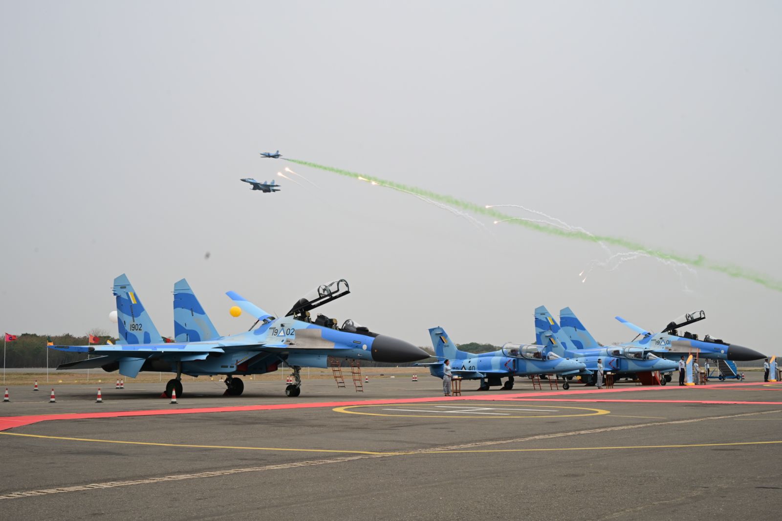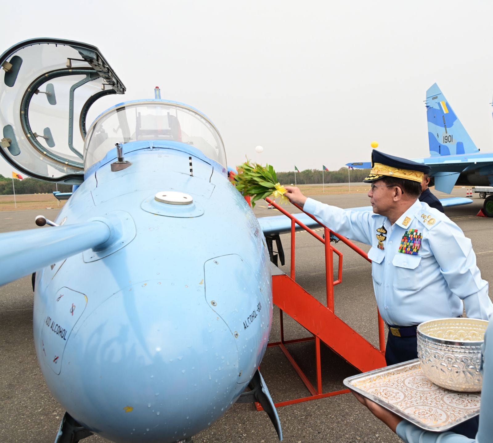 ထို့နောက် နိုင်ငံတော်လုံခြုံရေးနှင့် အေးချမ်းသာယာရေးကော်မရှင် ဥက္ကဋ္ဌ တပ်မတော်ကာကွယ်ရေးဦးစီးချုပ်နှင့် အဖွဲ့ဝင်များသည် တပ်တော်ဝင်လေယာဉ်များ အား အမွှေးနံ့သာရည်များပက်ဖျန်းပေးပြီး တပ်တော်ဝင်လေယာဉ်များအား လှည့်လည် ကြည့်ရှုကြပြီး စုပေါင်းမှတ်တမ်းတင်ဓာတ်ပုံရိုက်ကူးကြသည်။