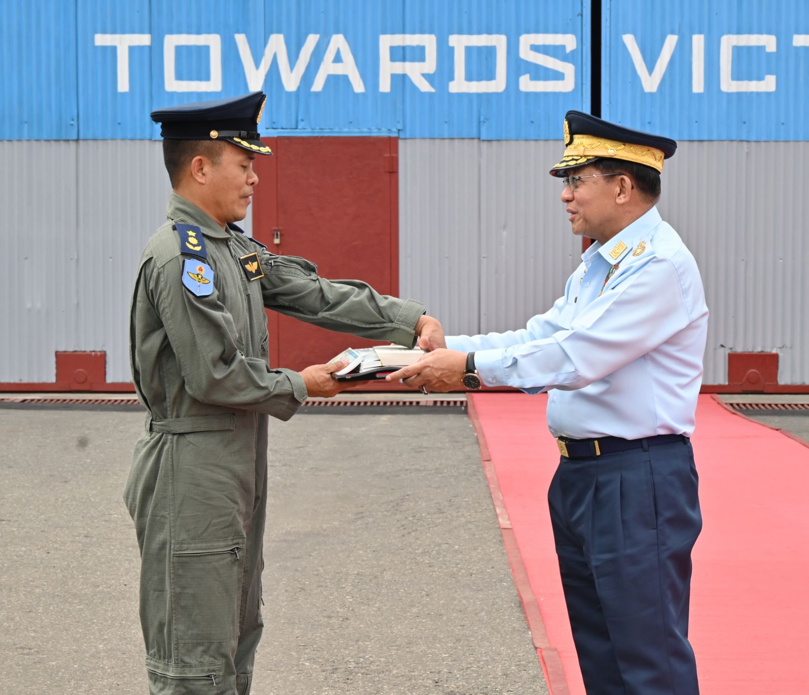 ၎င်းနောက် နိုင်ငံတော်လုံခြုံရေးနှင့် အေးချမ်းသာယာရေးကော်မရှင် ဥက္ကဋ္ဌ ဥက္ကဌ တပ်မတော်ကာကွယ်ရေးဦးစီးချုပ် ဗိုလ်ချုပ်မှူးကြီး မင်းအောင်လှိုင်ထံ ကာကွယ်ရေးဦးစီးချုပ် (လေ) ဗိုလ်ချုပ်ကြီး ထွန်းအောင်က လေယာဉ်၊ ရဟတ်ယာဉ် များ တပ်တော်ဝင်အထိမ်းအမှတ် အမှတ်တရလက်ဆောင်ပစ္စည်းများကို ဂါရဝပြု ပေးအပ်သည်။