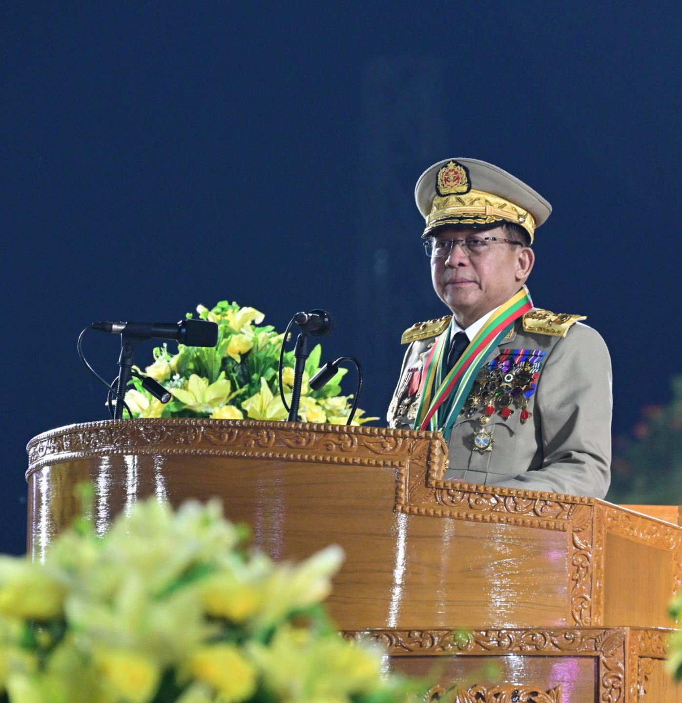 (၈၁)နှစ်မြောက် တပ်မတော်နေ့စစ်ရေးပြအခမ်းအနားကို ယနေ့ညပိုင်းတွင် နေပြည်တော်စစ်ရေးပြကွင်း၌ ကျင်းပပြုလုပ်ရာ နိုင်ငံတော်လုံခြုံရေးနှင့်အေးချမ်း သာယာရေးကော်မရှင်ဥက္ကဋ္ဌ တပ်မတော်ကာကွယ်ရေးဦးစီးချုပ် ဗိုလ်ချုပ်မှူးကြီး သတိုးမဟာသရေစည်သူ သတိုးသီရိသုဓမ္မ မင်းအောင်လှိုင် တက်ရောက် မိန့်ခွန်း ပြောကြားသည်။