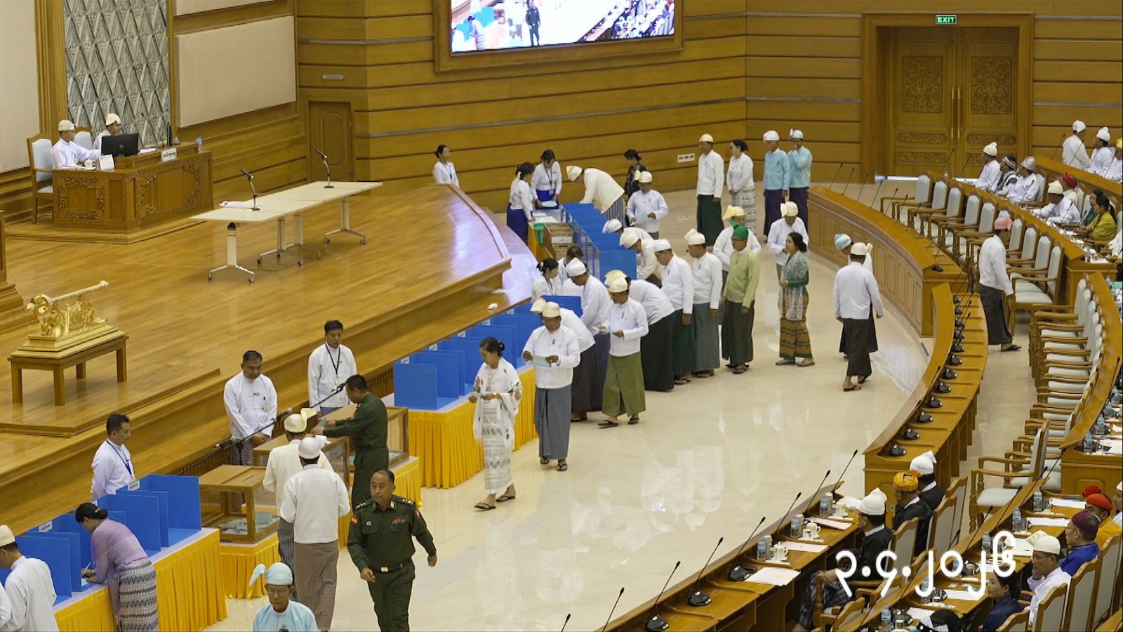 ဆက်လက်၍ ပြည်ထောင်စုလွှတ်တော်နာယက၊ ပြည်သူ့လွှတ်တော်ဥက္ကဋ္ဌ၊ ပြည်ထောင်စုလွှတ်တော် ဒုတိယနာယက၊ ပြည်သူ့လွှတ်တော်ဒုတိယဥက္ကဋ္ဌနှင့် နိုင်ငံတော်သမ္မတ ရွေးချယ်တင်မြှောက်ရေးအဖွဲ့ဝင်များသည် ပြည်ထောင်စုလွှတ်တော် ရုံး ဝန်ထမ်းများထံမှ ဆန္ဒမဲလက်မှတ်များကို တစ်ဦးချင်းလက်မှတ်ရေး ထိုးထုတ်ယူကြ ပြီး သတ်မှတ်ထားသည့်နေရာတွင် လျှို့ဝှက်ဆန္ဒပြုကာ ဆန္ဒမဲပုံးများအတွင်းသို့ ဆန္ဒမဲ လက်မှတ်များ ထည့်ကြသည်။