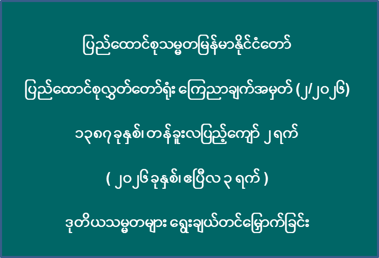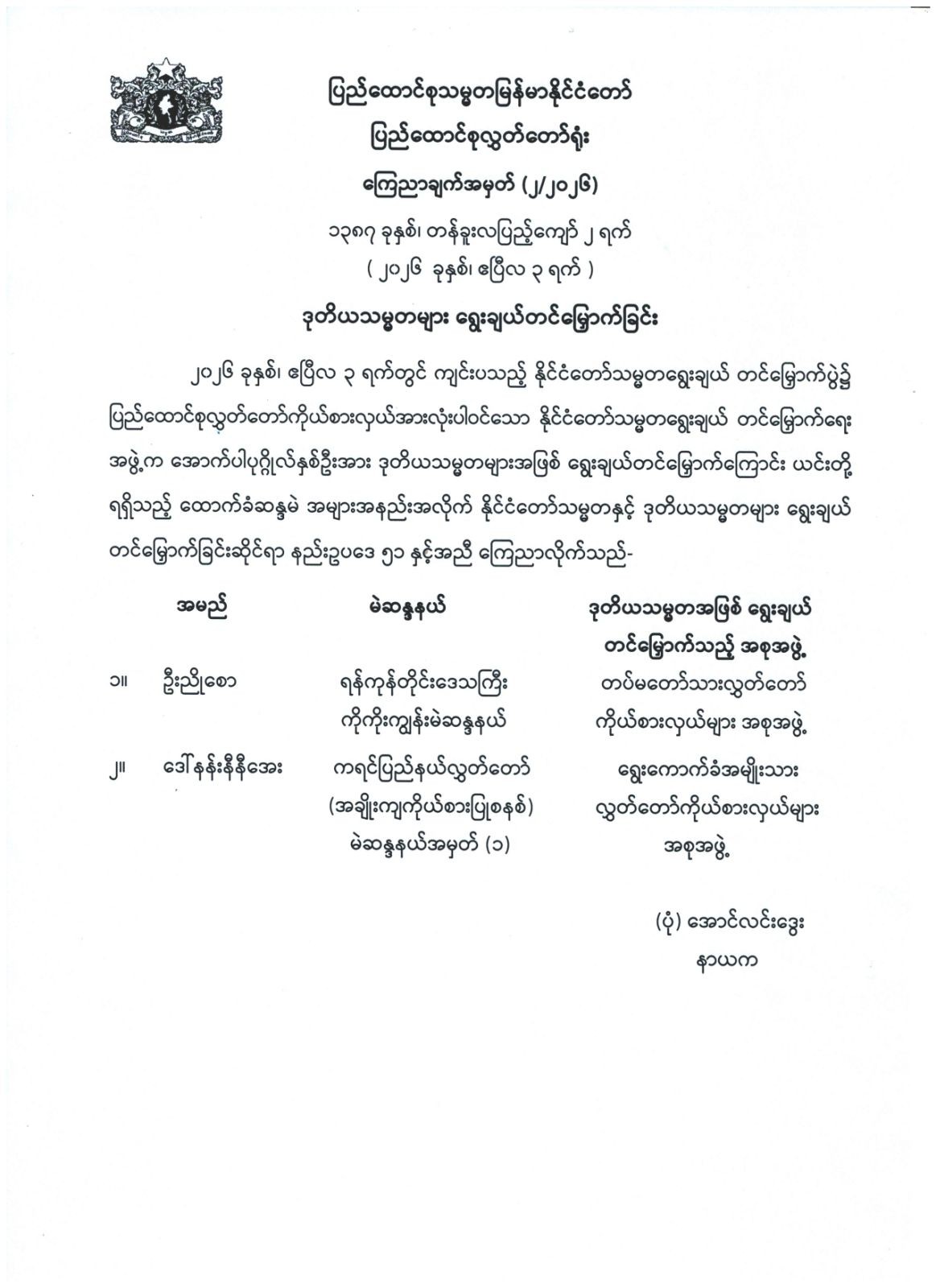 ပြည်ထောင်စုသမ္မတမြန်မာနိုင်ငံတော် ပြည်ထောင်စုလွှတ်တော်ရုံး ကြေညာချက်အမှတ် (၂/၂၀၂၆) ၁၃၈၇ ခုနှစ်၊ တန်ခူးလပြည့်ကျော် ၂ ရက် ( ၂၀၂၆ ခုနှစ်၊ ဧပြီလ ၃ ရက် ) ဒုတိယသမ္မတများ ရွေးချယ်တင်မြှောက်ခြင်း