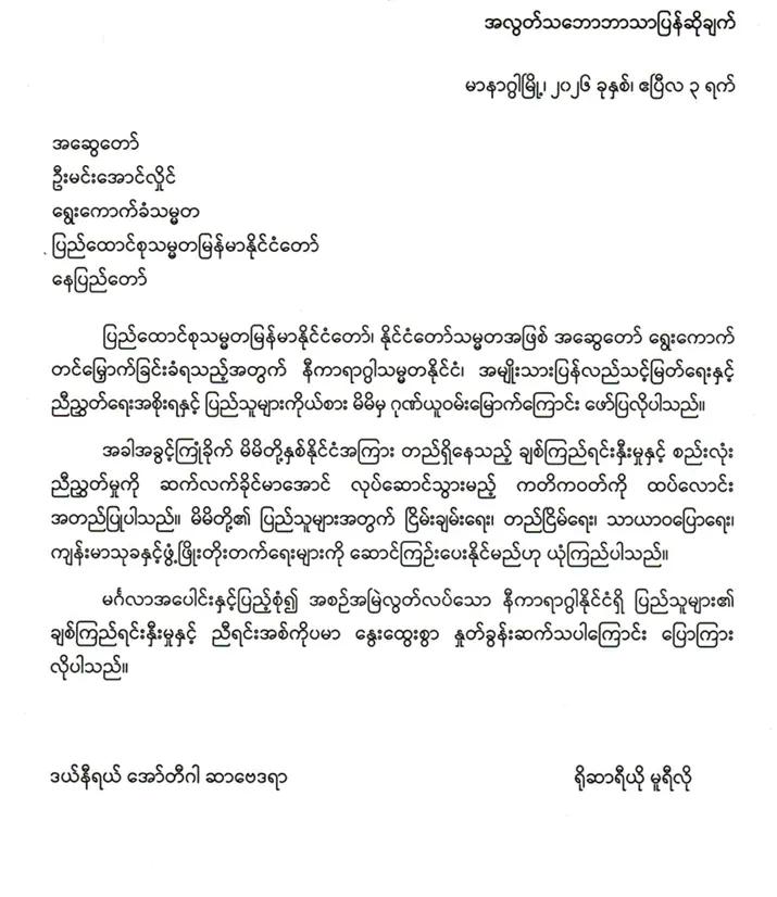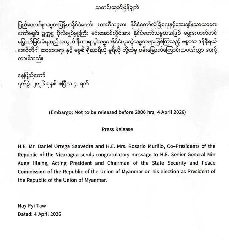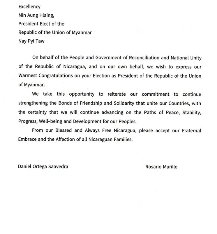 နီကာရာဂွွါသမ္မတနိုင်ငံမှ ဝမ်းမြောက်ကြောင်း သဝဏ်လွှာပေးပို့ အေပြီ ၄