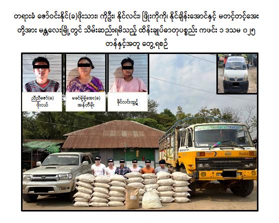 ကွင်းဆက်ဖော်ထုတ်ချက်အရ ဖမ်းဆီးရမိကဖင်းများအား စစ်ကိုင်းတိုင်းဒေသကြီး၊ ကလေးမှ မန္တလေးသို့ NISSAN ၆ ဘီးယာဉ်ဖြင့် သယ်ဆောင်ခဲ့ကြသည့် ယာဉ်ပိုင်ရှင် မတင့်တင့်အေး၊ နိုင်လင်း၊ ဖြိုးကိုကိုနှင့် နိုင်ချိန်းအောင်တို့ ၄ ဦးအား မန္တလေးမြို့၌ ဆက်လက်ဖမ်းဆီးရမိခဲ့ပါသည်။