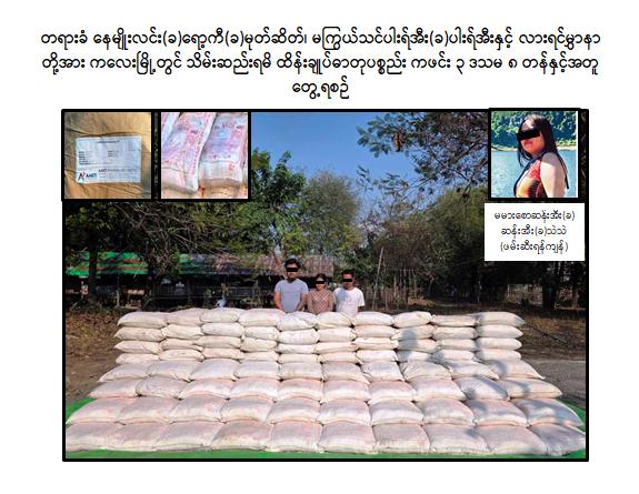 မန္တလေးနှင့် ကလေးမြို့တို့တွင် တရားမဝင်သယ်ဆောင်ရောင်းဝယ်သည့် ငွေကျပ် ၁ ဘီလီယံ ကျော်တန်ဖိုးရှိ ထိန်းချုပ်ဓာတုပစ္စည်း ကဖင်း ၄ ဒသမ ၈ တန်ကျော်ဖမ်းဆီးရမိ