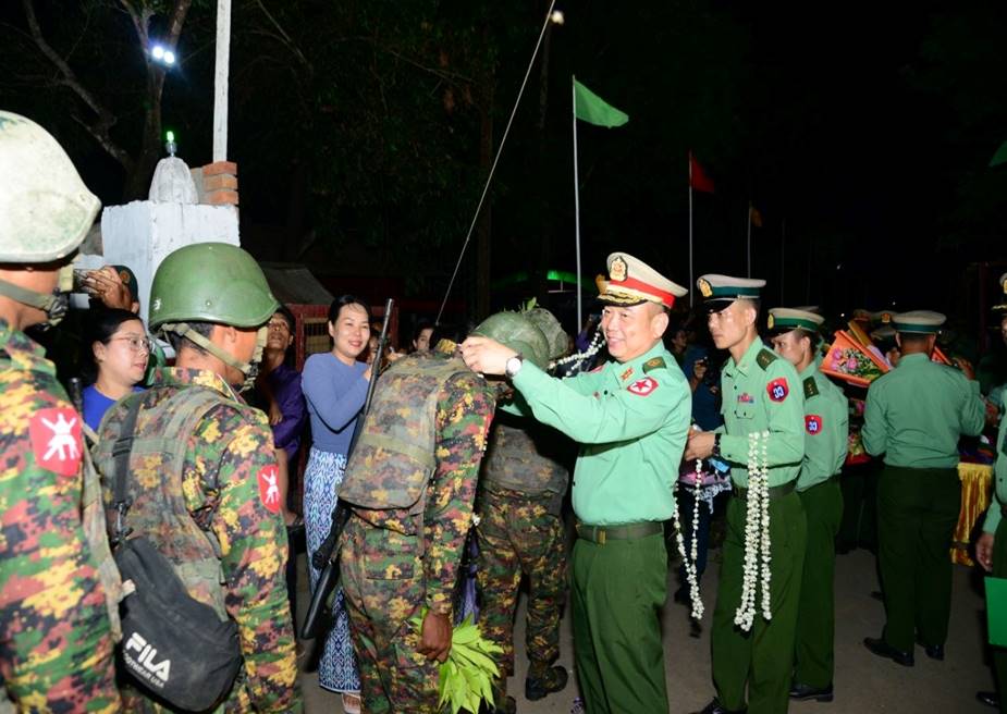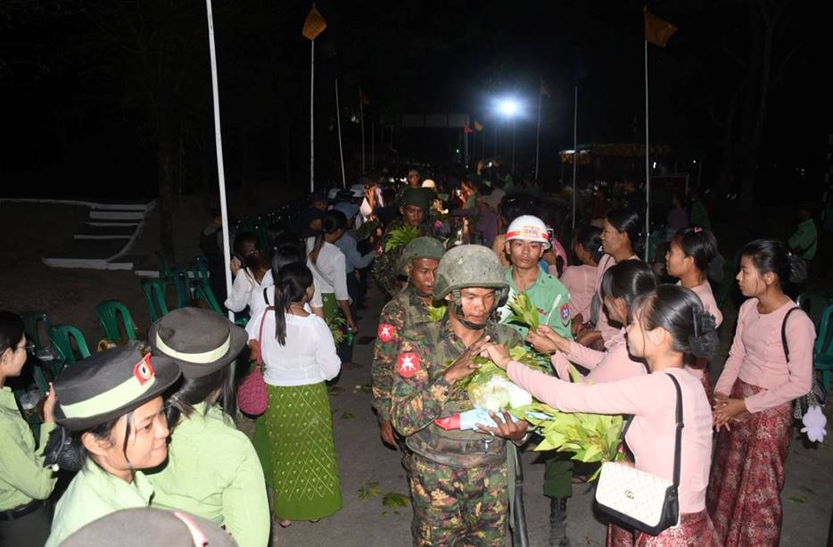 တိုင်းဒေသကြီးနှင့်ပြည်နယ်အသီးသီးရှိ တိုင်းရင်းသားပြည်သူများ စိတ်အေး ချမ်းသာစွာ နေထိုင်လုပ်ကိုင်စားသောက်နိုင်ရေးနှင့် အသက်အိုးအိမ်စည်းစိမ်ဥစ္စာ လုံခြုံမှုရှိစေရေး၊ နိုင်ငံတော်တည်ငြိမ်ရေး၊ နယ်မြေအေးချမ်းရေးအတွက် ရှေ့တန်း စစ်မျက်နှာများတွင် စစ်ဆင်ရေးတာဝန်များကို နေ့မအားညမနားစွမ်းစွမ်းတမံ တာဝန် ထမ်းဆောင်ခဲ့သော ရှေ့တန်းပြန် တပ်မတော်သားများအား တိုင်းမှူးနှင့် တက်ရောက် လာကြသူများက အောင်သပြေခက်များဖြင့်လည်းကောင်း၊ အိုးစည်ဒိုးပတ် အတီး၊ အမှုတ်၊ အက၊ အခုန်များဖြင့်လည်းကောင်း ဝမ်းမြောက်စွာ သောင်းသောင်းဖြဖြ ကြိုဆိုဂုဏ်ပြုခဲ့ကြပြီး တိုင်းမှူးက အောင်ပွဲရရှေ့တန်းပြန်တပ်မတော်သားများအား ဂုဏ်ပြုချီးမြှင့်ငွေများ ပေးအပ်ခဲ့ကြောင်း သတင်းရရှိသည်။