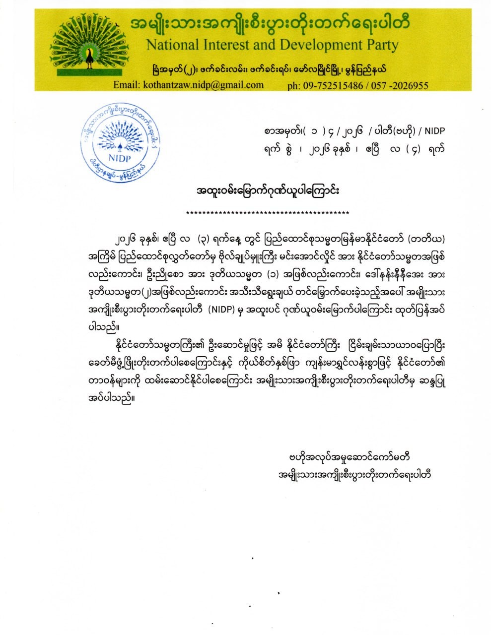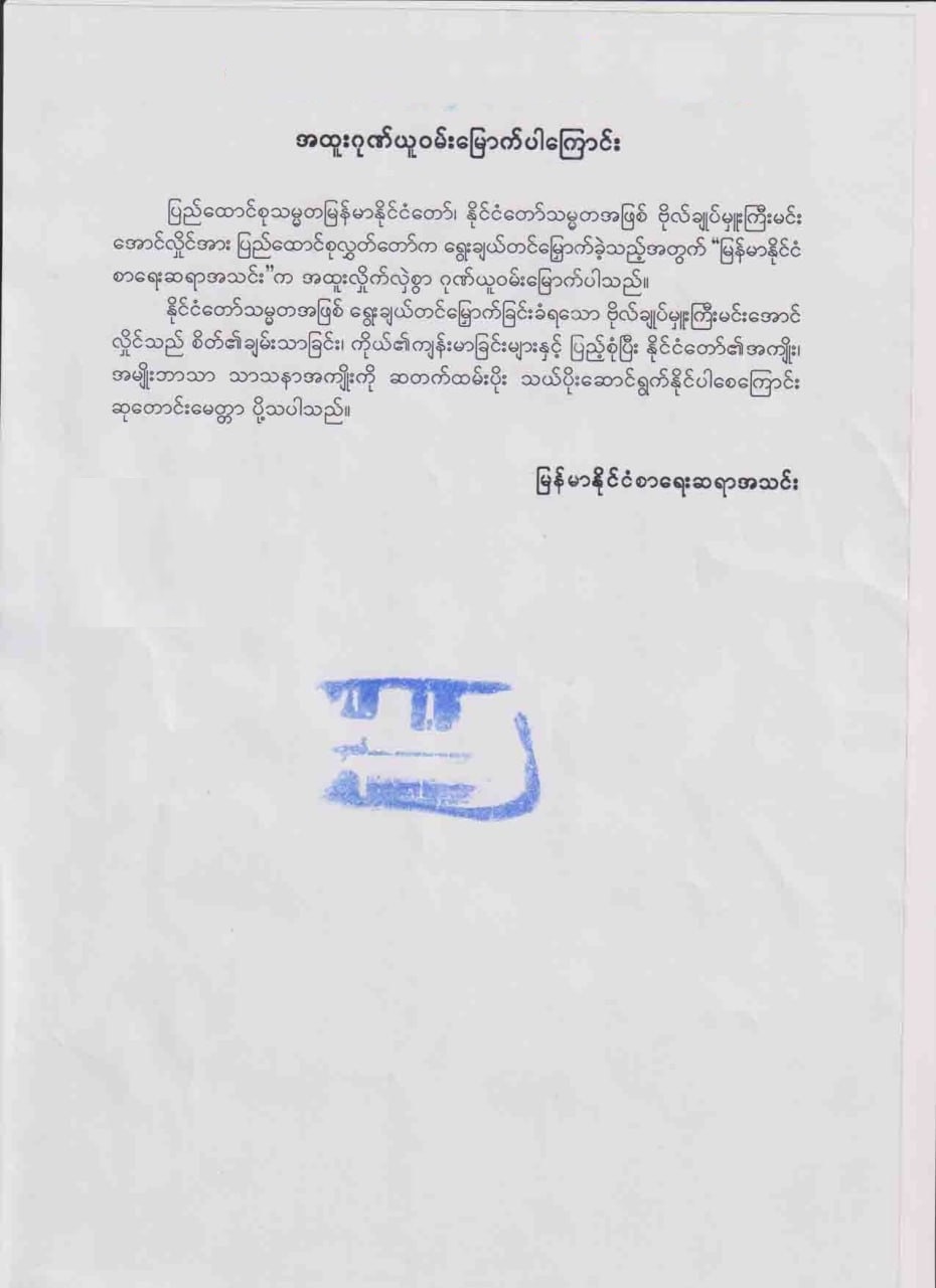 အဆိုပါ ထုတ်ပြန်ကြေညာချက်များတွင် ပြည်ထောင်စုသမ္မတမြန်မာနိုင်ငံတော် နိုင်ငံတော်သမ္မတအဖြစ် ဗိုလ်ချုပ်မှူးကြီး မင်းအောင်လှိုင်အား ပြည်ထောင်စုလွှတ်တော် က ရွေးချယ်တင်မြှောက်ခဲ့သည့်အတွက် အထူးလှိုက်လဲစွာဂုဏ်ယူဝမ်းမြောက်ပါကြောင်း၊ နိုင်ငံတော်သမ္မတကြီး၏ ဦးဆောင်မှုဖြင့် အမိနိုင်ငံတော်ကြီး ငြိမ်းချမ်းသာယာဝပြောပြီး ခေတ်မီဖွံ့ဖြိုးတိုးတက်ပါစေကြောင်း၊နိုင်ငံတော်သမ္မတ ဦးဆောင်မည့် ပြည်ထောင်စု အစိုးရ အဖွဲ့က နိုင်ငံတော်နှင့် တိုင်းရင်းသားမိဘပြည်သူလူထုအကျိုးတို့ကို အောင်မြင်စွာ သည်ပိုးနိုင်လိမ့်မည်ဟု အပြည့်အဝယုံကြည်ကြောင်း၊ နိုင်ငံတော်သမ္မတအဖြစ် ရွေးချယ် တင်မြောက်ခြင်းခံရသော ဗိုလ်ချုပ်မှူးကြီး မင်းအောင်လှိုင် သည် စိတ်၏ချမ်းသာခြင်း၊ ကိုယ်၏ကျန်းမာခြင်းများနှင့်ပြည့်စုံပြီး နိုင်ငံတော်၏အကျိုး၊ အမျိုးဘာသာသာသနာ အကျိုးကို ဆထက်ထမ်းပိုးသယ်ပိုးဆောင်ရွက်နိုင်ပါစေကြောင်း စသည်ဖြင့် ပါရှိကြောင်း သိရှိရသည်။