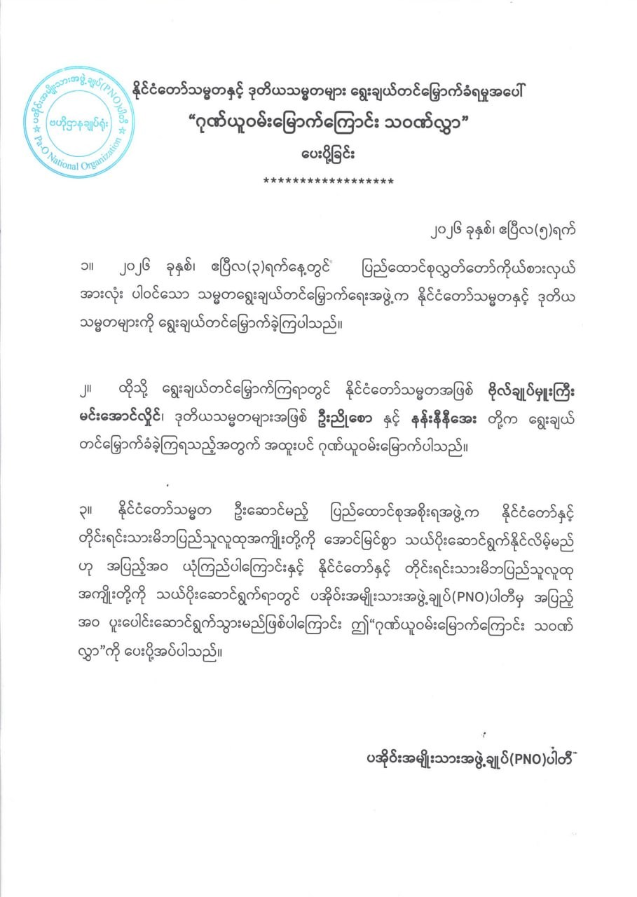 ၂၀၂၆ ခုနှစ်၊ ဧပြီလ ၃ ရက်တွင် ကျင်းပသည့် နိုင်ငံတော်သမ္မတ ရွေးချယ် တင်မြှောက်ပွဲ၌ ပြည်ထောင်စုလွှတ်တော်ကိုယ်စားလှယ် အားလုံးပါဝင်သော နိုင်ငံတော်သမ္မတ ရွေးချယ်တင်မြှောက်ရေးအဖွဲ့က ရွေးကောက်ခံ ပြည်သူ့လွှတ်တော် ကိုယ်စားလှယ်များ အစုအဖွဲ့မှ ဒုတိယသမ္မတအဖြစ် ရွေးချယ်တင်မြှောက်ထားသော ဗိုလ်ချုပ်မှူးကြီး မင်းအောင်လှိုင် အား နိုင်ငံတော်သမ္မတအဖြစ် ရွေးချယ်တင်မြှောက်ခြင်းခံရသည့်အတွက် မြန်မာနိုင်ငံတောင်သူလယ်သမားဖွံ့ဖြိုး တိုးတက်ရေးပါတီ၊ အမျိုးသားအကျိုးစီးပွား တိုးတက်ရေးပါတီ၊ ပအိုဝ်းအမျိုးသားအဖွဲ့ချုပ်(PNO)နှင့် မြန်မာနိုင်ငံစာရေးဆရာအသင်း တို့က အထူးဂုဏ်ယူဝမ်းမြောက်ကြောင်း ကြေညာချက်များ ထုတ်ပြန်ခဲ့ကြသည်။