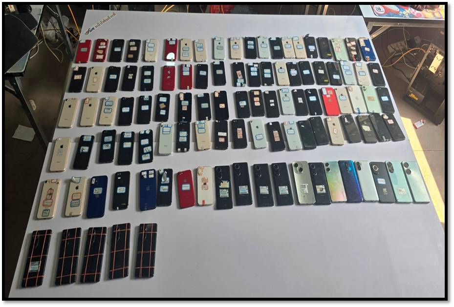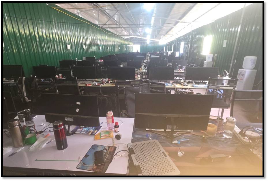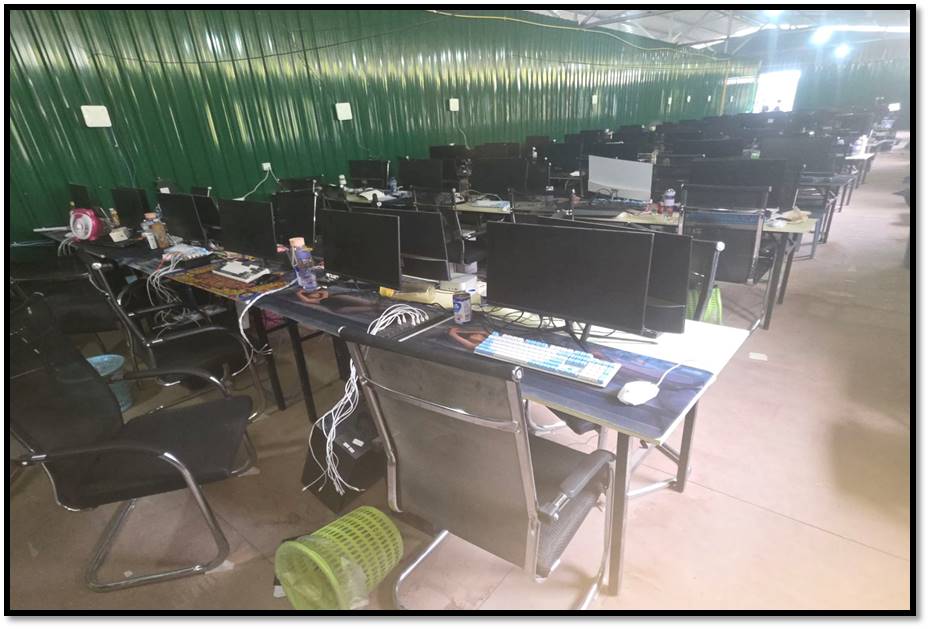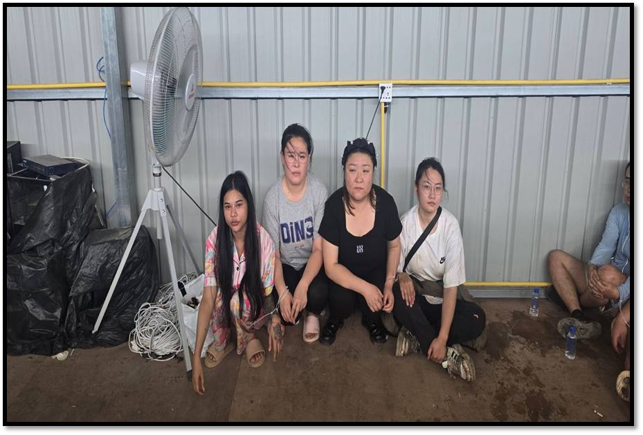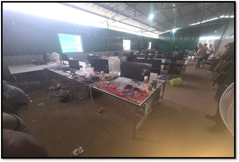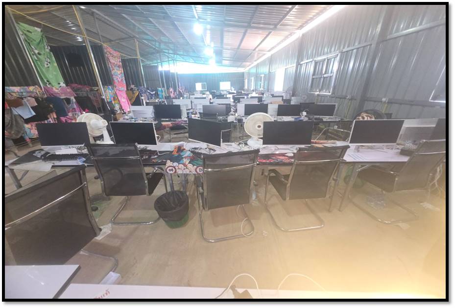 ရှမ်းပြည်နယ်(အရှေ့ပိုင်း)၊တာချီလိတ်မြို့နယ်အတွင်း၌ အွန်လိုင်းလိမ်လည်လောင်း ကစားမှုလုပ်ငန်းများ လုပ်ဆောင်နေကြောင်းသတင်းအရ လုံခြုံရေးတပ်ဖွဲ့ဝင်များပါဝင် သော ပူးပေါင်းအဖွဲ့က သွားရောက်စစ်ဆေးရာ ယနေ့ မွန်းလွဲ ၁ နာရီ ၃၀ မိနစ်ခန့်တွင် တာချီလိတ်မြို့၏ အနောက်မြောက်ဘက် မီတာ ၁၃၀၀၀ ခန့်အကွာ၊ ပန်ကူကျေးရွာ၏ အနောက်တောင်ဘက် မီတာ ၃၀၀၀ ခန့်အကွာနေရာသို့ အရောက်၌ သွပ်မိုး၊ သွပ်ကာ၊ သုံးထပ်သားပြားခင်း အဆောင်များဖြစ်သည့် အလျား ပေ ၁၂၀၊ အနံ ပေ ၆၀ ရှိ အွန်လိုင်းလိမ်လည် လောင်း ကစားမှုများ လုပ်ဆောင်သည့် အဆောင် ၁ လုံး၊ အလျား ပေ ၂၀၀၊ အနံ ပေ ၆၀ ရှိ ချက်ပြုတ်/စားဆောင်အပါ လူနေအိပ်ဆောင် ၁ လုံးနှင့် လုပ်ငန်းလုပ်ဆောင်သည့်အဆောင် ၁ လုံး၊ အလျား ၃၅ ပေ၊ အနံ ပေ ၃၀ ရှိ စတိုဈေးဆိုင်အဆောင် ၁ လုံး၊ အလျား ပေ ၄၀၊ အနံ ၃၅ ပေရှိ ပစ္စည်း စတို ၁ လုံး၊ ပေ ၄၀ ပတ်လည် အိပ်ဆောင် ၂ လုံး၊ အလျား ၁၅ ပေ၊ အနံ ၁၂ ပေရှိ ဂိတ် ဝင်/ထွက်ဆောင် ၁ လုံးနှင့် အလျား ပေ ၆၀၊ အနံ ၅ ပေရှိ အိမ်သာအဆောက်အအုံ ၁ လုံး၊ စုစုပေါင်း အဆောက်အအုံ ၉ လုံးကို တွေ့ရှိရပြီး ၎င်းတို့အတွင်းမှ အွန်လိုင်းလိမ်လည် လောင်းကစား မှုလုပ်ငန်းများလုပ်ကိုင်နေသည့် နိုင်ငံအတွင်းတရားမဝင် ဝင်ရောက်လာ သည့် တရုတ်နိုင်ငံသား အမျိုးသား ၁၂၂ ဦးနှင့် အမျိုးသမီး ၃ ဦး၊ လာအိုနိုင်ငံသား အမျိုးသမီး ၁ ဦး၊ စုစုပေါင်း တရားမဝင်ပြည်ပနိုင်ငံသား ၁၂၆ ဦးတို့ကို အွန်လိုင်း လိမ်လည်လောင်းကစားမှုလုပ်ငန်းများ လုပ်ကိုင်ရာတွင် အသုံးပြုသည့် ပစ္စည်းများဖြစ် သော မော်နီတာ ၁၂၀ လုံး၊ System ပုံး ၉၇ လုံး၊ All in One Computer ၄၆ လုံး၊ Star Link ၁၂ လုံး၊ ဝိုင်ဖိုင်စက် ၁၂ လုံး၊ ဖုန်းမျိုးစုံ ၁၀၅ လုံးနှင့် မီးစက်ကြီး ၁ လုံး တို့ကို တွေ့ရှိ သိမ်းဆည်းရမိခဲ့သည်။