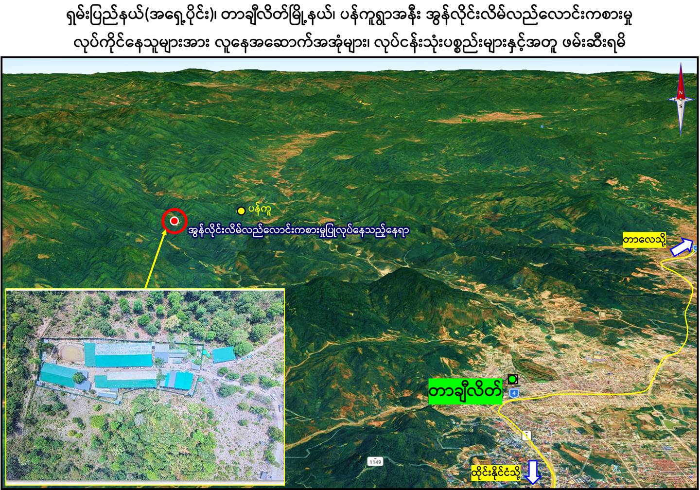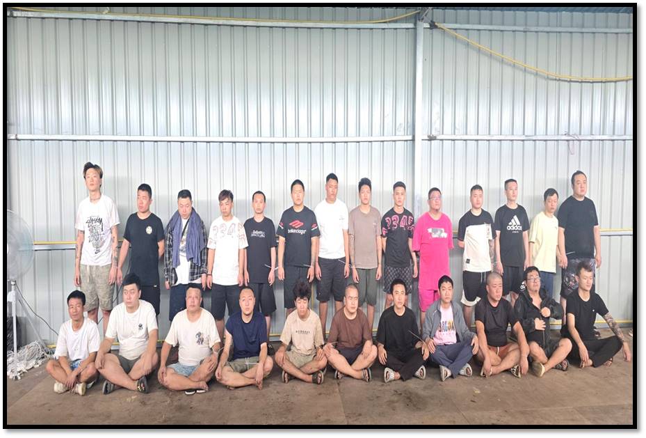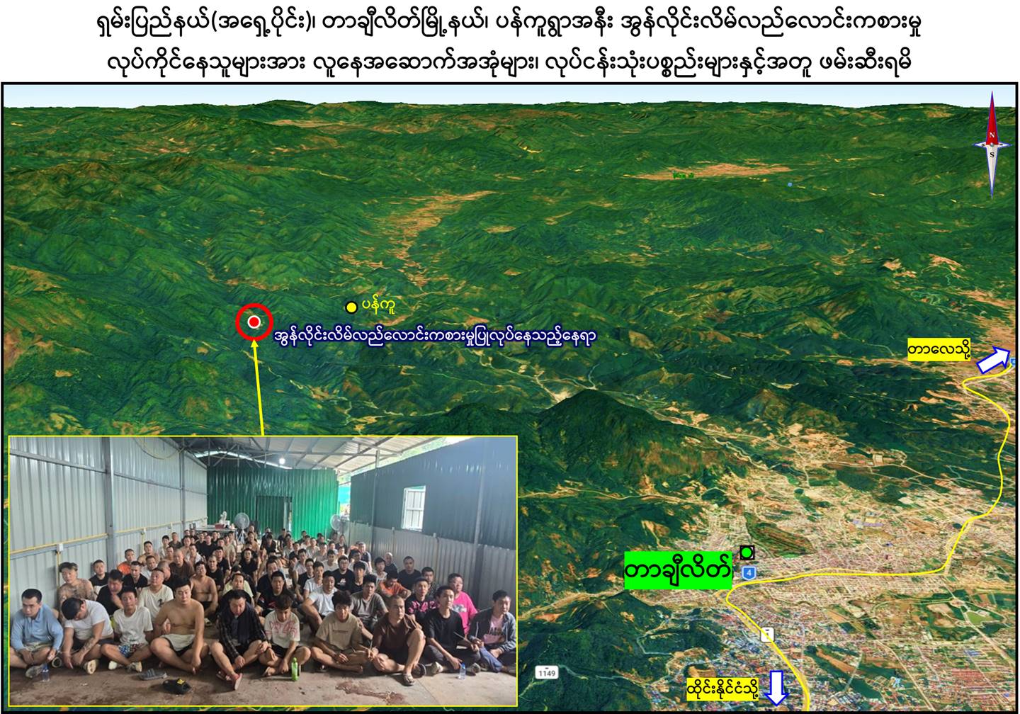 ရှမ်းပြည်နယ်(အရှေ့ပိုင်း)၊တာချီလိတ်မြို့နယ်အတွင်း၌ အွန်လိုင်းလိမ်လည်လောင်း ကစားမှုလုပ်ငန်းများ လုပ်ဆောင်နေကြောင်းသတင်းအရ လုံခြုံရေးတပ်ဖွဲ့ဝင်များပါဝင် သော ပူးပေါင်းအဖွဲ့က သွားရောက်စစ်ဆေးရာ ယနေ့ မွန်းလွဲ ၁ နာရီ ၃၀ မိနစ်ခန့်တွင် တာချီလိတ်မြို့၏ အနောက်မြောက်ဘက် မီတာ ၁၃၀၀၀ ခန့်အကွာ၊ ပန်ကူကျေးရွာ၏ အနောက်တောင်ဘက် မီတာ ၃၀၀၀ ခန့်အကွာနေရာသို့ အရောက်၌ သွပ်မိုး၊ သွပ်ကာ၊ သုံးထပ်သားပြားခင်း အဆောင်များဖြစ်သည့် အလျား ပေ ၁၂၀၊ အနံ ပေ ၆၀ ရှိ အွန်လိုင်းလိမ်လည် လောင်း ကစားမှုများ လုပ်ဆောင်သည့် အဆောင် ၁ လုံး၊ အလျား ပေ ၂၀၀၊ အနံ ပေ ၆၀ ရှိ ချက်ပြုတ်/စားဆောင်အပါ လူနေအိပ်ဆောင် ၁ လုံးနှင့် လုပ်ငန်းလုပ်ဆောင်သည့်အဆောင် ၁ လုံး၊ အလျား ၃၅ ပေ၊ အနံ ပေ ၃၀ ရှိ စတိုဈေးဆိုင်အဆောင် ၁ လုံး၊ အလျား ပေ ၄၀၊ အနံ ၃၅ ပေရှိ ပစ္စည်း စတို ၁ လုံး၊ ပေ ၄၀ ပတ်လည် အိပ်ဆောင် ၂ လုံး၊ အလျား ၁၅ ပေ၊ အနံ ၁၂ ပေရှိ ဂိတ် ဝင်/ထွက်ဆောင် ၁ လုံးနှင့် အလျား ပေ ၆၀၊ အနံ ၅ ပေရှိ အိမ်သာအဆောက်အအုံ ၁ လုံး၊ စုစုပေါင်း အဆောက်အအုံ ၉ လုံးကို တွေ့ရှိရပြီး ၎င်းတို့အတွင်းမှ အွန်လိုင်းလိမ်လည် လောင်းကစား မှုလုပ်ငန်းများလုပ်ကိုင်နေသည့် နိုင်ငံအတွင်းတရားမဝင် ဝင်ရောက်လာ သည့် တရုတ်နိုင်ငံသား အမျိုးသား ၁၂၂ ဦးနှင့် အမျိုးသမီး ၃ ဦး၊ လာအိုနိုင်ငံသား အမျိုးသမီး ၁ ဦး၊ စုစုပေါင်း တရားမဝင်ပြည်ပနိုင်ငံသား ၁၂၆ ဦးတို့ကို အွန်လိုင်း လိမ်လည်လောင်းကစားမှုလုပ်ငန်းများ လုပ်ကိုင်ရာတွင် အသုံးပြုသည့် ပစ္စည်းများဖြစ် သော မော်နီတာ ၁၂၀ လုံး၊ System ပုံး ၉၇ လုံး၊ All in One Computer ၄၆ လုံး၊ Star Link ၁၂ လုံး၊ ဝိုင်ဖိုင်စက် ၁၂ လုံး၊ ဖုန်းမျိုးစုံ ၁၀၅ လုံးနှင့် မီးစက်ကြီး ၁ လုံး တို့ကို တွေ့ရှိ သိမ်းဆည်းရမိခဲ့သည်။