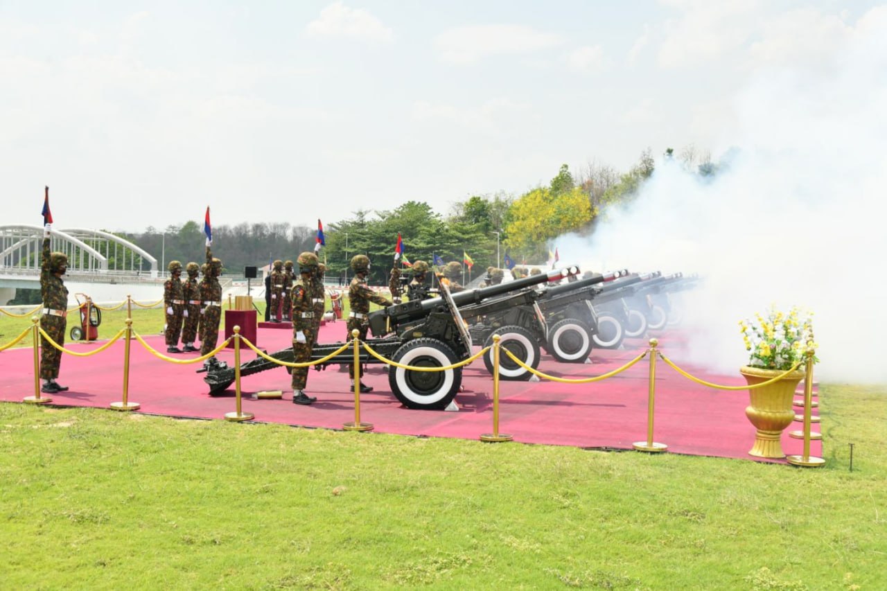 ထို့နောက် နိုင်ငံတော်သမ္မတ ဦးမင်းအောင်လှိုင်သည် ဂုဏ်ပြုခံစင်မြင့်၌ နေရာ ယူပြီး ဂုဏ်ပြုတပ်ဖွဲ့၏အလေးပြုခြင်းကိုခံယူသည်။ ထိုသို့ ဂုဏ်ပြုတပ်ဖွဲ့၏ အလေးပြု ခြင်းကိုခံယူနေချိန်တွင် ဂုဏ်ပြုအမြောက်တပ်ဖွဲ့မှလည်း အမြောက် ၂၁ ချက်ကို စစ်ရေးပြအခမ်းအနားဖြင့် ဂုဏ်ပြုပစ်ဖောက်သည်။