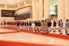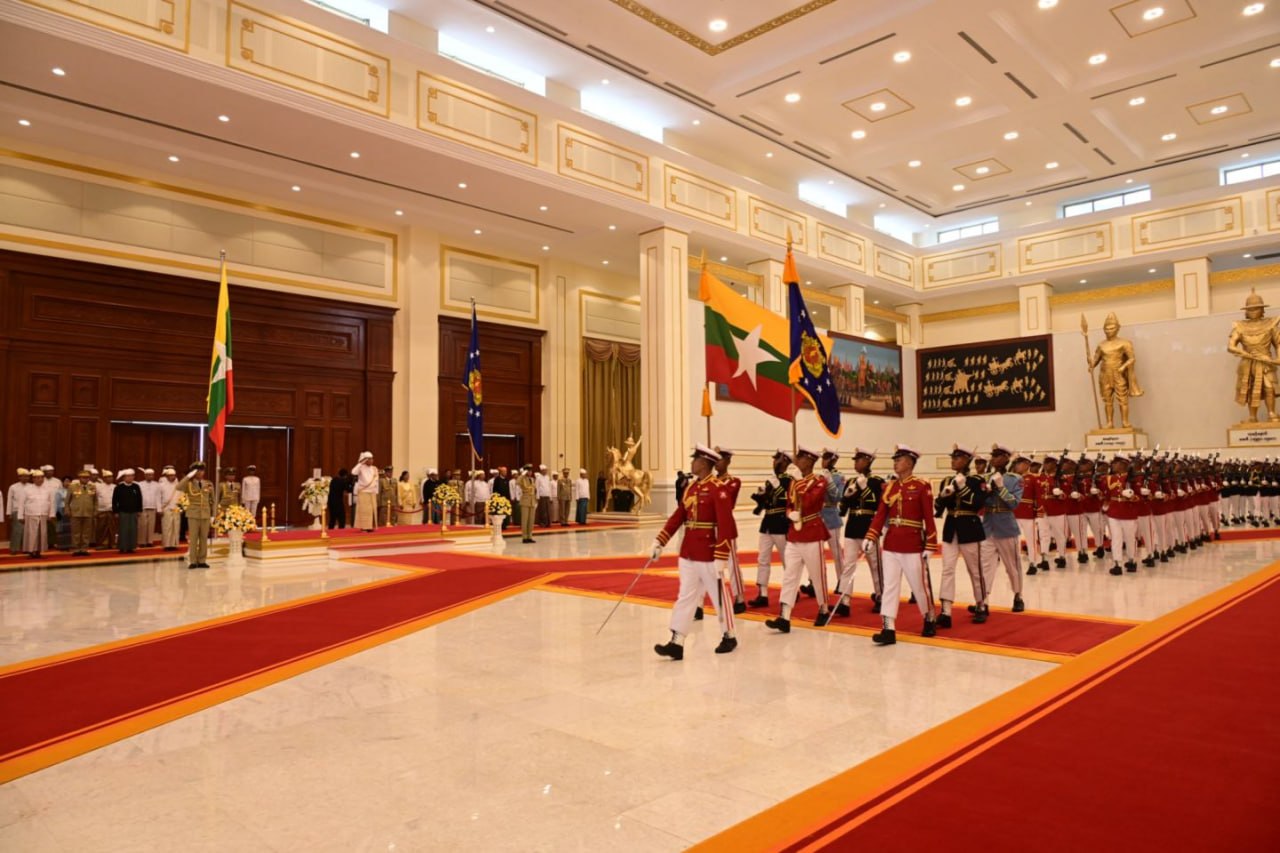ဦးစွာ နိုင်ငံတော်သမ္မတ ဦးမင်းအောင်လှိုင် လိုက်ပါလာသည့် အထူးယာဉ်တန်း သည် ဂုဏ်ပြုမြင်းစီးတပ်ဖွဲ့၏ ဦးဆောင်ကြိုဆိုမှုဖြင့် နိုင်ငံတော်သမ္မတ၏ ဧည့်ဆောင် တော်ရှိ ဂုဏ်ပြုဆောင်ခန်းမကြီးသို့ရောက်ရှိလာရာ ဒုတိယသမ္မတ ဦးညိုစော၊ နိုင်ငံတော် သမ္မတရုံး ပြည်ထောင်စုဝန်ကြီး ဦးခင်မောင်ရီ တို့က ကြိုဆိုနှုတ်ဆက်ကြ သည်။