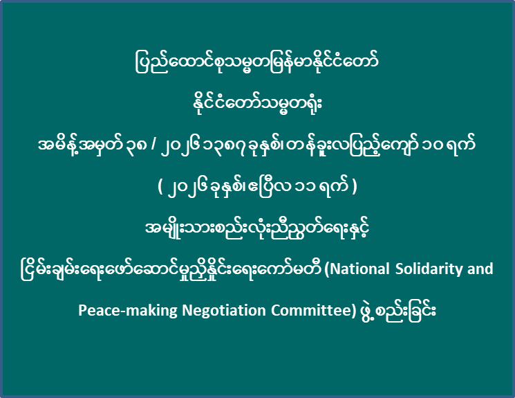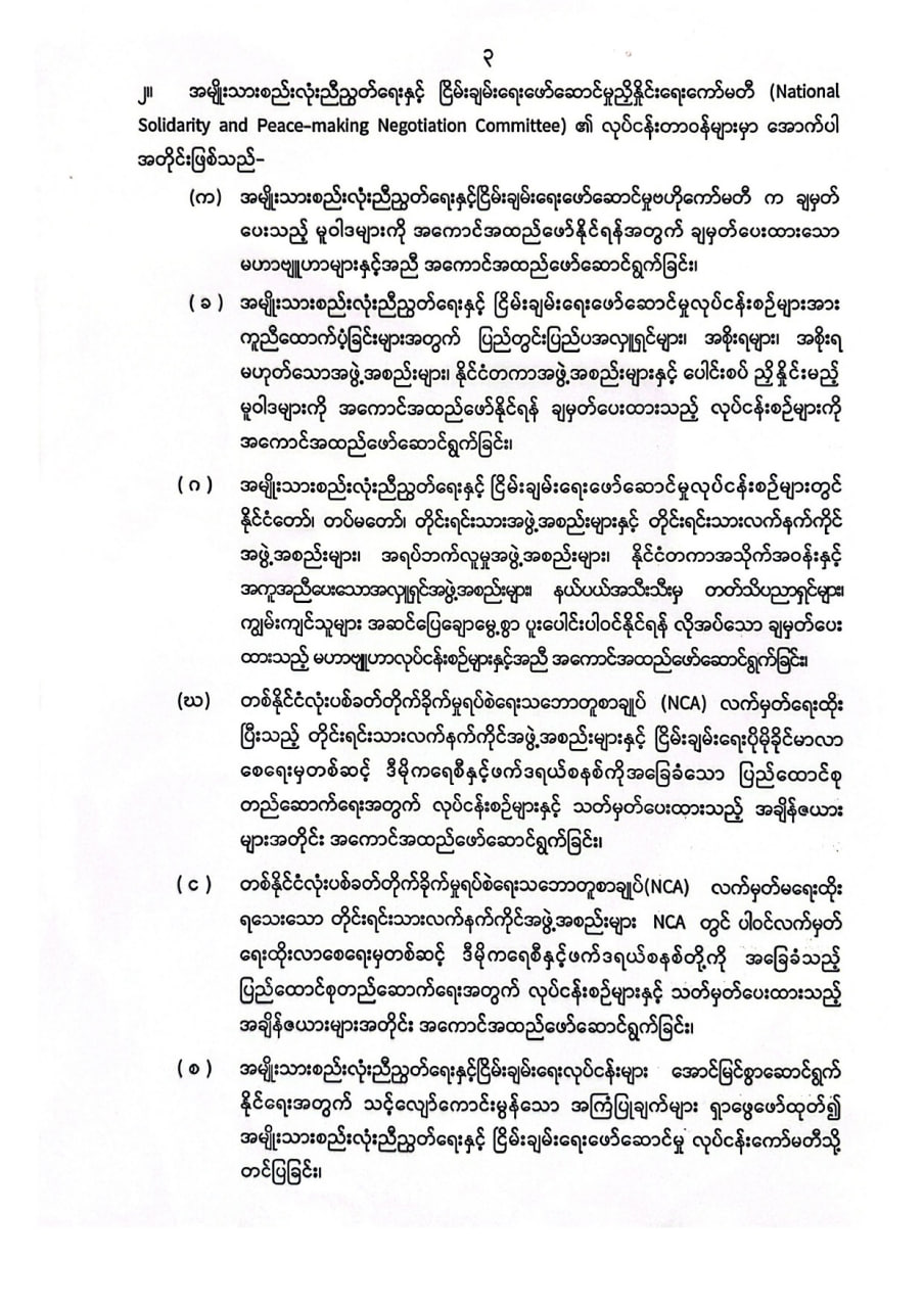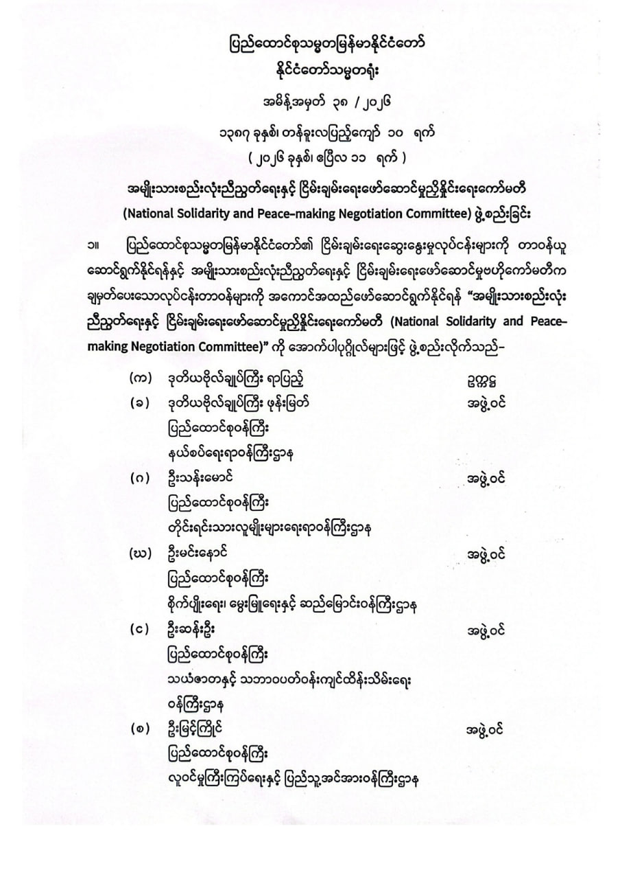 ပြည်ထောင်စုသမ္မတမြန်မာနိုင်ငံတော် နိုင်ငံတော်သမ္မတရုံး အမိန့်အမှတ် ၃၈ / ၂၀၂၆ ၁၃၈၇ ခုနှစ်၊ တန်ခူးလပြည့်ကျော် ၁၀ ရက် ( ၂၀၂၆ ခုနှစ်၊ ဧပြီလ ၁၁ ရက် )အမျိုးသားစည်းလုံးညီညွတ်ရေးနှင့် ငြိမ်းချမ်းရေးဖော်ဆောင်မှုညှိနှိုင်းရေးကော်မတီ (National Solidarity and Peace-making Negotiation Committee) ဖွဲ့စည်းခြင်း