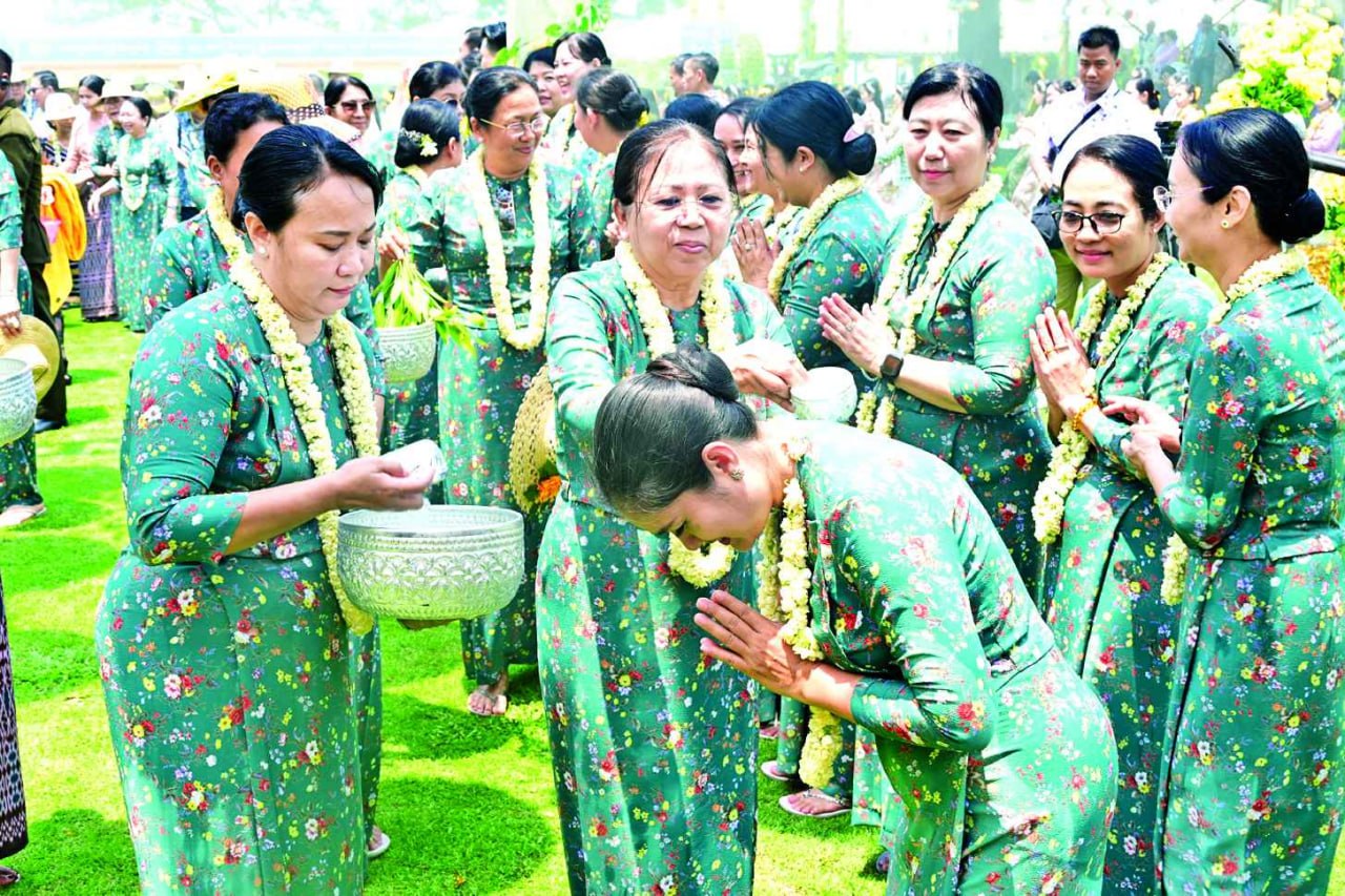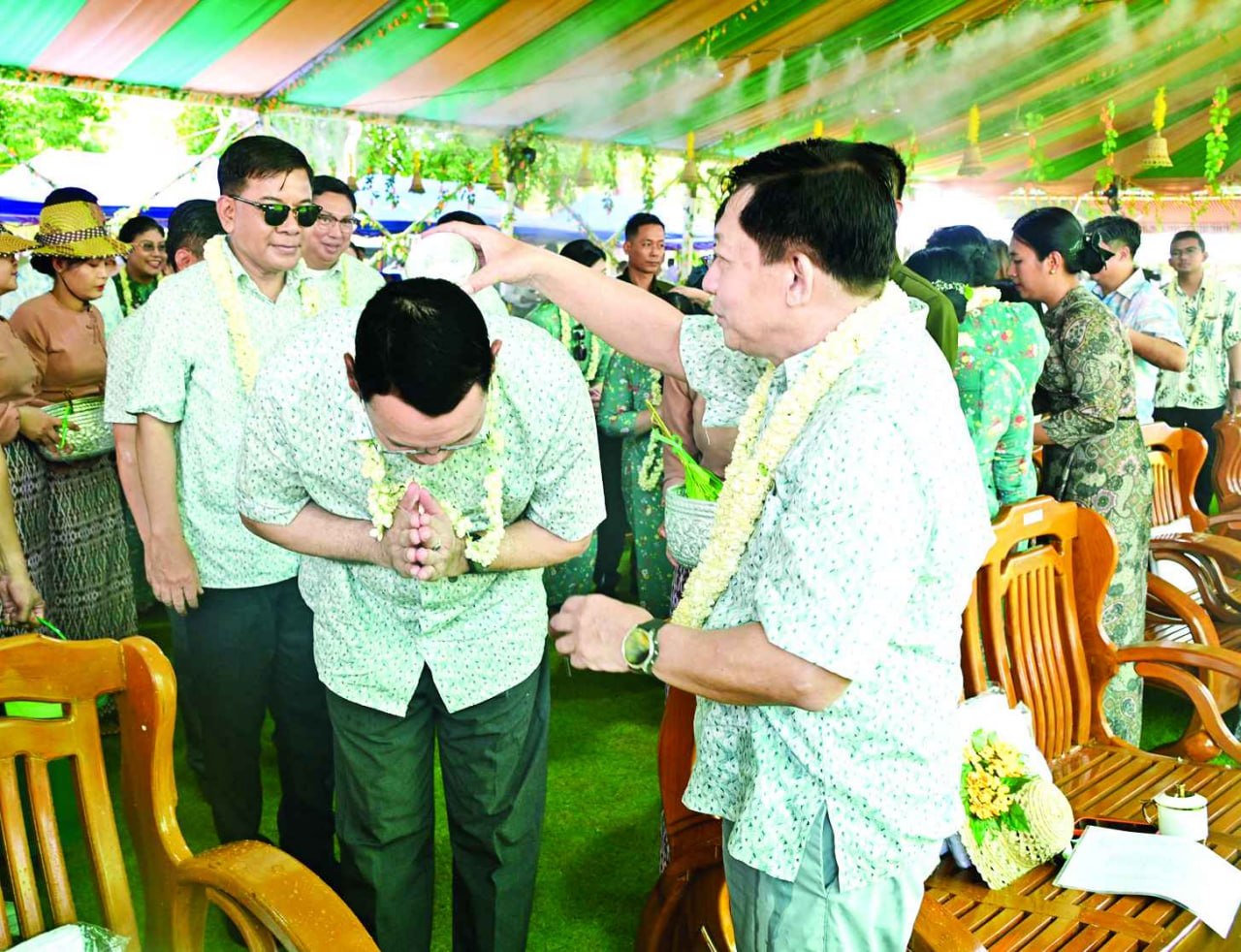 ယင်းနောက် နိုင်ငံတော်သမ္မတနှင့်ဇနီးတို့သည် အခမ်းအနားတက်ရောက်လာ ကြသည့် တပ်မတော်ကာကွယ်ရေးဦးစီးချုပ်နှင့်ဇနီး၊ ဒုတိယတပ်မတော်ကာကွယ်ရေး ဦးစီးချုပ် ကာကွယ်ရေးဦးစီးချုပ်(ကြည်း)နှင့် ဇနီး၊ ပြည်ထောင်စုအဆင့်ပုဂ္ဂိုလ်များနှင့် ဇနီးများ၊ အဆင့်မြင့်တပ်မတော် အရာရှိကြီးများနှင့်ဇနီးများ၊ အခမ်းအနားတက်ရောက် လာကြသူများ၊ အနုပညာရှင် များ၊ ယိမ်းအကအဖွဲ့များအား အတာသင်္ကြန်ရေကို မြန်မာ့ရိုးရာအစဉ်အလာနှင့်အညီ ပက်ဖျန်းပေးကြပြီး အတာရေသဘင်ပွဲတော်ကို အတူတကွဆင်နွှဲခဲ့ကြကြောင်း သတင်းရရှိသည်။
