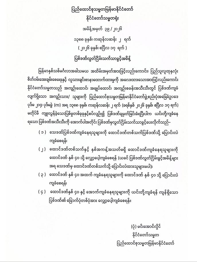 ပြည်ထောင်စုသမ္မတမြန်မာနိုင်ငံတော် နိုင်ငံတော်သမ္မတရုံး အမိန့်အမှတ် ၃၉ / ၂၀၂၆ ၁၃၈၈ ခုနှစ်၊ ကဆုန်လဆန်း ၂ ရက်( ၂၀၂၆ ခုနှစ်၊ ဧပြီလ ၁၇ ရက် )ပြစ်ဒဏ်လွတ်ငြိမ်းသက်သာခွင့်အမိန့်