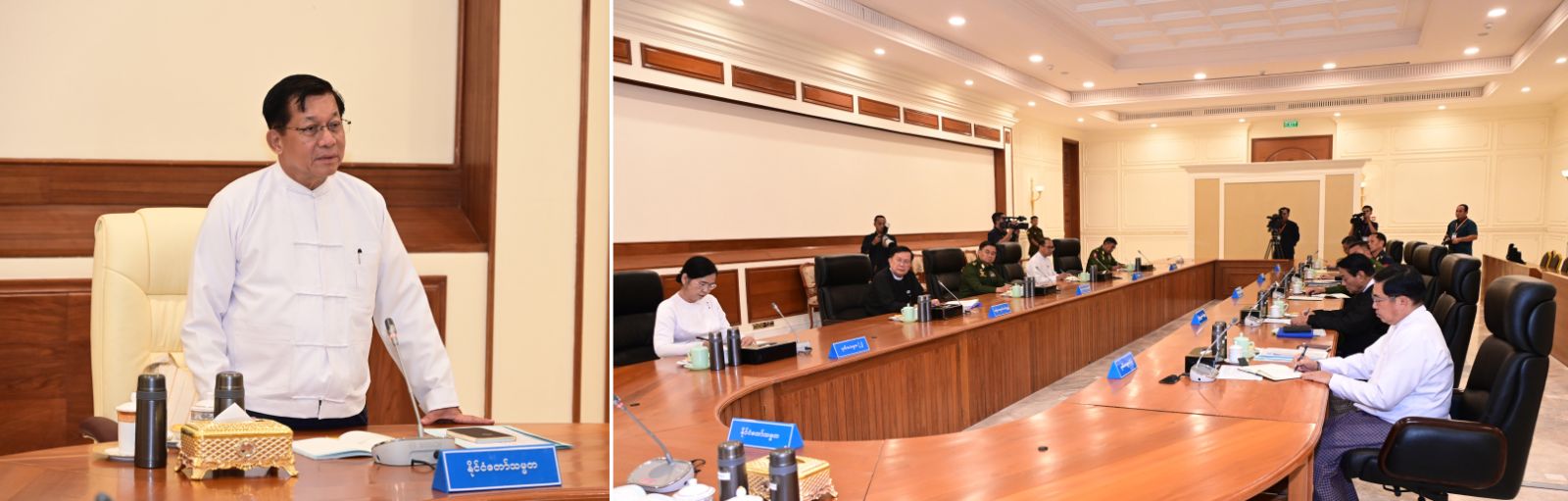 ဒုတိယတပ်မတော်ကာကွယ်ရေးဦးစီးချုပ် ကာကွယ်ရေးဦးစီးချုပ်(ကြည်း) ဗိုလ်ချုပ်ကြီး ကျော်စွာလင်းက တပ်မတော်အနေဖြင့် နိုင်ငံတော်ကာကွယ်ရေးတာဝန် များကိုထမ်းဆောင်ရာတွင် တရားဥပဒေနှင့်အညီ ဆောင်ရွက်လျက်ရှိမှု အခြေအနေ များကို လည်းကောင်း၊ ကာကွယ်ရေးဝန်ကြီးဌာန ပြည်ထောင်စုဝန်ကြီး ဗိုလ်ချုပ်ကြီး ထွန်းအောင်က ပြည်သူ့စစ်မှုထမ်းသင်တန်းများအား စဉ်ဆက်မပြတ်ဖွင့်လှစ် ဆောင်ရွက် လျက်ရှိမှုအခြေအနေများကိုလည်းကောင်း၊ နိုင်ငံခြားရေးဝန်ကြီးဌာန ပြည်ထောင်စု ဝန်ကြီး ဦးတင်မောင်ဆွေက အချို့သောအာဆီယံ နိုင်ငံများအနေဖြင့် မြန်မာနိုင်ငံ၏ ပကတိအခြေအနေအပေါ် အပြုသဘောဆောင်သည့် ရှုမြင်သုံးသပ်ချက်များအား တွေ့မြင်ရရှိလာမှု အခြေအနေများနှင့် ဆက်လက်ဆောင်ရွက်သွားနိုင်မည့် အကြံပြု တင်ပြချက်များကိုလည်းကောင်း၊ ပြည်ထဲရေးဝန်ကြီးဌာန ပြည်ထောင်စုဝန်ကြီး ဒုတိယဗိုလ်ချုပ်ကြီး ညွန့်ဝင်းဆွေက မြန်မာနှစ်သစ်ကူး အတာသင်္ကြန်ကာလအတွင်း အမှုအခင်းများဖြစ်ပွားခဲ့မှုနှင့်ယခင်ကာလတူ နှိုင်းယှဉ်သုံးသပ်တင်ပြချက်များ၊ နယ်မြေ တည်ငြိမ်အေးချမ်းရေးနှင့် တရားဥပဒေစိုးမိုးရေးအတွက် နယ်မြေဒေသလုံခြုံရေးနှင့် အကြမ်းဖက်နှိမ်နှင်းရေးအဖွဲ့များ တိုးတက်ဖွဲ့စည်းနိုင်ခဲ့မှု၊ မူးယစ်ဆေးဝါးများ စိစစ် ဖော်ထုတ်ဖမ်းဆီးနိုင်ခဲ့မှု၊ ရပ်ကွက်၊ ကျေးရွာများ အလိုက်အုပ်ချုပ်ရေးမှူးများ၏ စွမ်းဆောင်ရည်များတိုးတက်လာစေရေး စီမံဆောင်ရွက်လျက်ရှိမှု အခြေအနေများကို လည်းကောင်း၊ နယ်စပ်ရေးရာဝန်ကြီးဌာန ပြည်ထောင်စု ဝန်ကြီး ဒုတိယဗိုလ်ချုပ်ကြီး ဖုန်းမြတ်က အချို့သောနယ်မြေဒေသများ၌ ယာယီနေရပ်စွန့်ခွာနေရသူများအား ၎င်းတို့၏နေရပ်အသီးသီးသို့ ပြန်လည်ဝင်ရောက် နေထိုင်နိုင်ရေး စီမံဆောင်ရွက်လျက် ရှိမှုနှင့် ယာယီခိုလှုံရေးစခန်းများအား အပြီးတိုင်ပိတ်သိမ်းနိုင်ရေး ကြိုးပမ်းဆောင်ရွက် လျက်ရှိမှု၊ နိုင်ငံဖြတ်ကျော် မီးခိုးမြူငွေ့ပပျောက်ရေးဆိုင်ရာ လုပ်ငန်းများ ဆောင်ရွက် လျက်ရှိမှုတို့နှင့် ပတ်သက်၍လည်းကောင်း အသီးသီးဆွေးနွေး တင်ပြကြသည်။