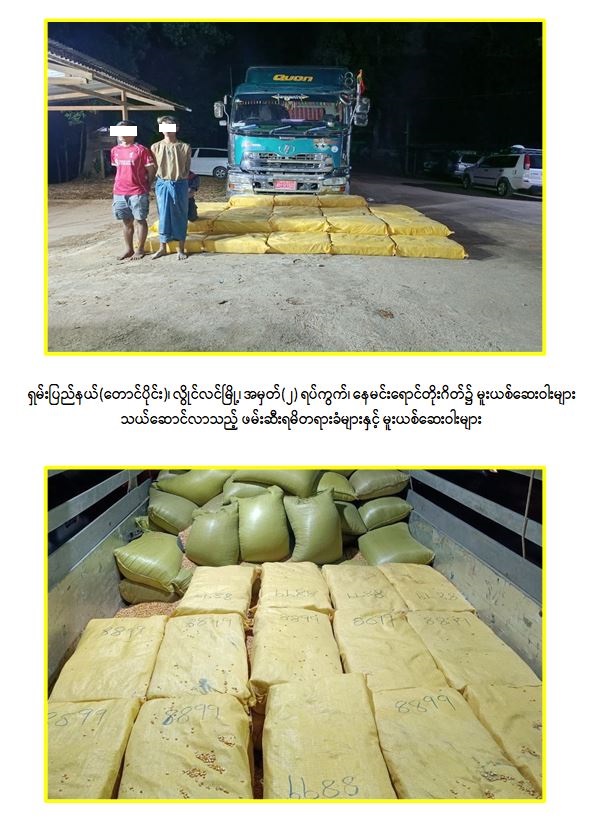 ဖမ်းဆီးရမိ ယာဉ်မောင်း၏ ပြောကြားချက်အရ ၎င်းတို့သည် ၂၀၂၅ ခုနှစ် ဖေဖော်ဝါရီလမှစတင်၍ ချောင်းဦးမြို့မှ မိုင်းလားမြို့အထိ မောင်းနှင်ရသည့် ယာဉ်မောင်း အလုပ်ကို ယာဉ်နောက်လိုက် ခန့်ကျော်ထက်နှင့်အတူ လုပ်ကိုင်ခဲ့ကြောင်း၊ ဧပြီ ၁၈ ရက် တွင် မိုင်းလားမြို့မှ ချောင်းဦးမြို့သို့ ပြန်လည်ထွက်ခွာလာစဉ် ကုန်ပစ္စည်းများ မပါဝင် သဖြင့် ကုန်များရရှိရေး ချိတ်ဆက်ခဲ့ရာ နမ့်စန်မြို့၊ အမှတ်(၉)ကျေးရွာအကျော်ရှိ ပြည့်ဖြိုးကျော် ပြောင်းပွဲရုံနှင့် ချိတ်ဆက်မိပြီး ဧပြီ ၂၀ ရက်တွင် ပွဲရုံပိုင်ရှင် ဝင်းဇော်ညွန့်နှင့် ခင်ဝင်းဆွေတို့က ကြက်စာအိတ် ၄၈ အိတ်နှင့် ပြောင်းအိတ် ၂၅၀ အိတ်တို့ကို တင်ဆောင် ပေးခဲ့ခြင်းဖြစ်ကြောင်း သိရှိရသည်။