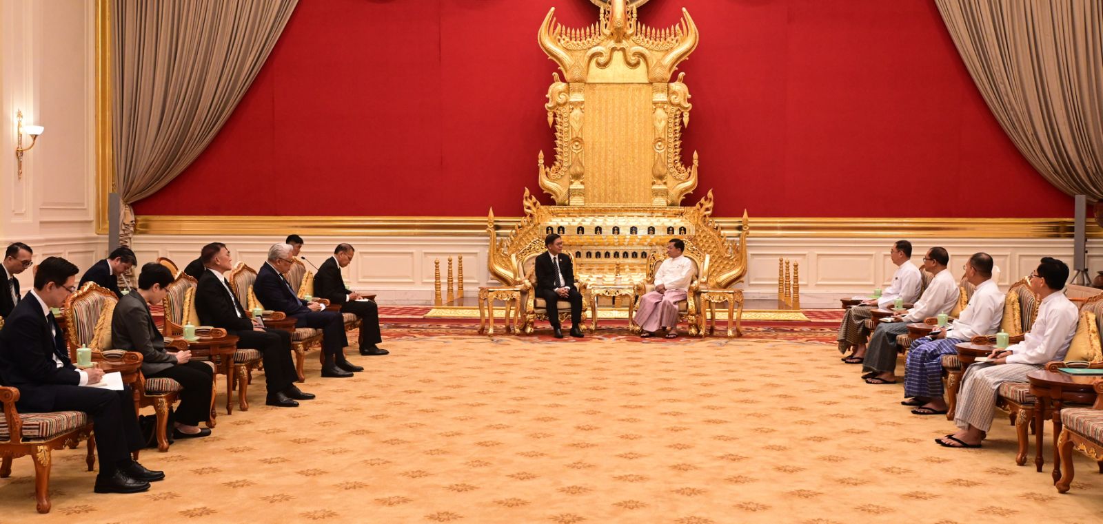 ပြည်ထောင်စုသမ္မတ မြန်မာနိုင်ငံတော်၊ နိုင်ငံတော်သမ္မတ ဦးမင်းအောင်လှိုင် ထံ ထိုင်းနိုင်ငံ၊ ဒုတိယဝန်ကြီးချုပ်နှင့် နိုင်ငံခြားရေးဝန်ကြီး H.E. Mr. Sihasak Phuangketkaew ဦးဆောင်သော ကိုယ်စားလှယ်အဖွဲ့က ယနေ့နံနက်ပိုင်းတွင် နေပြည်တော်ရှိ နိုင်ငံတော်သမ္မတ၏ ဧည့်ဆောင်တော်၌ လာရောက်ဂါရဝပြု တွေ့ဆုံ သည်။