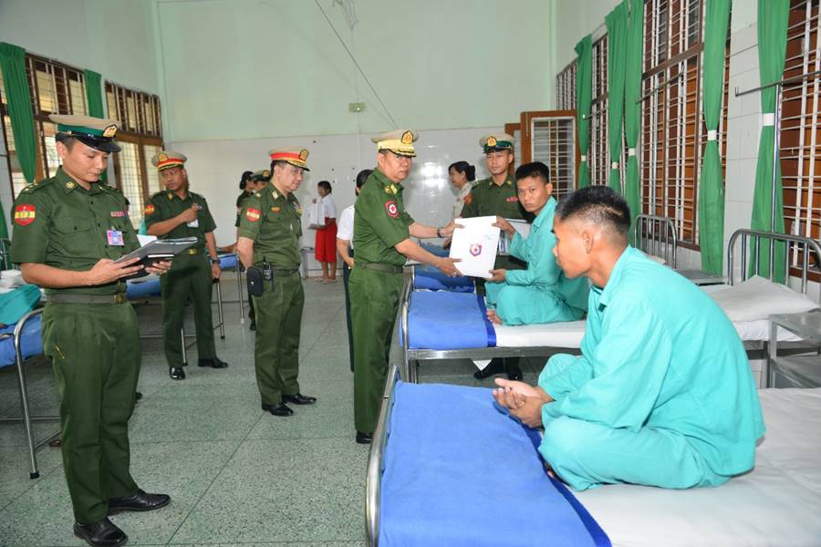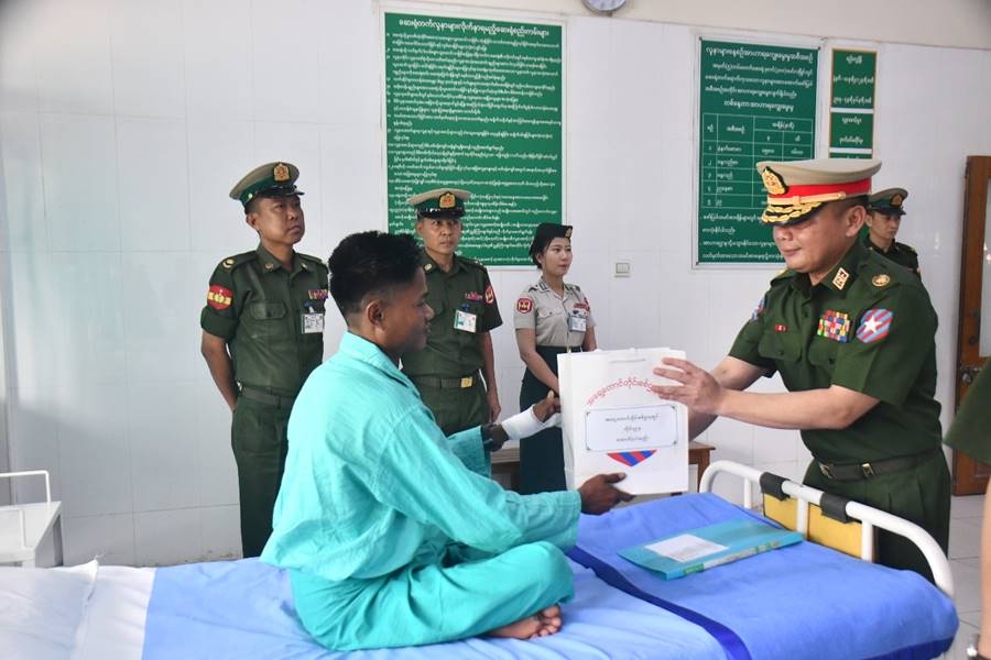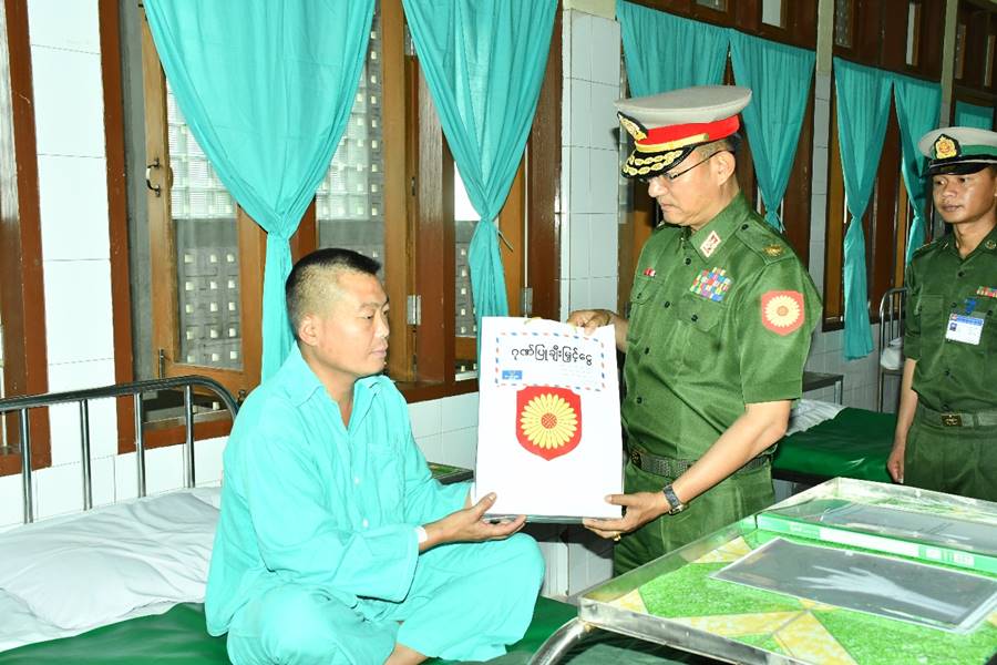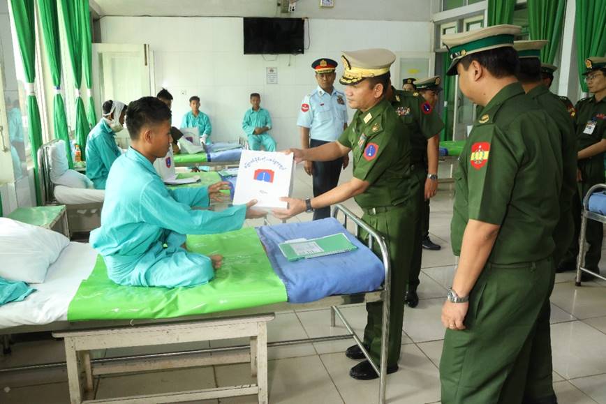ထို့သို့ဆောင်ရွက်ပေးလျက်ရှိရာ ယနေ့တွင် နေပြည်တော်ကောင်စီနယ်မြေရှိ တပ်မတော်ဆေးရုံကြီး(ခုတင်-၁၀၀၀)၊ ကချင်ပြည်နယ်၊ မြစ်ကြီးနားမြို့ရှိ တပ်မတော် ဆေးရုံ၊ ရှမ်းပြည်နယ်(တောင်ပိုင်း) အောင်ပန်းမြို့ရှိတပ်မတော်ဆေးရုံ၊ ကယားပြည်နယ်၊ လွိုင်ကော်မြို့နယ်ရှိ တပ်မတော်ဆေးရုံ၊ မွန်ပြည်နယ်၊ မော်လမြိုင်မြို့ရှိ တပ်မတော် ဆေးရုံ၊ တနင်္သာရီတိုင်းဒေသကြီး၊ မြိတ်မြို့ရှိ တပ်မတော်ဆေးရုံ၊ ရန်ကုန်တိုင်းဒေသကြီး၊ မင်္ဂလာဒုံမြို့နယ်ရှိ တပ်မတော်အရိုးရောဂါအထူးကုဆေးရုံကြီး (ခုတင်-၅၀၀) နှင့် တပ်မတော် ဆေးရုံကြီး(ခုတင်−၁၀၀၀)၊ ဧရာဝတီတိုင်းဒေသကြီး၊ ပုသိမ်မြို့ရှိ တပ်မတော် ဆေးရုံ၊ ရခိုင်ပြည်နယ်၊ စစ်တွေမြို့ရှိ တပ်မတော်ဆေးရုံ၊ စစ်ကိုင်းတိုင်းဒေသကြီး၊ မုံရွာမြို့ရှိ တပ်မတော်ဆေးရုံနှင့် ပဲခူးတိုင်းဒေသကြီး၊ တောင်ငူမြို့ရှိ တပ်မတော်ဆေးရုံ တို့၌ တက်ရောက်ဆေးကုသမှု ခံယူလျက်ရှိသော အရာရှိ၊ စစ်သည်၊ မိသားစုဝင်များ၊ မြန်မာနိုင်ငံရဲတပ်ဖွဲ့ဝင်များ၊ စစ်မှုထမ်းဟောင်းအဖွဲ့ဝင်များ၊ ပြည်သူ့စစ်(ဌာနေ)တပ်ဖွဲ့ဝင် များနှင့် ဒေသခံတိုင်းရင်းသားပြည်သူများအား တိုင်းစစ်ဌာနချုပ်များမှ တိုင်းမှူးများနှင့် တာဝန်ရှိသူများက သွားရောက်ကြည့်ရှု၍ လူနာတစ်ဦးချင်း၏ ရောဂါဖြစ်ပွားမှု၊ ဆေးဝါး ကုသပေးထားမှုနှင့် ကျန်းမာရေး တိုးတက်ကောင်းမွန်မှု အခြေအနေများကို ရင်းရင်းနှီးနှီး မေးမြန်းအားပေးစကားပြောကြားကာ အာဟာရဖြည့်စားသောက်ဖွယ်ရာများနှင့် ချီးမြှင့် ငွေများ ပေးအပ်သည်။
