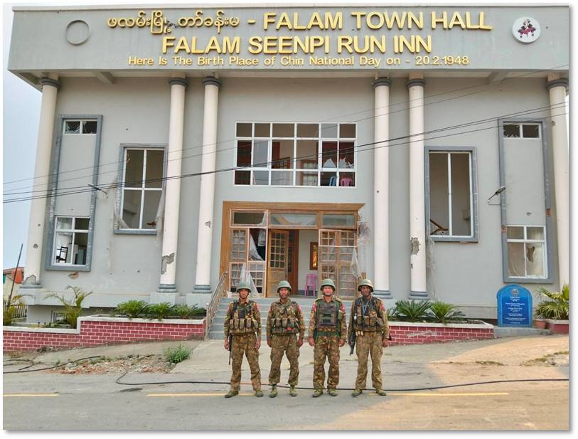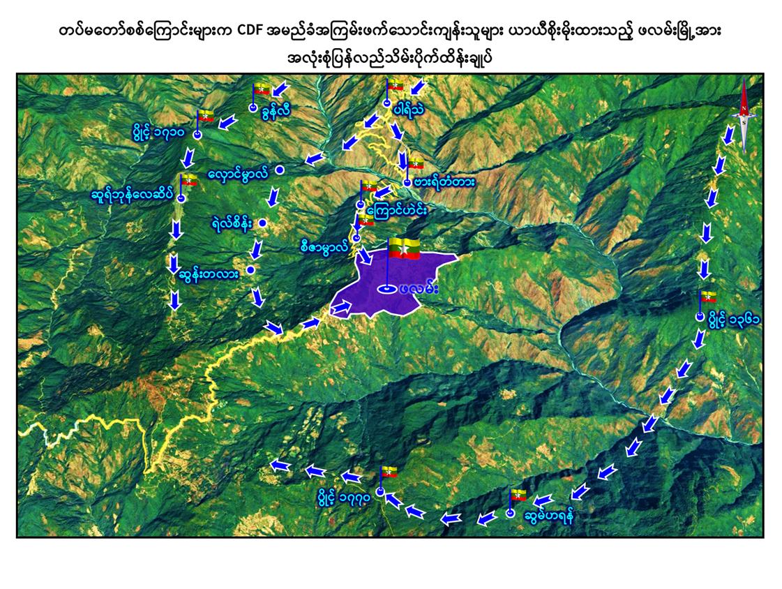 တပ်မတော်စစ်ကြောင်းများအနေဖြင့် ချင်းပြည်နယ်၊ ခရိုင်မြို့တော်ကြီး တစ်ခု ဖြစ်သည့် ဖလမ်းမြို့အား အမြန်ဆုံးပြန်လည်သိမ်းပိုက်ရရှိနိုင်းရေးနှင့် CDF အမည်ခံ အကြမ်းဖက်သောင်းကျန်းသူများအား တိုက်ခိုက်ချေမှုန်းနိုင်ရေးအတွက် ကလေးမြို့နှင့် တီးတိန်မြို့တို့၌လိုအပ်သည့် ပြင်ဆင်စုဖွဲ့မှုများနှင့် အုပ်ချုပ်ထောက်ပံ့မှုများကို ဖြည့်တင်းဆောင်ရွက်ခဲ့ပြီး မြေပြင်/ဝေဟင် ဟန်ချက်ညီပေါင်းစပ်စုဖွဲ့၍ စစ်ကြောင်း များခွဲ၍ နယ်မြေရှင်းလင်းခြင်းများစတင်ခဲ့ပြီး တန်ပြန်တိုက်စစ်များ တစ်ဆင့်ပြီး တစ်ဆင့် ခြေကုပ်ယူထိုးဖောက်တိုက်ခိုက်ခဲ့ရာ ၂၀၂၅ ခုနှစ်၊ အောက်တိုဘာလ ၂၇ ရက်နေ့တွင် အကြမ်းဖက်သောင်းကျန်းသူများ ယာယီစိုးမိုးထားသော သာယာကုန်း ကျေးရွာအားလည်းကောင်း၊ အောက်တိုဘာလ ၃၀ ရက်နေ့တွင် နတ်ချောင်းတံတား အားလည်းကောင်း၊ နိုဝင်ဘာလ ၃ ရက်နေ့တွင် ပွိုင့်-၂၂၄၄ တောင်ကုန်းအား လည်းကောင်း၊ နိုဝင်ဘာလ ၄ ရက်နေ့တွင် ကနေဒီ တောင်နှင့် ဝေဘူလစခန်းတို့အား လည်းကောင်း၊ နိုဝင်ဘာလ ၈ ရက်နေ့တွင် ပွိုင့် ၂၀၆၄ တောင်ကုန်းအား လည်းကောင်း၊ နိုဝင်ဘာလ ၉ ရက်နေ့တွင် သိုင်းငင်းစခန်းအားလည်းကောင်း၊ နိုဝင်ဘာလ ၁၇ ရက်နေ့တွင် ပွိုင့် ၁၃၆၁ တောင်ကုန်းအားလည်းကောင်း၊ နိုဝင်ဘာလ ၂၆ ရက်နေ့တွင် ဇောင်ကောင်ကျေးရွာအား လည်းကောင်း၊ ၂၀၂၆ ခုနှစ်၊ ဖေဖော်ဝါရီလ ၂ ရက်နေ့တွင် ဇွယ်လေကျေးရွာအားလည်းကောင်း၊ ဖေဖော်ဝါရီလ ၁၀ ရက်နေ့တွင် ထင်းရှူးစခန်း ကျေးရွာအားလည်းကောင်း၊ မတ်လ ၃၁ ရက်နေ့တွင် ပါသဲကျေးရွာအားလည်းကောင်း၊ ဧပြီလ ၁၉ ရက်နေ့တွင် ဗားတံတားအားလည်းကောင်း၊ ဧပြီလ ၂၂ ရက်နေ့တွင် ခွန်လီ ကျေးရွာအားလည်းကောင်း၊ ဧပြီလ ၂၃ ရက်နေ့တွင် ပွိုင့် ၁၇၁၀ တောင်ကုန်း၊ ကြောင်ဟင်ရှာကျေးရွာနှင့် ဆွန်ဟရန်ကျေးရွာတို့အားလည်းကောင်း၊ ဧပြီလ ၂၄ ရက် နေ့တွင် ဆူရ်ဘုန်လေဆိပ် နှင့် ဆီဇာမော်ကျေးရွာတို့အားလည်းကောင်း အသီးသီး အောင်မြင်စွာ ပြန်လည်ထိန်းချုပ်နိုင်ခဲ့ပြီး ဧပြီလ ၂၅ ရက်နေ့ ယနေ့တွင် အကြမ်းဖက် သမားများ ယာယီစိုးမိုးထားသည့် ဖလမ်းမြို့အား တပ်မတော်စစ်ကြောင်းများက အပြီး အတိုင်အလုံးစုံ ပြန်လည်သိမ်းပိုက် ထိန်းချုပ်နိုင်ခဲ့သည်။