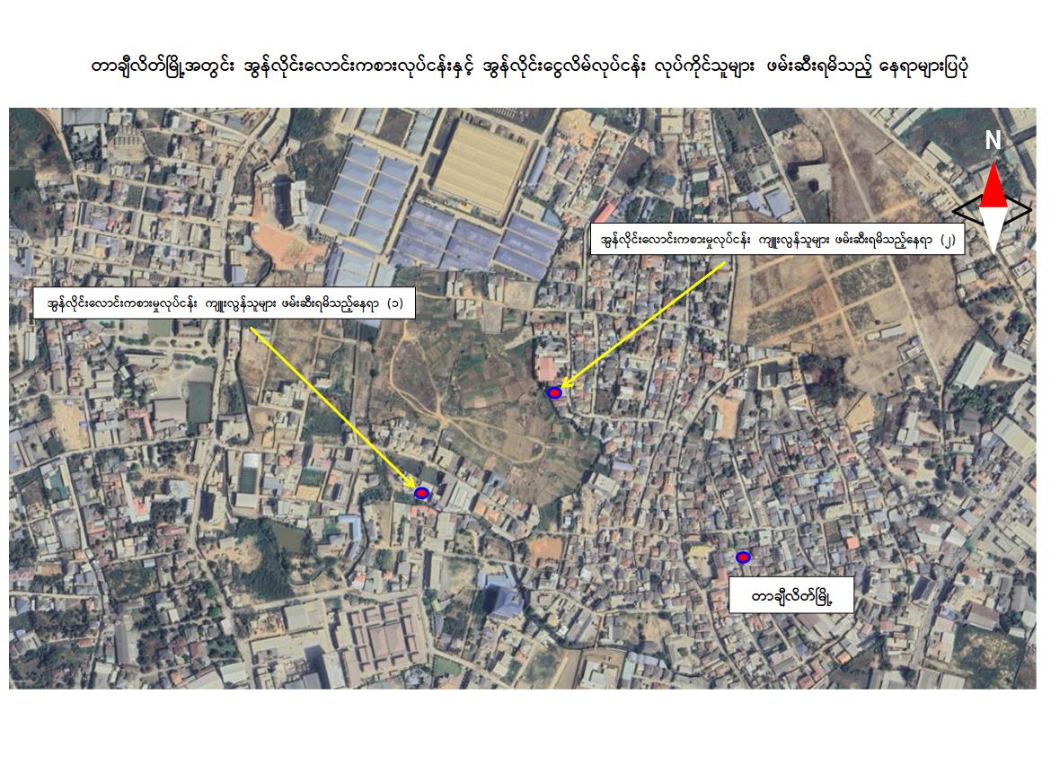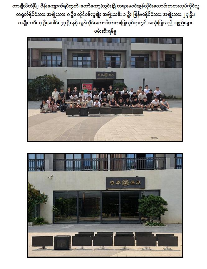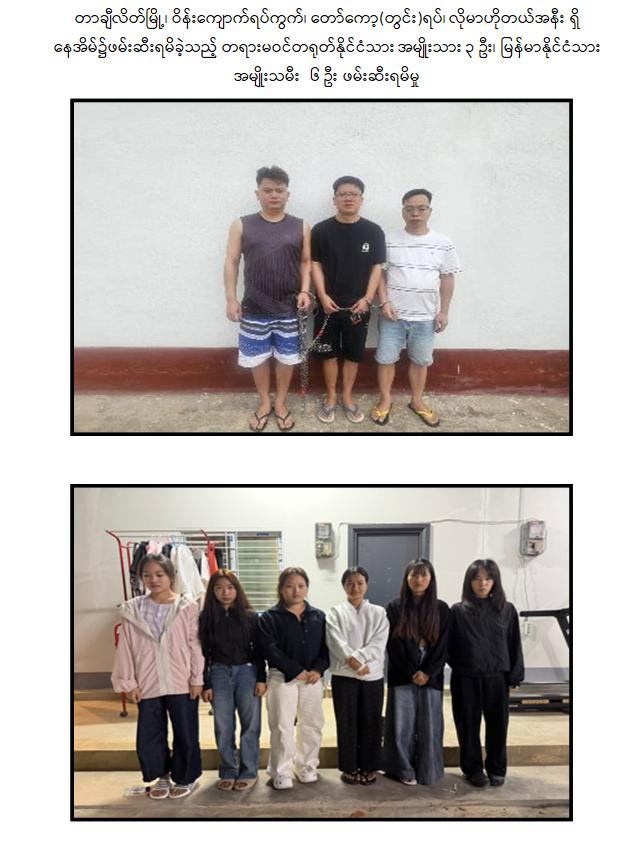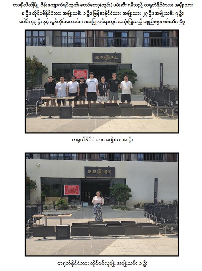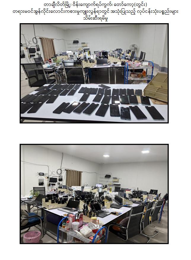 ထိုသို့ ဆောင်ရွက်လျက်ရှိရာ ရှမ်းပြည်နယ်(အရှေ့ပိုင်း)၊တာချီလိတ်မြို့နယ် အတွင်း၌ အွန်လိုင်းလိမ်လည်လောင်း ကစားမှုလုပ်ငန်းများ လုပ်ဆောင်နေကြောင်း သတင်းအရ လုံခြုံရေးတပ်ဖွဲ့ဝင်များပါဝင်သော ပူးပေါင်းအဖွဲ့က သွားရောက်စစ်ဆေးရာ ယနေ့ နေ့လယ် ၁၁ နာရီ ၅၀ မိနစ်ခန့်တွင် တာချီလိတ်မြို့ ၊ ဝိန်းကျောက်ရပ်ကွက်၊ တော်ကော့(တွင်း)ရပ်၊ လိုမာဟိုတယ်အနီး၌ အွန်လိုင်းလိမ်လည် လောင်းကစားမှု လုပ်ငန်းများ လုပ်ကိုင်နေသည့် တရုတ်နိုင်ငံသား အမျိုးသား ၃ ဦး၊ မြန်မာနိုင်ငံသား အမျိုးသမီး ၆ ဦးတို့ကို အွန်လိုင်းလိမ်လည်လောင်းကစားမှုလုပ်ငန်းများ လုပ်ကိုင်ရာတွင် အသုံးပြုသည့် All In One Computer ၃ လုံး၊ Laptop ၁၃ လုံး၊ ဖုန်းမျိုးစုံ ၃၂၀ လုံး၊ Tablet မျိုးစုံ ၁၀၈ လုံး၊ Printer ၁ လုံး၊ Wifi စက် ၆ လုံးနှင့် ဆက်စပ်ပစ္စည်းများနှင့်အတူ ဖမ်းဆီးထိန်းသိမ်းရမိခဲ့သည်။