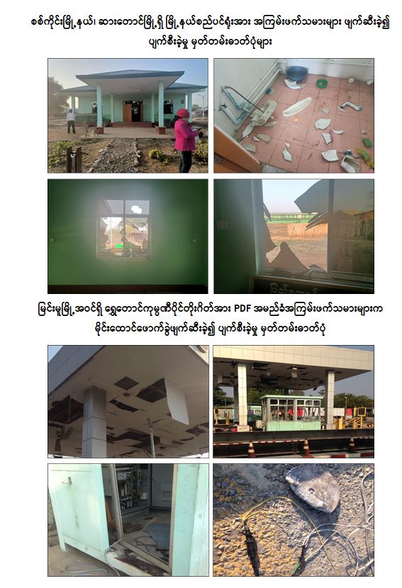 စစ်ကိုင်းတိုင်းဒေသကြီး၊ စစ်ကိုင်းမြို့နယ်၊ ဆားတောင်မြို့ရှိ မြို့စည်ပင်ရုံးနှင့် မြင်းမူမြို့ အဝင်ရှိ ရွှေတောင်ကုမ္ပဏီပိုင်တိုးဂိတ်အား PDF အမည်ခံအကြမ်းဖက်သမားများက ဖောက်ခွဲ ဖျက်ဆီးခြင်းများ ပြုလုပ်ခဲ့ကြောင်း သိရသည်။