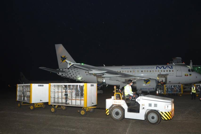 အဆိုပါ မြန်မာအပြည်ပြည်ဆိုင်ရာလေကြောင်းလိုင်း(MAI)လေယာဉ်ဖြင့် ရောက်ရှိလာသော COVIDSHIELD ကိုဗစ်- ၁၉ ကာကွယ်ဆေးများကို ရန်ကုန်တိုင်းဒေသကြီး၊ ဒဂုံမြို့နယ် မြို့မကျောင်းလမ်းရှိ နယ်မြေခံ ဆေးသိုလှောင်ရေးတပ်မှ တာဝန်ရှိသူများက လေဆိပ်တွင် လွှဲပြောင်းလက်ခံ ရယူ သည်။