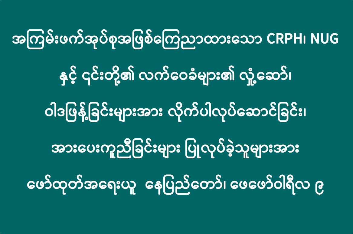 ထိုကဲ့သို့ CRPH၊ NUG နှင့် ယင်းတို့၏ လက်အောက်ခံအဖွဲ့အစည်းများ၊ ယင်းတို့နှင့် ဆက်နွှယ်နေသော အဖွဲ့အစည်းများ၊ လူပုဂ္ဂိုလ်များသည် နိုင်ငံတော်တည်ငြိမ်အေးချမ်းရေးကို ပျက်ပြားစေရန်နှင့် အစိုးရယန္တရားများ ပျက်ပြားစေရန် ရည်ရွယ်လျက် လှုံ့ဆော်ခြင်း၊ ဝါဒဖြန့်ခြင်းများ ပြုလုပ်ခဲ့မှုအပေါ် အားပေးကူညီခြင်းပြုလုပ်ခဲ့သူများအား ဥပဒေနှင့်အညီ ထိရောက်စွာ အရေးယူ သွားမည်ဖြစ်ကြောင်းနှင့် ထိုသို့လှုံ့ဆော်သူ၊ ဝါဒဖြန့်သူများအား ဆက်လက်ဖော်ထုတ်အရေးယူသွား မည်ဖြစ်ကြောင်း မိဘပြည်သူများ သိရှိနိုင်ရေးအသိပေးသတင်းထုတ်ပြန်အပ်ပါသည်။